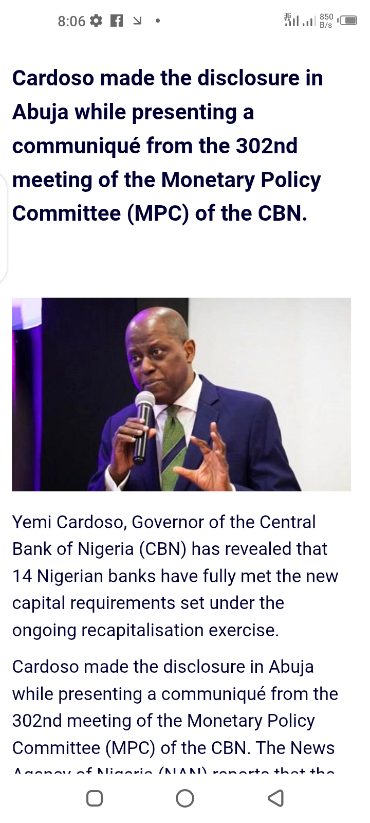 Menu 14 Banks Have Met New Capital Requirement – CBN Governor Yemi Cardoso Posted by Thandiubani on Wed 24th Sep, 2025 – tori.ng Share this news: Discover more Nigerian travel guide Financial news subscription World news summaries Political commentary Tech accessories store News aggregation service Weird news compilation Technology gadget reviews Celebrity gossip magazine Technology news updates Cardoso made the disclosure in Abuja while presenting a communiqué from the 302nd meeting of the Monetary Policy Committee (MPC) of the CBN. Yemi Cardoso, Governor of the Central Bank of Nigeria (CBN) has revealed that 14 Nigerian banks have fully met the new capital requirements set under the ongoing recapitalisation exercise. Cardoso made the disclosure in Abuja while presenting a communiqué from the 302nd meeting of the Monetary Policy Committee (MPC) of the CBN. The News Agency of Nigeria (NAN) reports that the recapitalisation policy introduced by the apex bank establishes new minimum capital bases for banks, depending on their licence category. The current exercise marks the first major recapitalisation of Nigeria’s banking sector since 2004, when the CBN raised the minimum capital requirement for all banks from ₦2 billion to ₦25 billion. That policy triggered a wave of mergers and acquisitions that reduced the number of banks from 89 to 25, reshaping the financial sector. Under the new framework, commercial banks with international authorisation must now hold a minimum capital of ₦500 billion. Those with national authorisation require ₦200 billion, while regional commercial banks are expected to meet ₦50 billion. Merchant banks must also maintain ₦50 billion, non-interest banks with national licences require ₦20 billion, and those with regional licences ₦10 billion. Cardoso said the MPC commended the “significant progress” achieved so far, noting that 14 banks have already complied fully with the recapitalisation directive. “They, therefore, urged the CBN to continue the implementation of policies and initiatives that would ensure the successful completion of the ongoing recapitalisation exercise,” he stated. He also highlighted that the MPC acknowledged the successful termination of forbearance measures and waivers on single obligor limits, which had been introduced during times of stress in the financial sector. Their removal, he explained, would enhance transparency, risk management, and long-term stability within the banking system. “The MPC reassured the public that the impact of the removal of forbearance is transitory and does not pose any threat to the soundness and stability of the banking system, price, and other domestic developments,” Cardoso said. Alongside the recapitalisation update, Cardoso announced that the MPC had decided to reduce the Monetary Policy Rate (MPR) by 50 basis points, from 27.50 per cent to 27 per cent. The committee also adjusted the standing facilities corridor around the MPR to +250/-250 basis points and lowered the Cash Reserve Ratio (CRR) for commercial banks from 50 per cent to 45 per cent. The CRR for merchant banks remains at 16 per cent, while the Liquidity Ratio is unchanged at 30 per cent. In a further move to manage liquidity, the MPC introduced a 75 per cent CRR on non-TSA public sector deposits. Cardoso said these measures were informed by a sustained decline in inflation over the past five months, projections of further easing for the rest of 2025, and the broader need to balance price stability with economic recovery. Share this news: Recent News Popular Fashion Designer, Deborah Okwori K!lled By Her Boyfriend Buried Amid Tears in Benue Published on Wed 24th Sep, 2025 Court Allegedly Orders Kizz Daniel’s Personal And Business Accounts to be Frozen Published on Wed 24th Sep, 2025 Iyabo Ojo Reacts As Priscilla, Baby Receive Royal-Like Reception In Tanzania Published on Wed 24th Sep, 2025 President Tinubu Confers Posthumous National Honours On Four “Ogoni Heroes” Published on Wed 24th Sep, 2025 14 Banks Have Met New Capital Requirement – CBN Governor Yemi Cardoso Published on Wed 24th Sep, 2025 Nigerians Collecting Naira With This New AI App World of Finance | SponsoredLearn More New AI Giving Wealth to People in Nigeria World of Finance | SponsoredLearn More New AI Money Making System Is Taking Over Nigeria AI News | SponsoredLearn More With AI: Invest ₦450,000, Earn Up To ₦523,688/h In Nigeria AI News | SponsoredLearn More New AI Giving Wealth To People In Nigeria World of Finance | SponsoredLearn More With AI: Invest ₦450,000, Earn Up To ₦523,688/h In Nigeria AI News | SponsoredLearn More Erection Will Be Like At 19! Take This 15 Minutes Before Bed! Xenoprost Active | Sponsored Feel Young Again! Prostate Problems Gone In 3 Days! Proman | Sponsored A New Way To Get Rid Of Diabetes GlucoPro | Sponsored PROMOTED CONTENT Proman Erection Will Be Like At 19! Take This 15 Minutes Before Bed Cardizoom The Worst Enemy Of Hypertension. Read This Before It’s Removed Xenoprost Do This Every Night And Your Prostate Will Be Restored In 5 Days! Xenoprost Active Natural Yet Very Effective! Provides Immediate Results Idealmedia I Don’t Have Much Time Left, No One Will See My Body! Proman Your Prostate Will Be Restored In 3 Days! Do This Every Night! GlucoPro Diabetes Is Not From Sweets! Meet The Main Enemy Of Diabetes Travels Infohubz 9 Places To Find Single Divorced Canada Citizen To Date Or Marry Volmix Joints And Back In 1 Month, No Doctors, Do It At Home! Latest News I Don’t Hate Ronaldo, But Messi Is A Better Player – Wayne Rooney Says Published on Wed 24th Sep, 2025 Man Apologises For Promoting South African Pastor’s Failed Rapture Prophecy As Followers Left Stranded Published on Wed 24th Sep, 2025 Police Uncover ₦4.8bn Theft At Kainji Power Plant, Arrest 12 Published on Wed 24th Sep, 2025 Gospel Singer, Victor Thompson And Wife Expecting First Child After Nearly 5 Years Of Marriage Publis