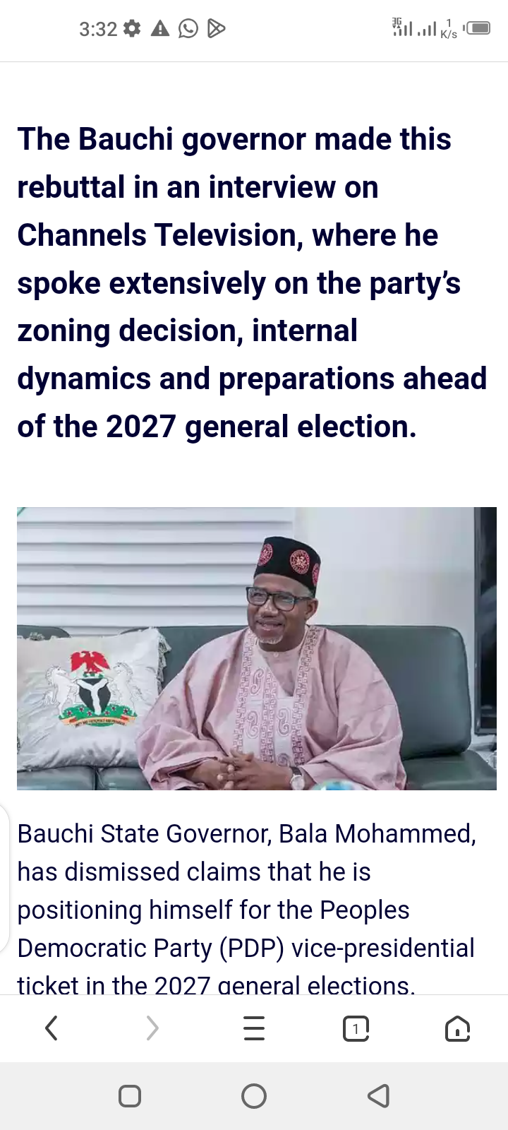 2027: I’m Not Plotting For VP slot – Bauchi Governor, Bala Mohammed Posted by Samuel on Fri 29th Aug, 2025 – tori.ng Share this news:      The Bauchi governor made this rebuttal in an interview on Channels Television, where he spoke extensively on the party’s zoning decision, internal dynamics and preparations ahead of the 2027 general election.  Bauchi State Governor, Bala Mohammed, has dismissed claims that he is positioning himself for the Peoples Democratic Party (PDP) vice-presidential ticket in the 2027 general elections. The Bauchi governor made this rebuttal in an interview on Channels Television, where he spoke extensively on the party’s zoning decision, internal dynamics and preparations ahead of the 2027 general election. “I am not withdrawing because I want to prepare myself for the vice presidency. Of course, if it is within the consensus of our party leaders and the presidential candidate to choose me. “I am ready. But certainly, if I am not given it, I will give my maximum support to whoever emerges,” Mohammed said. Speaking on reports suggesting that the PDP was working on a joint ticket featuring Oyo State Governor Seyi Makinde as presidential candidate with himself as running mate, the Chairman of the Peoples Democratic Party, PDP, Governors’ Forum said the speculations were unfounded. “I and Seyi have never discussed the issue of pairing. What we have mentioned is the issue of taking over power by the grace of God so that we can give Nigerians the opportunity of good governance in 2027 and beyond,” he stated.