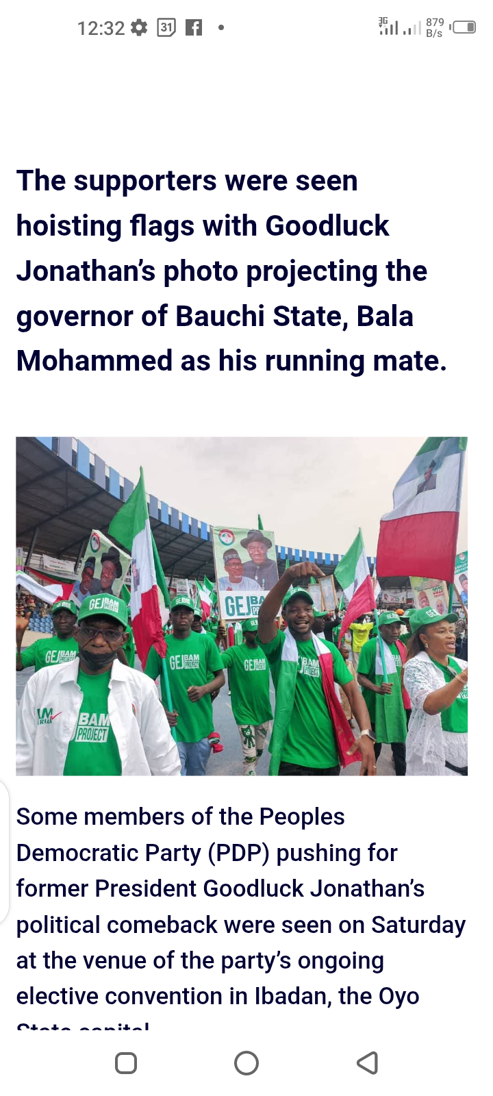 Menu 2027: Jonathan’s Supporters Storm PDP Convention, Projects Bala Mohammed As Vice (Photos) Posted by Samuel on Sat 15th Nov, 2025 – tori.ng Share this news: The supporters were seen hoisting flags with Goodluck Jonathan’s photo projecting the governor of Bauchi State, Bala Mohammed as his running mate. Some members of the Peoples Democratic Party (PDP) pushing for former President Goodluck Jonathan’s political comeback were seen on Saturday at the venue of the party’s ongoing elective convention in Ibadan, the Oyo State capital. The supporters were seen hoisting flags with Goodluck Jonathan’s photo projecting the governor of Bauchi State, Bala Mohammed as his running mate. There has been speculation about Jonathan’s possible comeback to run for the 2027 presidential election. Although the former president has been mum on the matter, his associates confirmed his alleged readiness to contest the much anticipated election. The Oyo State Governor, Seyi Makinde’s posters were sighted at the convention venue on Friday. Discover more Sporting event tickets Tech gadgets and accessories Cloud mining services Legal consultation services Politics News Entertainment streaming services Cryptocurrency trading platforms Lifestyle Articles Relationship counseling services Health and wellness products Share this news: Discover more Weird News Sporting event tickets Sports Updates News Subscription Service Romance Advice World News Health Information Nigerian cultural products Security system installations Political science books Recent News 2027: Jonathan’s Supporters Storm PDP Convention, Projects Bala Mohammed As Vice (Photos) Published on Sat 15th Nov, 2025 It Was Shocking And Terrifying – Actress Omotola Jalade Shares Experience Of Life-threatening Surgery Published on Sat 15th Nov, 2025 Obiano’s De@th Rumour Is Wicked, Irresponsible – Governor Soludo Published on Sat 15th Nov, 2025 I Won’t Go Broke Even If I Stop Doing Music Today – Spyro Boasts (Video) Published on Sat 15th Nov, 2025 How Two Nigerians Were Nabbed, Jailed For Using Forged Documents To Obtain Ghana Card Published on Fri 14th Nov, 2025 Latest News 2027: Jonathan’s Supporters Storm PDP Convention, Projects Bala Mohammed As Vice (Photos) Published on Sat 15th Nov, 2025 How Living Abroad Humbled Me – Veteran Actress, Omotola Jalade-Ekeinde Opens Up Published on Sat 15th Nov, 2025 ISWAP Terrorists Ambush Army Convoy, Reportedly Abduct Commander, K!ll Soldiers Published on Sat 15th Nov, 2025 It Was Shocking And Terrifying – Actress Omotola Jalade Shares Experience Of Life-threatening Surgery Published on Sat 15th Nov, 2025 EFCC Moves To Probe Man Seen Spraying Naira Notes On ‘Thanksgiving Cow’ Inside Church In Delta (Video) Published on Sat 15th Nov, 2025 Olamide Has More Impact On Nigerian Music Industry Than Don Jazzy – Producer Samklef Says Published on Sat 15th Nov, 2025 Obiano’s De@th Rumour Is Wicked, Irresponsible – Governor Soludo Published on Sat 15th Nov, 2025 Olamide Reacts To Backlash Over His Declaration Of Wizkid As Greatest Afrobeats Artist After Fela Published on Sat 15th Nov, 2025 God’s Judgment Awaits Sheikh Gumi For Claiming We Buried Empty Caskets – Rev. Dachomo Blows Hot (Video) Published on Sat 15th Nov, 2025 I Won’t Go Broke Even If I Stop Doing Music Today – Spyro Boasts (Video) Published on Sat 15th Nov, 2025 S*xual Allegations: Police Urged To Probe Suspended Paystack Co-Founder, Ezra Olubi Published on Sat 15th Nov, 2025 India Deports Nigerian Man Over Visa Violation, Drug Peddling Published on Sat 15th Nov, 2025 Face Of Ex-Banker Arraigned By EFCC For Alleged Criminal Diversion Of Customer’s $510,000 (Photo) Published on Sat 15th Nov, 2025 I Received The Beating Of My Life Because I Nursed His Injured Brother – Nigerian Lady Reveals Domestic Abuse She Faced In Her Marriage Published on Sat 15th Nov, 2025 Blog Post Of Paystack Co-Founder Ezra Olubi Talking About Being Bis*xual And Wanting To Have S3x With A Male Co-Worker Emerges Published on Sat 15th Nov, 2025 0 1 2 Older » Popular News Beautiful Photos Of Dwarf And His Tall Bride During Their Traditional Wedding In Delta Go Viral Online Get Information on Any Registered Vehicle by Just Visiting this Website Created by Lagos State Government Couple’s Wedding Photos Causes Serious Commotion Online as Chubby Man Marries Slim Woman (Photos) Ikebe Super! See the Instagram Model Claiming to Have the ‘Biggest Butt’ on Social Media (Photos) Want to Conceive Twin Babies? These are the Best S*x Positions to Help You Achieve Your Aim Today Voodoo in Action: Watch How African Juju Priests Publicly Beheaded a Man and Brought Him Back to Life (Photos) Want to Swim in Love? 25 Romantic and Sweet Names to Call Your Man This is Why Every Bride Wears White on Their Wedding Day Only in Naija: See Passengers Climbing an Airplane with a Ladder in Nigerian Airport (Photos) Read the Touching Humble Background of Golden Eaglets’ Star Striker, Victor Osimhen Sports 2026 WCQ Playoffs: Nigeria To Face DR Congo In African Playoff Final 2026 WCQ Playoffs: Chelle Drops Lookman, Troost-Ekong, Starts Osimhen vs Gabon Why Super Eagles Can’t Afford To Miss Out On Another World Cup – Iwobi 2026 WCQ Playoff: ‘A Real Shame’ – Troy Deeney Slams Nigeria Over Bonus Issues Super Eagles Only Demanded For Outstanding Allowances — Captain Ekong Confirms Training Boycott Tech Facebook, Instagram Users to Pay £2.99 For Monthly Subscription Apple Launches iPhone 17 Pro XRP is expected to break through $5.5 in the second half of the year – BTC Miner cloud mining helps you earn steady XRP returns The 2025 wealth vane points to smart cloud mining. Choosing the right way will allow you to earn up to $100 a day, or $100,000 a day Player Verification Technologies Expanding across Africa World Man Uses A Woman’s Placenta To Re-Build His Eye And Save His Sight After Acid Attack US President-elect, Donald Trump To Take More Than 20