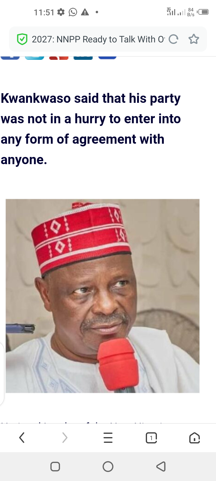 2027: NNPP Ready to Talk With Other Parties, Coalition – Kwankwaso Posted by Thandiubani on Fri 29th Aug, 2025 – tori.ng Share this news:      Kwankwaso said that his party was not in a hurry to enter into any form of agreement with anyone.  National Leader of the New Nigerian Peoples Party, NNPP, Rabiu Kwankwaso has opened up that the party is ready to talk with other parties or coalitions ahead of the 2027 election. He added that the party is not desperate to form an alliance with any party. The former Kano State Governor, who spoke at the NNPP National Executive Committee, NEC, meeting in Abuja on Wednesday, said that at the moment, there is no discussion ongoing, adding that leaders and members of the party would be carried along for a collective decision to be reached. Recall that during the NEC meeting on Thursday, the party also dissolved its executives in some states and appointed new leaders pending its convention to elect substantive leaders in those states. “There was fake news recently, but at this meeting, we are going to take critical decisions, and so many people were excited to come and hear what that information is. “Now actually, it wasn’t intended to say anything here, because in that direction, there is very little or nothing to say. I think that was not the intention of the meeting. We are ready to do whatever it takes, because we are not in a hurry. “Members, the leadership and all of us are not in a hurry. We believe that we have something to offer at the end of the day, at the highest leadership level in this country. “But we want to do it the way it should be done. We are ready to talk to anybody. As far as we are concerned, we are doing our business. Now we are ready to go. In fact, we are going. We are moving. But I can say here comfortably that we are politicians. We are ready to talk to anybody. “If you want us to work together, okay, fine, let’s talk. We are ready to talk to anybody who wants us to work together for 2027 but the fact remains, this party is not my party, not the chairman’s party. It is not our party, only those of us here. It is for Nigerians. “Everybody’s free to come in. And on the other hand, even though you don’t want anybody to leave, if somebody has to leave, what else can we do? “If there is anything, if there is any negotiation, it will be collective, and not only for the negotiators, but for the entire members of this family of NNPP,” he stated.