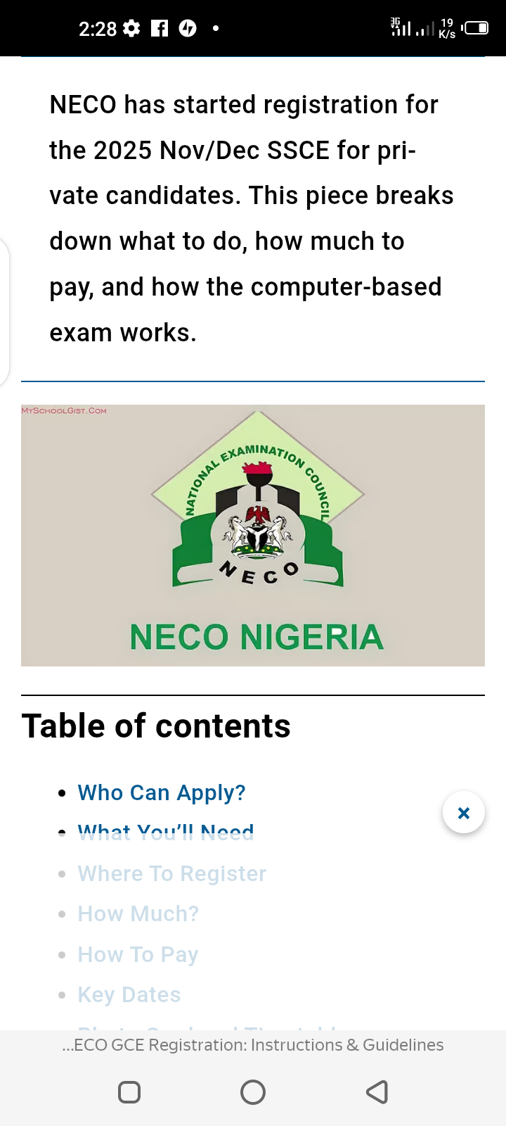 Skip to main content× MSG MySchoolGist Say Goodbye to JAMB, Enter 200-Level Directly! Gain University Admission via JUPEB/IJMB. Enjoy Low Fees! Call 08033006849 Now! 2025 NECO GCE Registration: Instructions & Guidelines By Olusegun Fapohunda Updated on Jul 14, 2025 NECO has started registration for the 2025 Nov/Dec SSCE for private candidates. This piece breaks down what to do, how much to pay, and how the computer-based exam works. Table of contents Who Can Apply? What You’ll Need Where To Register How Much? How To Pay Key Dates Photo Card and Timetable Special Needs Candidates Choose Your Centre Subjects Offered About the Exam Dos and Don’ts Final Advice Who Can Apply? The 2025 NECO Nov/Dec SSCE External is for candidates who are not in regular school. That means if you’re a private candidate hoping to get your Senior School Certificate, this is your chance. You can register either online or offline. The exam will be fully computer-based and will cover 16 subjects. Discover more educational MySchoolGist Myschoolgist education Education Nursing School Guide Study Abroad Consultation Exam Preparation Resources Polytechnic Admission Guide JAMB CBT App What You’ll Need Before registration, make sure you have: A valid National Identification Number (NIN) A passport photo not older than 6 months, on a white background A fingerprint scanner at your café, because biometric capture is required Your fingerprints will be used to verify your identity during the exam. If they don’t match, you could be flagged as an impersonator. No jokes. Where To Register Go to the official NECO registration site to begin. You’ll be asked to create an account using your email or phone number. Once your account is ready, you can: Buy your registration quota Head to a trusted café for biometric data and passport upload How Much? ₦30,000 covers registration, a waterproof certificate folder, and a maths table Extra charges for stamp duty and Remita may apply If you register late (19–25 November), you’ll pay ₦5,000 extra Walk-in registration is ₦43,000 How To Pay After creating your account, pay through any of these: ATM card Internet banking USSD Wallet At a bank branch Make sure your payment goes into the NECO TSA account. Key Dates Registration opens: 7 July 2025 Regular registration closes: 18 November 2025 (midnight) Late registration: 19–25 November 2025 Exam runs: 26 November to 13 December 2025 Photo Card and Timetable After registering: Print out your timetable Collect one clear photo card with your passport on it Your referee must sign and stamp this card Who qualifies as a referee? Principal of a recognised school Cleric (Pastor or Imam) Military officer or police (Captain and above) Civil servant (GL 14 and above) Lawyer with 10+ years of experience You no longer need to submit this card to any NECO state office. Special Needs Candidates Register like everyone else. Just tick the appropriate box online to indicate your needs. Choose Your Centre You’ll be assigned a centre based on the neighbourhood you choose during registration. You can’t change your centre after uploading your form, so pick carefully. Subjects Offered Agricultural Science Biology Chemistry Civic Education Christian Religious Studies Commerce Economics English Language Financial Accounting General Mathematics Geography Government Islamic Studies Literature in English Marketing Physics About the Exam This is a Computer-Based Exam (CBE) A mock exam will be arranged before the main one (you’ll be told when) You can edit your details only once before the exam starts You can only change one name or passport, not both Your photo and NIN will appear on your certificate Results for double registration will be cancelled Dos and Don’ts Don’t arrive late. Get to the venue 30 minutes early No phones or gadgets allowed Come in plain clothes, no uniforms Multiple registrations are not allowed Read the rules and syllabus before the exam Avoid shady cafés. If you make a mistake, NECO won’t fix it for you Final Advice Use a reliable café. Double-check every detail before hitting upload. If unsure, ask someone who knows the ropes. To start your registration, visit the NECO External Portal. On a similar note… National Examinations Council (NECO) GCE Timetable 2025 NECO GCE Registration Fee National Examinations Council (NECO) Exam Timetable 2025 Malpractice: No going back on CBT for WAEC, NECO — Nigerian Government National Examination Council (NECO) 2025 SSCE Internal Registration Guidelines and Instructions National Examinations Council (NECO) 2025 BECE Timetable for JSS 3 Candidates [Junior WAEC] National Examination Council (NECO) BECE Registration Guidelines and Instructions 2025 National Examination Council (NECO) GCE Results Statistics 2024 Search the MySchoolGist siteSearch Tagged: neco.gov.ng | National Examinations Council : NECO JAMB Not Required, Proceed Directly to 200-Level! Secure Your Spot in Any Nigerian University. Affordable Fees! Call +238033006849 Right Away! Meet The Author This post is authored by Olusegun Fapohunda, the founder and editor of MySchoolGist. Boasting over a decade of expertise in the education sector, Olusegun offers current insights into educational trends, career opportunities, and the latest news. Connect with him on X (Formerly Twitter) for more updates. Share This Post: If this post helped you, share it with others! Use the buttons below to spread the word! WHATSAPP TWEET SHARE Home JAMB CBT App (Android & iOS) NECO & WAEC CBT App (Android & iOS) JAMB CBT Software Scholarships About Disclaimer Privacy Policy Copyright © 2012 – 2025 MySchoolGist MySchoolGist Web Services is a registered publisher and marketing solutions provider in Nigeria. It publishes Myschoolgist.com, a leading digital publication that covers the latest educational trends, career opportunities, and current news.