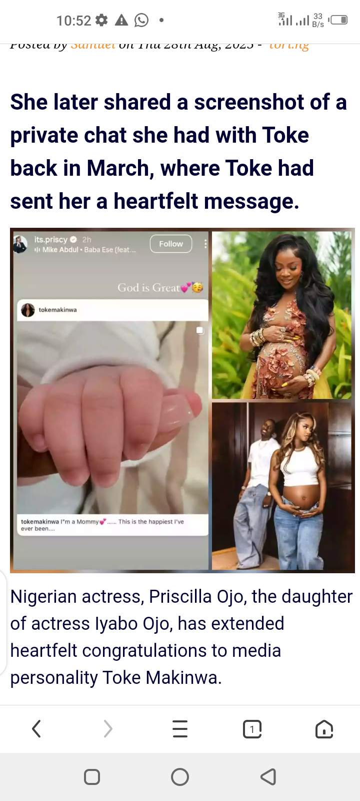 Actress, Priscilla Ojo Congratulate Toke Makinwa On Welcoming Her Daughter; Shares Throwback Chat That Turned Out ‘Prophetic’ Posted by Samuel on Thu 28th Aug, 2025 – tori.ng She later shared a screenshot of a private chat she had with Toke back in March, where Toke had sent her a heartfelt message.  Nigerian actress, Priscilla Ojo, the daughter of actress Iyabo Ojo, has extended heartfelt congratulations to media personality Toke Makinwa. Priscilla first reposted Toke’s announcement on her Instagram story with the caption “God is Great”. She later shared a screenshot of a private chat she had with Toke back in March, where Toke had sent her a heartfelt message. In the message, Toke congratulated her and also told her not to walk in fear, reminding her that God had given her the spirit of power and love. At the time, Priscilla had no idea Toke was also expecting. Sharing the screenshot, Priscilla wrote: “This was just in March and didn’t know she was also expecting 😳💕🙏 View post below..   Popular Stories Mosque Renamed to ‘Mary, Mother of Jesus’ in Dubai (Photo) Nigeria’s King of Money: The Untold Story of Igbo Tycoon, Victor Okafor, the Eze Ego 1 of Ihiala Want to Conceive Twin Babies? These are the Best S*x Positions to Help You Achieve Your Aim Today Can This Bump Be Real? This Pretty Lady’s Pregnant Baby Bump Causes Controversy Online (Photos) Strange: Woman Wedded To The Picture of Her Man (Photos) Copyright © 2025 Tori.ng – All rights reserved Tori.ng is owned and managed by Cyclofoss Technologies Ltd.