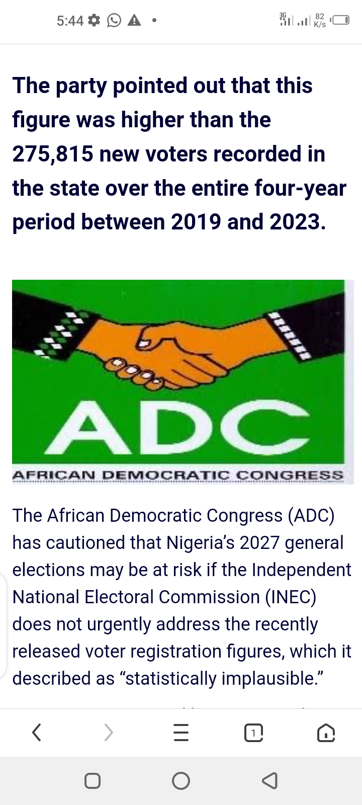 ADC Raises Alarm Over INEC Voter Data, Says ‘2027 Polls In Danger’ Posted by Samuel on Thu 28th Aug, 2025 – tori.ng Share this news:      The party pointed out that this figure was higher than the 275,815 new voters recorded in the state over the entire four-year period between 2019 and 2023.  The African Democratic Congress (ADC) has cautioned that Nigeria’s 2027 general elections may be at risk if the Independent National Electoral Commission (INEC) does not urgently address the recently released voter registration figures, which it described as “statistically implausible.” In a statement signed by its National Publicity Secretary, Mallam Bolaji Abdullahi, the party said the figures from Osun State and the South-West zone defied both historical patterns and demographic realities, raising doubts about the credibility of the electoral process. According to the ADC, INEC’s report showed that Osun State recorded 393,269 pre-registrations in just one week. The party pointed out that this figure was higher than the 275,815 new voters recorded in the state over the entire four-year period between 2019 and 2023. “Even at its peak of political mobilisation in 2022, Osun has never produced more than 823,124 votes cast in a governorship election. Now, by some miracle, nearly 20 percent of all eligible adults in the state have rushed to register. This is not just unusual; it is statistically implausible,” the statement read. The ADC also noted that the South-West zone alone accounted for 848,359 pre-registrations, representing 67 percent of the national total. By comparison, the South-East recorded just 1,998 pre-registrations, while five states: Ebonyi, Imo, Enugu, Abia and Adamawa, recorded a combined total of 4,153. “These fantastic figures suggest either another technical glitch in INEC’s digital registration system, or a more troubling possibility of deliberate manipulation of data to prepare the ground for a sinister agenda in the coming elections. In either case, INEC has explanations to give,” Abdullahi said. Warning that the voter register formed the foundation of elections, the ADC stressed that anomalies in the data could undermine public trust in the democratic process. “We must be clear: the voter register is the foundation of the entire electoral process. If the foundation is compromised, it raises questions about the integrity of the elections. Nigerians still remember the bitter consequences of flawed voter rolls and technical glitches in past elections. Our democracy cannot withstand another one,” the party cautioned. The ADC called on INEC to urgently conduct and publish a forensic audit of the first-week registration data, including a state-by-state breakdown of both physical and online registrations. It also urged the commission to release server logs, bandwidth distribution records, and regional access reports for the registration portal. “We call on all opposition political parties to set aside rivalry and jointly demand clarity from INEC on these glaring anomalies. We also urge election monitoring groups, fact-checking organisations, and legal advocacy bodies to independently interrogate these numbers and press for accountability,” it stated. The party further invited the international community to take early interest in the developments. “We also invite our partners in the international community; the United Nations, the African Union, ECOWAS, and Nigeria’s democratic allies, to take early interest in these developments, as the credibility of the 2027 elections begins with the integrity of the voter register,” it added. The ADC warned that ignoring such red flags could destabilise the country. “Silence in the face of these anomalies would amount to complicity. History has shown that when questions about the voter register are left unanswered, the consequences go beyond politics; they touch on national stability itself. The time to act is now,” the party warned.