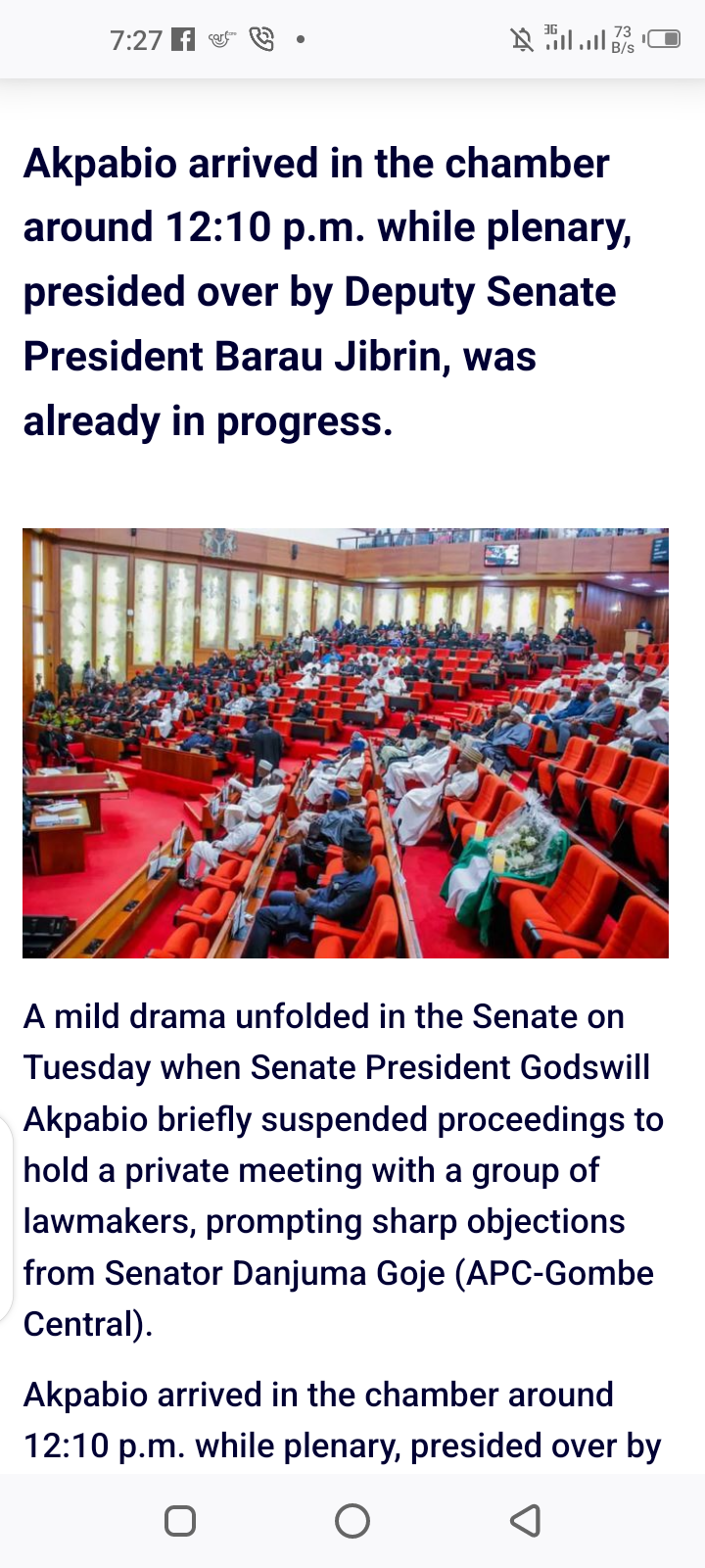 Menu Tori Logo Tori Search Button Drama In Senate As Senator Goje Protests Akpabio’s ‘Halt’ Of Proceedings Posted by Samuel on Tue 02nd Dec, 2025 – tori.ng Share this news: Facebook Twitter Goodle LinkedIn Email Akpabio arrived in the chamber around 12:10 p.m. while plenary, presided over by Deputy Senate President Barau Jibrin, was already in progress. Godswill Akpabio A mild drama unfolded in the Senate on Tuesday when Senate President Godswill Akpabio briefly suspended proceedings to hold a private meeting with a group of lawmakers, prompting sharp objections from Senator Danjuma Goje (APC-Gombe Central). Akpabio arrived in the chamber around 12:10 p.m. while plenary, presided over by Deputy Senate President Barau Jibrin, was already in progress. He smoothly took over as senators considered scheduled bills. Barely ten minutes later, the Senate President summoned the Senate Leader, Opeyemi Bamidele, to his seat for a private consultation. Soon, other senators—including Asuquo Ekpenyong (Cross River South), Adamu Aliero (Kebbi Central), Jimoh Ibrahim (Ondo South), Titus Zam (Benue North-West), and Barau Jibrin gathered around his chair. The discussions, which lasted over 40 minutes, brought the plenary to a halt. Many senators left their seats to chat among themselves, while others engaged in side conversations, leaving the chamber noisy and disorganised. Dissatisfied with the disruption, Goje raised a point of order, warning that prolonged private consultations during an active session violated Senate procedure. He cited Order 55 of the Senate Standing Rules, which prohibits interruptions to ongoing proceedings, insisting that such discussions should be held outside the chamber. “Interaction is not allowed. What is happening now is unparliamentary,” Goje said. “You should have taken this meeting outside. Everything is at a standstill; this is not our actual business. “We should go on recess; when we are ready, we can return and meet you.” Responding, Akpabio explained that he had invited the senators for a brief consultation on an urgent assignment scheduled for 1 p.m. at the Presidential Villa. “Everybody you see here was invited by the chair for a brief discussion in continuation of today’s sitting and in line with the order you’ve just read, whether or not we should proceed in view of a very urgent assignment at the Villa,” he said. Akpabio then asked Goje to approach the chair and join the discussion, an invitation the former governor declined. “I don’t want to be part of it,” Goje replied. Share on WhatsApp Share on Telegram Share this news: Facebook Twitter Goodle LinkedIn Email Recent News Nollywood Actor, Taye Arimoro Challenges Guilds’ Suspension, Threatens N1 Billion Suit Published on Tue 02nd Dec, 2025 BREAKING: Tinubu In Closed-Door Meeting With Security Chiefs Published on Tue 02nd Dec, 2025 NYSC Announces Date For Batch C Stream II Passing-Out Published on Tue 02nd Dec, 2025 BREAKING: Adebayo Adedamola Wins Osun PDP Governorship Primary Published on Tue 02nd Dec, 2025 Heavy Security As PDP Begins Osun Guber Primary Published on Tue 02nd Dec, 2025 Latest News Nollywood Actor, Taye Arimoro Challenges Guilds’ Suspension, Threatens N1 Billion Suit Published on Tue 02nd Dec, 2025 Drama In Senate As Senator Goje Protests Akpabio’s ‘Halt’ Of Proceedings Published on Tue 02nd Dec, 2025 AFCON 2025: Eric Chelle Releases Super Eagles’ Provisional Squad (Full List) Published on Tue 02nd Dec, 2025 BREAKING: Tinubu In Closed-Door Meeting With Security Chiefs Published on Tue 02nd Dec, 2025 IPI Blacklists Governor Bago, IGP Egbetokun, Governor Umo, Bago Over Press Freedom Published on Tue 02nd Dec, 2025 Mohbad’s Father Reveals When The Late Singer Will Be Buried (Video) Published on Tue 02nd Dec, 2025 President Tinubu Meets Governor Otti Over Efforts To Secure Nnamdi Kanu’s Release Published on Tue 02nd Dec, 2025 I Was Once Given A Script To Sleep With A Dog – Actress Nkechi Blessing Opens Up On Acting Challenges (Video) Published on Tue 02nd Dec, 2025 NYSC Announces Date For Batch C Stream II Passing-Out Published on Tue 02nd Dec, 2025 BREAKING: Tinubu Nominates Ex-CDS Christopher Musa As Defence Minister Published on Tue 02nd Dec, 2025 Drama As Akwa Ibom Police Arrest Masquerader For Public Disturbance Amid Statewide Ban (Video) Published on Tue 02nd Dec, 2025 Boko Haram Terrorists Storm Borno Security Position, K!ll Immigration Officer, Wound Soldiers Published on Tue 02nd Dec, 2025 Popular Content Creator, Frank Itom Issues Warning To Married Men Hitting On Him via DM Published on Tue 02nd Dec, 2025 BREAKING: Adebayo Adedamola Wins Osun PDP Governorship Primary Published on Tue 02nd Dec, 2025 Annie Macaulay Shares Cryptic Messages As Her Ex-Husband 2Baba And His New Wife Natasha Osawaru Fight Dirty Published on Tue 02nd Dec, 2025 0 1 2 Older » Popular News Racism: Touching Story Of 1st Black Man Who Got Admitted To American University And Forced To Sit Alone Check Out Wierd Traditions Across Africa (Photos) The Shocking Story Of Abortion Doctor Who Kept Foetuses Of 2,400 Babies In His Home And Car Cuteness Overload: Adorable Photo of a Family of 9 with 4 Sets of Identical Twins Melt Hearts Online Why Eating Catfish is Very Dangerous for Your Health – Medical Expert Makes Revelations Must Read: How Does Menopause Affect S*x Drive? Abomination! Wife Catches Husband Having Hot S*x with a Goat in their Home Meet the Beautiful & S*xy Nigerian Girl, Judy Okafor Setting Instagram on Fire (Photos) Read the Touching Humble Background of Golden Eaglets’ Star Striker, Victor Osimhen So Embarrassing! Singer’s Sanitary Pad Falls On The Floor During Live Performance (Photos) Sports AFCON 2025: Eric Chelle Releases Super Eagles’ Provisional Squad (Full List) Former Super Falcons Coach, Randy Waldrum Challenges NFF Over Use Of $960,000 FIFA World Cup Grant (Video) I Don’t Have To Play Against Him – Calvin Bassey Happy Over Osimhen’s