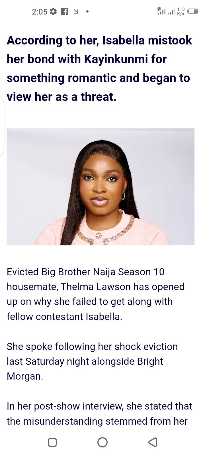 Menu Discover more Technology gadget reviews Celebrity gossip magazine Metro news service Political commentary Health and wellness products Newspaper advertising space Celebrity birthday features Relationship advice book Nigerian travel guide Entertainment news newsletter BBNaija 10: Why I Never Got Along With Isabella – Thelma Lawson Posted by Thandiubani on Fri 26th Sep, 2025 – tori.ng Share this news:           Discover more True crime documentary Weird news compilation Entertainment news alerts World news summaries World news analysis Lifestyle blog subscription Video content creation Entertainment news newsletter Metro news service Financial news subscription According to her, Isabella mistook her bond with Kayinkunmi for something romantic and began to view her as a threat.   Evicted Big Brother Naija Season 10 housemate, Thelma Lawson has opened up on why she failed to get along with fellow contestant Isabella.   She spoke following her shock eviction last Saturday night alongside Bright Morgan.   In her post-show interview, she stated that the misunderstanding stemmed from her closeness with Kayinkunmi, a housemate she already knew before the competition.   According to her, Isabella mistook her bond with Kayinkunmi for something romantic and began to view her as a threat.   “It’s unfortunate that Isabella and I never really became friends. I genuinely looked forward to connecting with her because she is a mother to a 14 year old son. “I wanted to learn life from her perspective. But things changed because Kayinkunmi who is my friend outside the house was also in the game,” Thelma explained.   Thelma stated that the tension worsened after she picked Kayinkunmi as her deputy during her tenure as Head of House.   She added that Isabella’s reaction immediately after her deputy choice signaled the strain in their relationship. “Her reaction that night showed me she had taken it too far. I felt it wasn’t the right moment for a conversation,” she said.   Thelma clarified that she deliberately kept the depth of her pre-existing friendship with Kayinkunmi private, insisting it was unnecessary to announce it to everyone.   “Kayinkunmi is my friend and that was why I chose him as deputy. I didn’t want anyone using us for highlights that’s why I only explained to those who directly asked me. “Unfortunately by the time Isabella realized there was nothing between us, the damage had already been done,” she said.   The reality star concluded that while she had hoped for a genuine friendship with Isabella, the misunderstanding created a rift that was never repaired during their time in the house. Share this news:         Discover more Entertainment news newsletter Political commentary subscription Health and wellness products Relationship advice book Lifestyle product reviews Celebrity birthday features Celebrity gossip magazine Online news subscription Wedding anniversary features Recent News BREAKING: Audu Ogbeh Buried In Otukpa, Benue (Photos) Published on Fri 26th Sep, 2025 Olubadan: Sultan Of Sokoto, Ex-Governors, Others Storm Ibadan For Ladoja’s Coronation (Photos) Published on Fri 26th Sep, 2025 My Biggest Regret As Governor – Akwa Ibom Governor, Umo Eno Opens Up Published on Fri 26th Sep, 2025 Bandits Attack Zamfara Mosque, Kill Worshippers Published on Fri 26th Sep, 2025 Release Names of Nigerians Sponsoring Terrorists In The Country – Former Sports Minister Dalung to FG Published on Fri 26th Sep, 2025 PROMOTED CONTENT Slim Weight Of 90 Kg Will Drop To 50 Kg! Take 1 Drop In The Morning Flexibility Everyone Who Suffers From Back Pain Read This Lipocarnit These 2 Vegetables Will Kill Your Belly And Arm Fat Overnight! Volmix Effective Way To Get Rid Of Joint Pain In Just 5 Days! Prosteron Symptoms Of Prostatitis? The Disease Will Disappear After 1 Day Proman 5 Times Stronger Than Viagra! “It Is Sold In Every Pharmacy!” Xenoprost Active Erection Will Be Like At 19! Take This 15 Minutes Before Bed! Proman Do This Every Night And Your Prostate Will Be Restored In 5 Days! Naira AI AI: Invest ₦450,000, Earn Up To ₦523,688/h In Lagos Latest News BREAKING: Audu Ogbeh Buried In Otukpa, Benue (Photos) Published on Fri 26th Sep, 2025 BREAKING: Tinubu Jets Out To Ibadan For Ladoja’s Coronation As Olubadan Published on Fri 26th Sep, 2025 BBNaija 10: Why I Never Got Along With Isabella – Thelma Lawson Published on Fri 26th Sep, 2025 Facebook, Instagram Users to Pay £2.99 For Monthly Subscription Published on Fri 26th Sep, 2025 I Was Shot at 10 Times – Singer Alhaji Popping Recalls Near-Death Experience Published on Fri 26th Sep, 2025 Things To Know About 44th Olubadan Of Ibadanland, Oba Rashidi Ladoja Published on Fri 26th Sep, 2025 Pandemonium As Four People D!e After Mining Site Collapsed In Plateau Published on Fri 26th Sep, 2025 Olubadan: Sultan Of Sokoto, Ex-Governors, Others Storm Ibadan For Ladoja’s Coronation (Photos) Published on Fri 26th Sep, 2025 Why Nnamdi Kanu Should Not Be Transferred To National Hospital – Nigerian Govt Published on Fri 26th Sep, 2025 I Can’t Support Tinubu In The Dark – Governor Eno Explains Defection To APC Published on Fri 26th Sep, 2025 We Live In Constant Fear – Delta State Residents Cry Out, Say Kidnappers Have Taken Over Diffri, NDDC Roads Published on Fri 26th Sep, 2025 BBNaija Star, Ocee Mbadiwe, Weds Chisara, The Mother Of His Daughter (Video) Published on Fri 26th Sep, 2025 BREAKING: Court Dismisses Nnamdi Kanu’s ‘No Case Submission’ Published on Fri 26th Sep, 2025 Obasanjo Militarized Politics, Atiku Confirmed He Wanted Third Term – Osinbajo’s Ex-Aide Published on Fri 26th Sep, 2025 An Occultic Group In My Village Is Behind My Alleged Viral N@ked Video – Bishop Ndubueze Claims Published on Fri 26th Sep, 2025   0    1    2    Older »   Popular News 36-year-old World’s Most Fertile Mother Who Gave Birth To 44 Children Has Finally Been Stopped From Havi