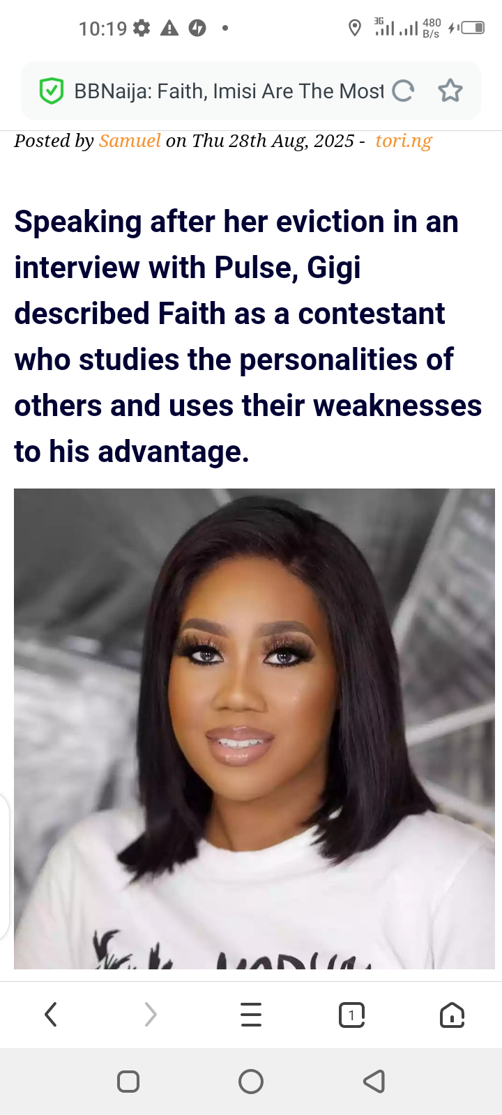 BBNaija: Faith, Imisi Are The Most Manipulative Housemates – Gigi Jasmine Says Posted by Samuel on Thu 28th Aug, 2025 – tori.ng Speaking after her eviction in an interview with Pulse, Gigi described Faith as a contestant who studies the personalities of others and uses their weaknesses to his advantage.  Gigi Jasmine, the former Big Brother Naija Season 10 housemate, has reflected on her experience in the house. She pointed at fellow contestants Faith and Imisi as the most calculated in their approach to the game, Naija News reports. Speaking after her eviction in an interview with Pulse, Gigi described Faith as a contestant who studies the personalities of others and uses their weaknesses to his advantage. She said that his ability to trigger reactions from housemates gave him an edge in the competition. The reality TV star also accused Imisi of putting up a fake character in the house, saying that his actions often appeared staged. According to her, she displayed intelligence and strategy that made her stand out among the contestants. She said: “Faith and Imisi are the most manipulative. One thing about Faith, Mandem is smart. Mandem is super duper smart, and I give it to him. “Good on you, mate. But not only is he manipulative, he’s calculated. “He knows how to break down everyone’s personality, and he knows that one thing that will trigger you, and he’ll be like, duh-duh-duh-duh-duh, and then you’re like, what did you say? “Like, it’s frustrating, but he’s good at that.” Gigi also accused fellow housemate Imisi of faking behaviour in the house. She said: “I know you’re very intelligent, because we’ve had conversations, and you’ve been able to mimic my accent and understand everything. “It’s not every single time that Biggie calls Imisi, you’re like, yay! No, I know what you’re doing. I clocked it. I clocked it. “Imisi has the best strategy yet, and all of her fans that hate me. Mwah. Love you too, baby.” Despite her criticism, she admitted that Imisi had one of the strongest game plans in the house. The former housemate further reflected on her personal low moment, revealing that getting involved in a relationship during the show was her biggest regret, as she felt it made her appear naïve. Popular Stories Only Three Nigerian Universities Ranked Among 1,000 Best Universities In the World (See List) I Got Pregnant At 16, Became a Millionaire At 17 – Popular Nigerian Actress Reveals Meet the Nigerian Man with 97 wives and Over 180 Children (Photo) Death on The Pitch: 10 Top Footballers Who Died Painful Deaths While Playing on the Field (Video) My Semen is a Sacred Holy Milk – Pastor Makes Members Suck His Manhood in Church Copyright © 2025 Tori.ng – All rights reserved Tori.ng is owned and managed by Cyclofoss Technologies Ltd.