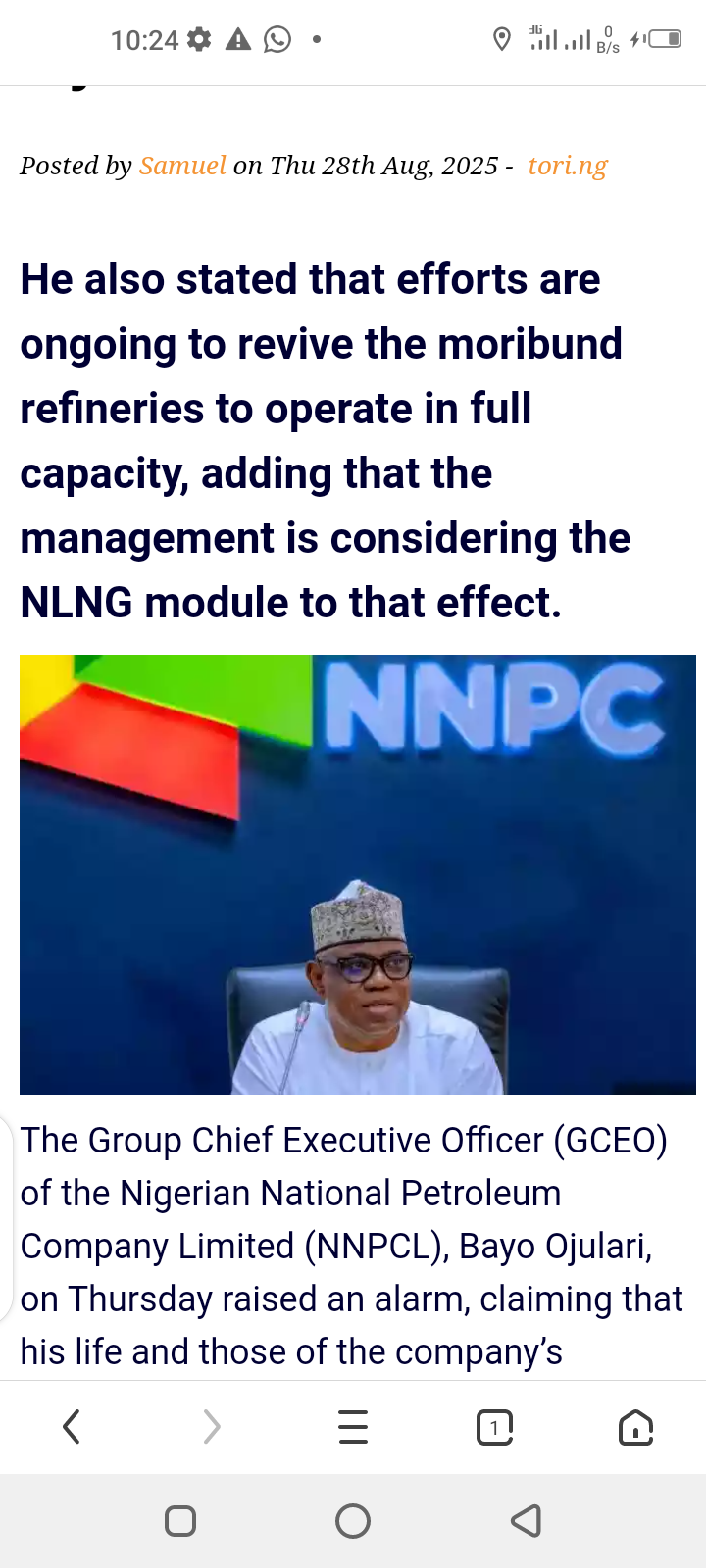 BREAKING: I’m Under Attack, Some People Are Plotting To Unseat Me – NNPCL GCEO, Ojulari Cries Out Posted by Samuel on Thu 28th Aug, 2025 – tori.ng He also stated that efforts are ongoing to revive the moribund refineries to operate in full capacity, adding that the management is considering the NLNG module to that effect.  The Group Chief Executive Officer (GCEO) of the Nigerian National Petroleum Company Limited (NNPCL), Bayo Ojulari, on Thursday raised an alarm, claiming that his life and those of the company’s management staff are under serious threat. Ojulari said his offence is the reforms he has introduced in the oil and gas sector in line with the mandate given to him by President Bola Tinubu to turn around the moribund refinery, lamenting that some powerful elements are plotting to remove him from the seat. The NNPCL GCEO raised the alarm when he received the delegation of the Petroleum and Natural Gas Senior Staff Association of Nigeria, PENGASSAN, led by its President, Comrade Festus Osifo, at the company’s headquarters, Abuja. He also stated that efforts are ongoing to revive the moribund refineries to operate in full capacity, adding that the management is considering the NLNG module to that effect. Responding to comments made by the PENGASSAN President on the stability of the NNPCL and stability in the oil sector, he said, despite the threats to his life and the lives of some management staff, he is determined to ensure that the refineries work effectively. He said: “I’m not hiding to anybody. I’m not a politician. “I will have to learn a bit more about politics, but it’s a development plan for me, right? And I’m ready to learn.” Details later… Popular Stories Racism: Touching Story Of 1st Black Man Who Got Admitted To American University And Forced To Sit Alone See The Three Black Musicians Named As Richest Entertainers On The Planet In 2018 We Met in the Club Last Night and This Happened When I Got to His House – Lagos Girl Caution: Unknown Dangers of Drinking Cold Water Rihanna LookAlike Makes Money From Her Looks Copyright © 2025 Tori.ng – All rights reserved Tori.ng is owned and managed by Cyclofoss Technologies Ltd.
