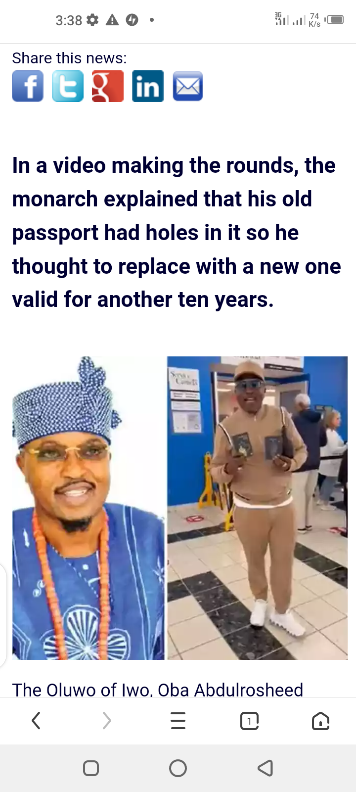 Canada Is The Best Of The Best Country In The World Right Now – Oluwo Of Iwo Declares After Renewing His Passport (Video) Posted by Samuel on Fri 29th Aug, 2025 – tori.ng Share this news:       In a video making the rounds, the monarch explained that his old passport had holes in it so he thought to replace with a new one valid for another ten years.  The Oluwo of Iwo, Oba Abdulrosheed Akanbi, has recounted his experience while renewing his international passport, praising Canada as “the best of the best countries in the world.” In a video making the rounds, the monarch explained that his old passport had holes in it so he thought to replace with a new one valid for another ten years. Speaking with excitement, he said: “There I go. My passport has only expired yet. It will expire next year. But I give it feet because it’s 10 years from here. I give it feet to come and renew my passport. It’s a 24-hour service. “I renew my passport from this old one. And you can see they have to punch holes on that. So I got a new one. Another 10 years has brought a new high of the best country in the world. Nigeria is going to be best too. “But right now, believe me, Canada is the best of the best country in the world. I love Canada. I love it.” Watch video below..