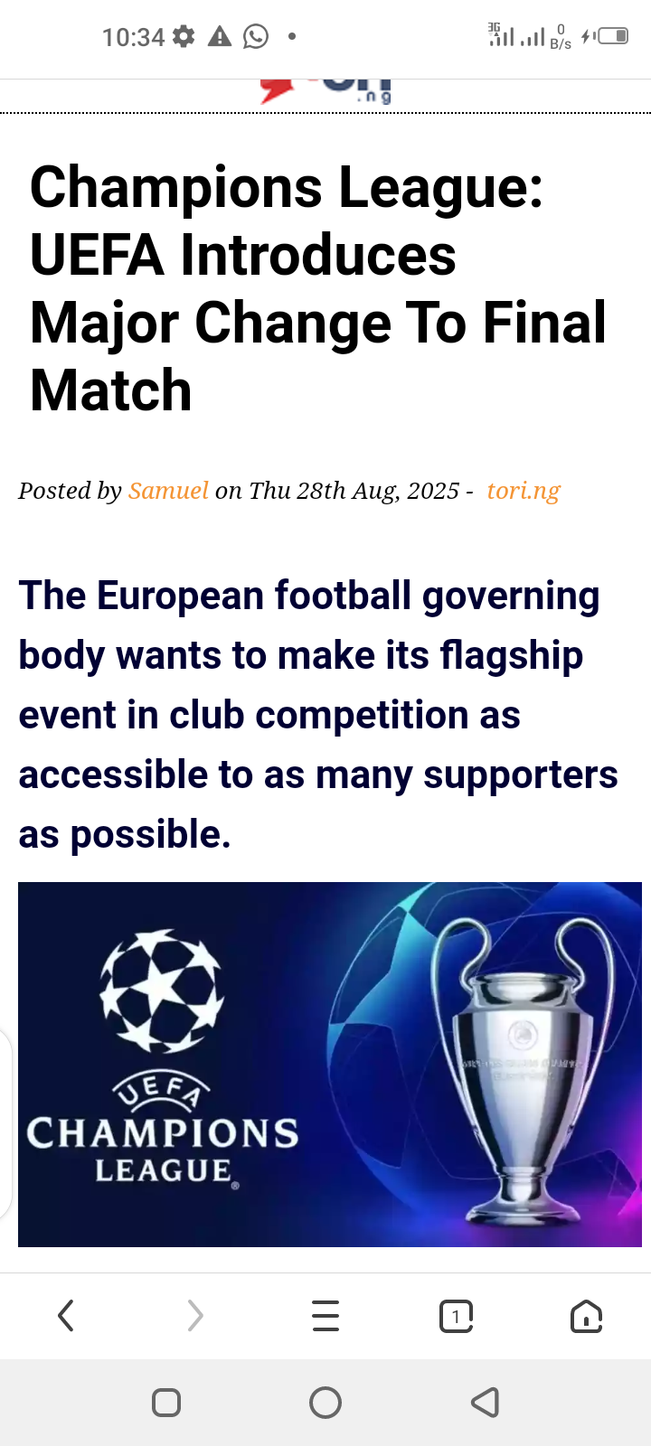 Champions League: UEFA Introduces Major Change To Final Match Posted by Samuel on Thu 28th Aug, 2025 – tori.ng The European football governing body wants to make its flagship event in club competition as accessible to as many supporters as possible.  UEFA has announced a major change to the Champions League final, beginning this season. The European football governing body wants to make its flagship event in club competition as accessible to as many supporters as possible. And the organization has taken into account fans that will be attending in person and a global television audience that extends into hundreds of millions. UEFA has now decided that the final, starting from the 2025/2026 season, will kick off at 6:00 pm local time. This year’s final will be played at the iconic Puskas Arena in Budapest, Hungary. The 2024/2025 final between Paris Saint-Germain and Inter Milan kicked off at 9:00 pm local time. UEFA has further explained that it is looking to “enhance the overall matchday experience” and eradicate logistical challenges that have posed problems in the past. Popular Stories Mosque Renamed to ‘Mary, Mother of Jesus’ in Dubai (Photo) Story of Ovonramwen Nogbaisi, the Oba of Benin Who was Conquered and Exiled to Calabar by the British See the Inside of Luxury 160million Pounds Private Mega-yacht Complete with Glass Elevator and Outdoor Cinemas (Photos) Revolving Beds, Chauffeur-Driven Rolls Royces & More: A Peep Inside the Billion Dollar Burj Al Arab Hotel in Dubai (Photos) My Meeting with the Prime Minister and Emir of Dubai – Sijibomi ‘SujiMoto’ Ogundele Shares Experience Copyright © 2025 Tori.ng – All rights reserved Tori.ng is owned and managed by Cyclofoss Technologies Ltd.
