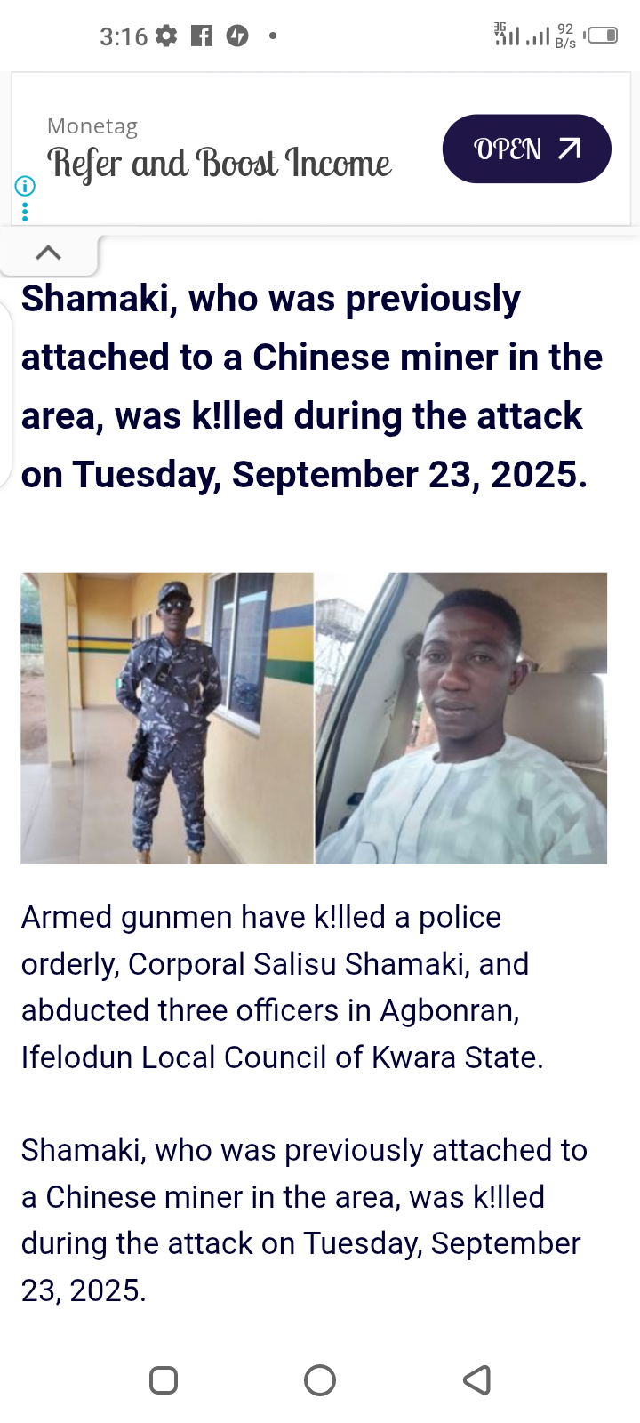Menu Chinese Miner Escapes As Gunmen K!ll Police Orderly And Abduct Three Officers In Kwara Posted by Samuel on Thu 25th Sep, 2025 – tori.ng Share this news: Shamaki, who was previously attached to a Chinese miner in the area, was k!lled during the attack on Tuesday, September 23, 2025. Armed gunmen have k!lled a police orderly, Corporal Salisu Shamaki, and abducted three officers in Agbonran, Ifelodun Local Council of Kwara State. Shamaki, who was previously attached to a Chinese miner in the area, was k!lled during the attack on Tuesday, September 23, 2025. The Chinese miner escaped unhurt, while the whereabouts of the three abducted policemen remain unknown. The incident comes amid a series of violent raids by armed bandits in Ifelodun, which have led to killings, abductions, and looting of property in recent weeks. Governor AbdulRahman AbdulRazaq has ordered the mobilisation of the state’s security apparatus to the affected area. In addition, the Nigerian Army’s Sobi Barracks in Ilorin has approved a forward operational base to counter the activities of the bandits. Stakeholders, including political leaders, community groups, and cultural organisations, are collaborating with local vigilantes and security agencies to restore peace and protect residents in the area. Share this news: Recent News US Property Scandal: Don’t Ignore Allegations Against Wike – Timi Frank Tells Tinubu Published on Thu 25th Sep, 2025 I’m Profoundly Grateful – Saheed Osupa Celebrates As Burna Boy Names Him as His Greatest of All Time Singer Published on Thu 25th Sep, 2025 Erica Nlewedim Threatens to Relocate to Ghana Over Lagos Flooding Published on Thu 25th Sep, 2025 Police Arrest Two For Alleged Self-Kidnapping in Niger State Published on Thu 25th Sep, 2025 Rihanna And A$AP Rocky Welcome Baby Girl, Their Third Child Together Published on Thu 25th Sep, 2025 PROMOTED CONTENT Cardizoom The Worst Enemy Of Hypertension. Read This Before It’s Removed Slim Weight Of 90 Kg Will Drop To 50 Kg! Take 1 Drop In The Morning Proman Do This Every Night And Your Prostate Will Be Restored In 5 Days! Flexibility Everyone Who Suffers From Back Pain Read This Proman 5 Times Stronger Than Viagra! “It Is Sold In Every Pharmacy!” Volmix People With Knee And Hip Pain Should Read This! Volmix Effective Way To Get Rid Of Joint Pain In Just 5 Days! Xenoprost Active Natural Yet Very Effective! Provides Immediate Results CardiZoom Nigerian Secret To Normalizing Blood Pressure In 7 Days Latest News Juma Jux Gifts Priscilla Ojo, Son Rakeem Wads Of Dollar Notes As They Reunited In Tanzania (Video) Published on Thu 25th Sep, 2025 BREAKING: Nationwide Blackout Looms As Nigerian Electricity Workers Begin Strike Published on Thu 25th Sep, 2025 Boko Haram War Ends When Nigeria Gets A Commander-In-Chief – Aisha Yesufu Claims Published on Thu 25th Sep, 2025 Nigerian Police Declare 38-Year-Old Ebonyi Man Wanted For Attempted Murder, Assault With Machete, Knife Published on Thu 25th Sep, 2025 US Property Scandal: Don’t Ignore Allegations Against Wike – Timi Frank Tells Tinubu Published on Thu 25th Sep, 2025 Chinese Miner Escapes As Gunmen K!ll Police Orderly And Abduct Three Officers In Kwara Published on Thu 25th Sep, 2025 My Children Are Young, One Day, They’re Going To Read This – PSG Defender, Hakimi Breaks Silence On R@pe Allegations Published on Thu 25th Sep, 2025 Police Reacts To Claims That Officers Have Been Mandated To Remove Pockets From Their Uniforms Published on Thu 25th Sep, 2025 Man Found De@d With A Rope Tied Around His Neck In Gombe Published on Thu 25th Sep, 2025 Nigerian Lady Raises Alarm Over Alleged ‘Egg Donation Scam’ In Lagos (Video) Published on Thu 25th Sep, 2025 FCT Minister, Nyesom Wike Speaks On Becoming A Pastor Published on Thu 25th Sep, 2025 Nigeria’s Efe Ajagba Enters Boxing Top 10 As Anthony Joshua Drops Out Published on Thu 25th Sep, 2025 Drama As Electricity Workers Shut TCN Osogbo Control Centre Over Unpaid Salaries, Others Published on Thu 25th Sep, 2025 Fela Didn’t Inspire Me – Burna Boy Published on Thu 25th Sep, 2025 I Don’t Bear Grudges Against Anybody – Jonathan Published on Thu 25th Sep, 2025 0 1 2 Older » Popular News The Biggest Nigerian Celebrity Fights That Rocked Social Media In 2019 (Photos) See Forbes List Of Top 20 Richest People In Africa 2019 BFF Goals: Viral Photos Of 4 Bestfriends Before And After Motherhood See the Airplane Biafra Legend, Odimegwu Ojukwu Used in Fleeing to Ivory Coast After the Civil War (Photos) From Allen Avenue to Snapchat Prostitute: The Evolution of the Nigerian Commercial S*x Worker Voodoo in Action: Watch How African Juju Priests Publicly Beheaded a Man and Brought Him Back to Life (Photos) Bad Romance: The Untold Story of Me and My Housemaid from Akwa Ibom What a Testimony! Woman Recounts Victory in Spiritual Warfare During Child Labour Amazing Story of 23-year-old Sexy Model Without Legs Who Makes N220,000 Daily (Photos) Woman Claims She was Raped, Impregnated by a Pig Sports I Regret Winning Wimbledon at 17 – Six-time Grand Slam Champion, Boris Becker Outstanding Goal – Celtic Coach Rodgers Hails Kelechi Iheanacho After His UEL Goal I Don’t Hate Ronaldo, But Messi Is A Better Player – Wayne Rooney Says Ballon d’Or 2025: LaLiga Explains Why Lamine Yamal Was Denied Award Siasia Gives Only Reason Europe-Born Super Eagles Stars Are Playing For Nigeria Tech XRP is expected to break through $5.5 in the second half of the year – BTC Miner cloud mining helps you earn steady XRP returns The 2025 wealth vane points to smart cloud mining. Choosing the right way will allow you to earn up to $100 a day, or $100,000 a day Player Verification Technologies Expanding across Africa Controversy Grows Over Accuracy of AI Detection in Academia PlayStation, Xbox et maintenant 1Win: le trio gagnant des gamers! World Man Uses A Woman’s Placenta To Re-Build His Eye And Save His Sight After Acid Attack US President-elect, Donald Trum