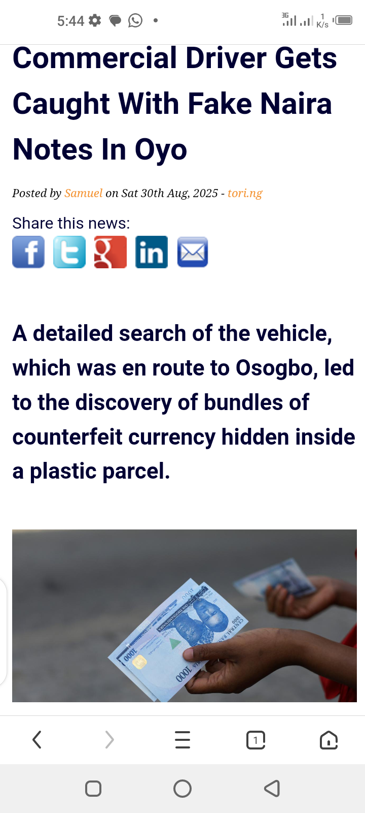 Commercial Driver Gets Caught With Fake Naira Notes In Oyo Posted by Samuel on Sat 30th Aug, 2025 – tori.ng Share this news:      A detailed search of the vehicle, which was en route to Osogbo, led to the discovery of bundles of counterfeit currency hidden inside a plastic parcel.  Police have arrested a commercial driver on the Ibadan-Lagos Expressway after discovering counterfeit ₦1,000 notes during a routine stop-and-search operation. The suspect, who goes by the name Akande, was driving a green Toyota Sienna (registration number Lagos FKJ 443 YG) when he was stopped by the Federal Highway Patrol team near the Guru Maharaj area of the Lagos-Ibadan Expressway. Officers grew suspicious when Akande appeared unusually nervous during the inspection. A detailed search of the vehicle, which was en route to Osogbo, led to the discovery of bundles of counterfeit currency hidden inside a plastic parcel. The notes, amounting to approximately N1 million, were carefully wrapped and secured with tape. The counterfeit N1,000 notes bore three distinct serial numbers: 235923, 235922, and 235921, representing N500,000, N300,000, and N200,000, respectively. During interrogation, Akande admitted to being a courier tasked with delivering the fake money. He revealed that he had received the parcel from an unnamed individual in Ojota, Lagos, and was instructed to transport it to Osogbo. He, however, claimed to have no information on the recipient’s identity or contact details, adding that he had been told the package contained body cream, not money. The police assured the public that they will continue to intensify efforts to combat counterfeit currency operations, which pose a serious threat to the country’s financial stability. The Oyo State Police Command also urged citizens to remain vigilant and report any suspicious activities to help prevent financial crimes in the region.