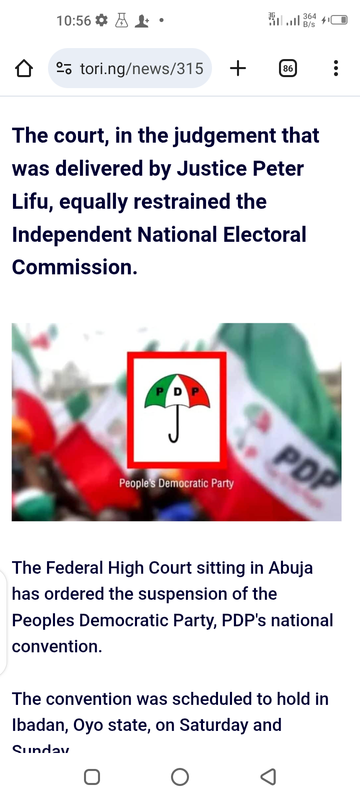 Menu Court Gives Final Order Stopping PDP Convention Over Exclusion of Lamido Posted by Thandiubani on Fri 14th Nov, 2025 – tori.ng Share this news: The court, in the judgement that was delivered by Justice Peter Lifu, equally restrained the Independent National Electoral Commission. The Federal High Court sitting in Abuja has ordered the suspension of the Peoples Democratic Party, PDP’s national convention. The convention was scheduled to hold in Ibadan, Oyo state, on Saturday and Sunday. The court, in the judgement that was delivered by Justice Peter Lifu, equally restrained the Independent National Electoral Commission, INEC, from supervising, monitoring or recognizing the outcome of any convention the party would hold without the inclusion of a former Governor of Jigawa State, Sule Lamido, as a contestant. According to the court, evidence before it showed that Lamido was unjustly denied the opportunity to obtain a nomination form to contest for the National Chairmanship position of the party, contrary to both the Constitution and Regulations of the PDP. It declared that the party was under obligation to create opportunity for its members to serve by putting deliberate measures in place to enable them to realise their aspirations. As a consequential order, Justice Lifu ordered that the planned convention must be put on hold to allow the plaintiff (Lamido) to obtain the nomination form, mobilise his supporters, and conduct his campaign. Share this news: Recent News Why Treasonable Charges Against Kanu Are Null And Void – Bishop Udeh Published on Fri 14th Nov, 2025 Diana Eneje Cries Out After Painter Drinks N950K Wine, Hides Bottle In Her Wardrobe Published on Fri 14th Nov, 2025 I Don’t Hide, I Fight Harder — Victor Osimhen Declares After Heroics Against Gabon (Video) Published on Fri 14th Nov, 2025 Senator Ndume Fumes As Boko Haram K!lls 4 Farmers, Raze Church, Abduct Women, Children And Pastor’s Daughters In Borno Published on Fri 14th Nov, 2025 Patricia Founder, Hanu Calls for Arrest and Investigation of Paystack Co-founder Ezra Olubi Published on Fri 14th Nov, 2025 Latest News Nigerian Singer, Ayra Starr Storms Accra To Headline Tidal Rave Beach Festival (Video) Published on Fri 14th Nov, 2025 Christian Genocide: ‘I’m Cool As Cucumber’ – Tuggar Replies Piers Morgan On Panicking About His Interview Published on Fri 14th Nov, 2025 2026 WWC Playoffs: Nigeria vs DR Congo – Preview, Date, Time, Where To Watch Published on Fri 14th Nov, 2025 BBC Apologizes to Trump Over Edited Video Published on Fri 14th Nov, 2025 TCN Announces 3-Day Power Outage in Lagos Published on Fri 14th Nov, 2025 Why Treasonable Charges Against Kanu Are Null And Void – Bishop Udeh Published on Fri 14th Nov, 2025 I’m Taking Care of My Mother – BBNaija Season 10 Winner Imisi Reacts To Accusations Published on Fri 14th Nov, 2025 He’s Trying to Use 11 Microphones to Deny What He Said With No Microphone – Dino Melaye Mocks Wike Published on Fri 14th Nov, 2025 WCQ: Osimhen Opens Up On Bonus Row Between Super Eagles, NFF Published on Fri 14th Nov, 2025 Nnamdi Kanu Files N550million Suit Against Nigerian Medical Association Over Alleged Forged Report Published on Fri 14th Nov, 2025 Pandemonium As Stampede At The Residence Of Minister Of Defence, Matawalle Leaves One Dead, Six Injured Published on Fri 14th Nov, 2025 How Two Nigerians Were Nabbed, Jailed For Using Forged Documents To Obtain Ghana Card Published on Fri 14th Nov, 2025 Donald Trump’s Intervention Will Be Messy, Powerful People Are Behind K!llings – Pastor Sam Adeyemi Published on Fri 14th Nov, 2025 Diana Eneje Cries Out After Painter Drinks N950K Wine, Hides Bottle In Her Wardrobe Published on Fri 14th Nov, 2025 15% Import Duty on Petrol Would Have Increased Petrol Price by N130/Litre – PENGASSAN Published on Fri 14th Nov, 2025 0 1 2 Older » Popular News Throwback Photo Of Comedians AY And Ali Baba When Things Were Tough Blind Love: Some Romantic Pictures that Will Make You Laugh and Roll on the Floor How Can You Can Improve Your Oral S*x Skills and Make Her Explode? Popular Therapist Shares Secrets Meet the Nigerian Man with 97 wives and Over 180 Children (Photo) Without Saying a Word, This Short 6-minute Video Will Leave You Speechless (Watch) UNILAG Student Rusticated for 4 Semesters after Posting this Write-up on Facebook….See Details Nigerian Lady Falls in Love With a Man Online, But What Happened When She Finally Met Him is Shocking See 9 Nigerian Billionaires You Never Knew Were This Stinking Rich How Unprotected Oral Sex Can Kill You (Must Read) My Meeting with the Prime Minister and Emir of Dubai – Sijibomi ‘SujiMoto’ Ogundele Shares Experience Discover more Cryptocurrency trading platforms Mental health resources World news subscriptions Sporting event tickets Health and wellness products Entertainment News Marriage advice books Celebrity Gossip Health Information Business Insights Sports 2026 WCQ Playoffs: Nigeria To Face DR Congo In African Playoff Final 2026 WCQ Playoffs: Chelle Drops Lookman, Troost-Ekong, Starts Osimhen vs Gabon Why Super Eagles Can’t Afford To Miss Out On Another World Cup – Iwobi 2026 WCQ Playoff: ‘A Real Shame’ – Troy Deeney Slams Nigeria Over Bonus Issues Super Eagles Only Demanded For Outstanding Allowances — Captain Ekong Confirms Training Boycott Tech Facebook, Instagram Users to Pay £2.99 For Monthly Subscription Apple Launches iPhone 17 Pro XRP is expected to break through $5.5 in the second half of the year – BTC Miner cloud mining helps you earn steady XRP returns The 2025 wealth vane points to smart cloud mining. Choosing the right way will allow you to earn up to $100 a day, or $100,000 a day Player Verification Technologies Expanding across Africa World Man Uses A Woman’s Placenta To Re-Build His Eye And Save His Sight After Acid Attack US President-elect, Donald Trump To Take More Than 200 Executive Actions On First Day In Office Commotion As Two Armed