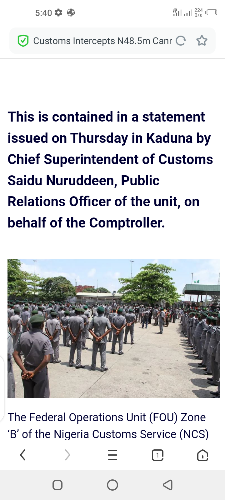 Customs Intercepts N48.5m Cannabis, N220m Contraband In Kaduna Posted by Samuel on Thu 28th Aug, 2025 – tori.ng Share this news:      This is contained in a statement issued on Thursday in Kaduna by Chief Superintendent of Customs Saidu Nuruddeen, Public Relations Officer of the unit, on behalf of the Comptroller.  The Federal Operations Unit (FOU) Zone ‘B’ of the Nigeria Customs Service (NCS) in Kaduna has announced the interception of 185 blocks of Cannabis Sativa worth N48.5 million. This is contained in a statement issued on Thursday in Kaduna by Chief Superintendent of Customs Saidu Nuruddeen, Public Relations Officer of the unit, on behalf of the Comptroller. Nuruddeen said the seizure, together with other contraband worth N220.4 million recovered in separate operations, was made on Aug. 21 at about 3:30 a.m. “Acting on intelligence, operatives stopped a vehicle along the Zaria flyover on the Kaduna–Zaria Expressway, and intercepted the contraband.” He explained that a male suspect was arrested after nine sacks containing 185 compressed blocks of Cannabis Sativa, weighing 89.6kg, were discovered in the vehicle. “The seized substance has an estimated duty paid value (DPV) of N48,562,500. “Both the suspect and the exhibits have been handed over to operatives of the National Drug Law Enforcement Agency for further investigation and prosecution in line with the spirit of inter-agency collaboration,” he said. The spokesperson added that in a separate operation, officers of the unit also intercepted three vehicles conveying smuggled items. According to him, the seizures include 456 bags of 50kg foreign parboiled rice, 8,100 litres of Premium Motor Spirit (PMS), 178 bales of second-hand clothes, 225 cartons of spaghetti, 107 used tyres and 37 pieces of electric shockers (tasers). He said the total duty paid value of the contraband stood at N220,457,336.48. The Comptroller of the unit, Mr Aliyu Alkali, commended the Comptroller-General of Customs, Mr Bashir Adewale Adeniyi, for his continuous support and guidance. Alkali reiterated the commitment of the unit to sustaining the fight against smuggling, illegal trade, and the inflow of uncustomed goods into the country. He stressed that the seizures were part of ongoing efforts by the service to protect the nation’s economy and safeguard national security.