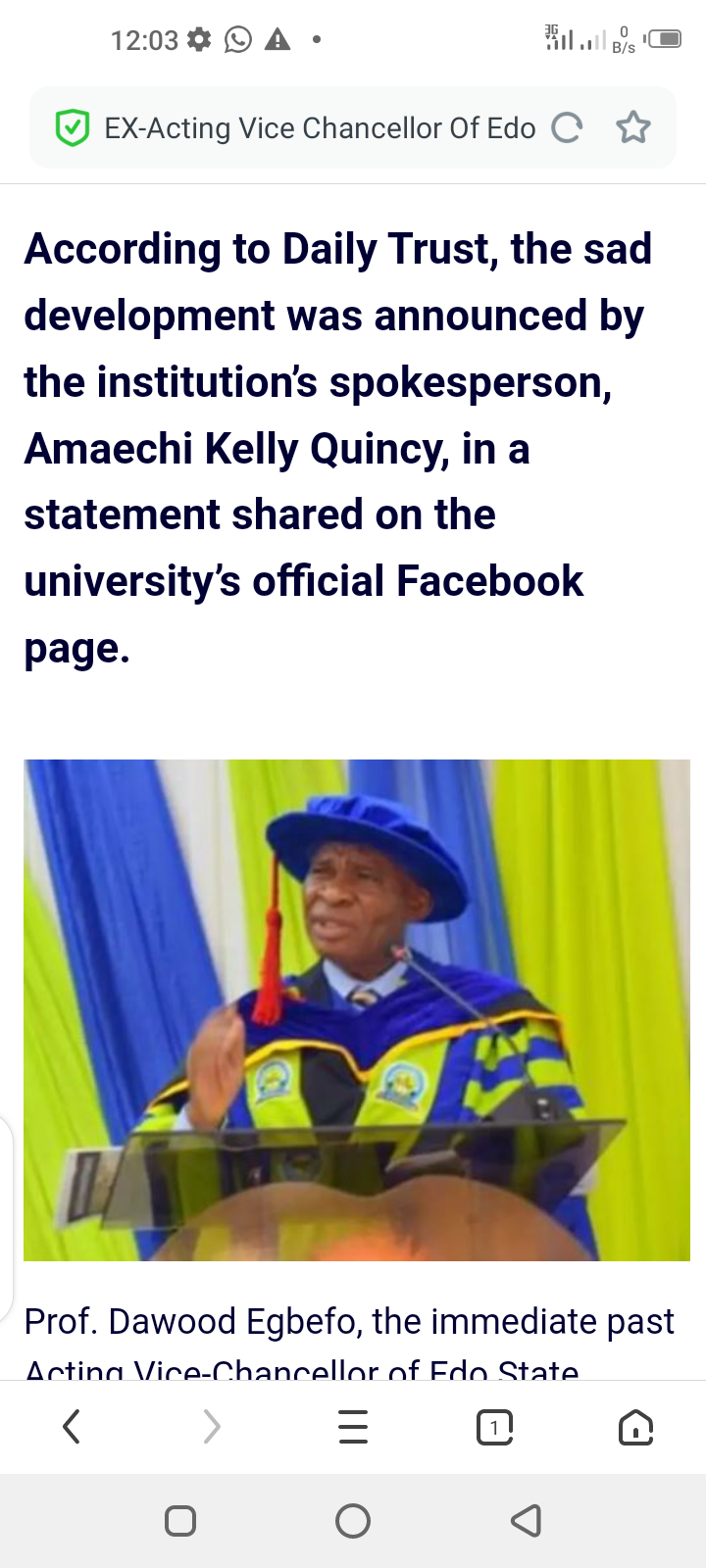 EX-Acting Vice Chancellor Of Edo State University, Prof Dawood Egbefo, D!es Just Two Weeks After Leaving Office Posted by Samuel on Fri 29th Aug, 2025 – tori.ng Share this news:      According to Daily Trust, the sad development was announced by the institution’s spokesperson, Amaechi Kelly Quincy, in a statement shared on the university’s official Facebook page.  Prof. Dawood Egbefo, the immediate past Acting Vice-Chancellor of Edo State University, Iyahmo, has died just two weeks after handing over to his successor. According to Daily Trust, the sad development was announced by the institution’s spokesperson, Amaechi Kelly Quincy, in a statement shared on the university’s official Facebook page. Governor Monday Okpebholo had earlier, on August 8, 2025, approved the appointment of Prof. Victor Adetimirin Olawale as the substantive Vice Chancellor of the institution, succeeding Egbefo. Although the cause of his death was not disclosed, the university described Prof. Egbefo as a distinguished scholar, mentor, and astute administrator whose contributions to academia will be remembered. Egbefo obtained his Bachelor’s, Master’s, and PhD degrees in History and International Studies from the University of Ilorin. He began his academic career at Ibrahim Badamasi Babangida University, Lapai, before joining Edo State University, Iyahmo, in 2017 as an Associate Professor.
