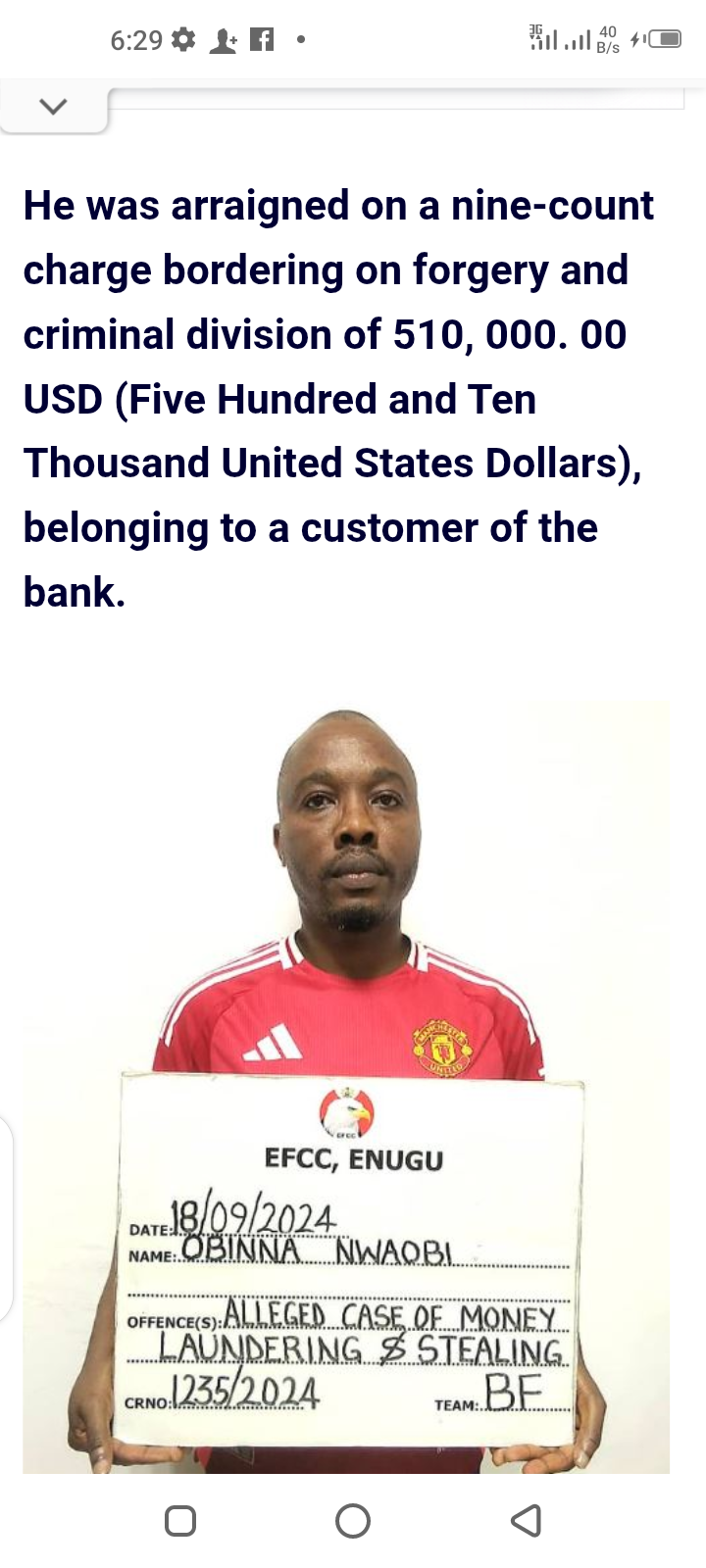 Menu Face Of Ex-Banker Arraigned By EFCC For Alleged Criminal Diversion Of Customer’s $510,000 (Photo) Posted by Samuel on Sat 15th Nov, 2025 – tori.ng Share this news: He was arraigned on a nine-count charge bordering on forgery and criminal division of 510, 000. 00 USD (Five Hundred and Ten Thousand United States Dollars), belonging to a customer of the bank. The Enugu Zonal Directorate of the Economic and Financial Crimes Commission (EFCC) on Thursday, November 13, 2025, arraigned Obinna Nwaobi, a former Head of Operations at Access Bank Nigeria Plc, before Justice F. O. Giwa-Ogunbanjo of the Federal High Court sitting in Independence Layout, Enugu State. He was arraigned on a nine-count charge bordering on forgery and criminal division of 510, 000. 00 USD (Five Hundred and Ten Thousand United States Dollars), belonging to a customer of the bank. Count seven of the charge reads: “That you, Obinna Nwaobi while being (Head of Operations) of Access Bank Nigeria Plc, Enugu branch on or about the 8th day of August, 2024 in Enugu State, within the jurisdiction of the Federal High Court of Nigeria, induced Access Bank Nigeria Plc to transfer a total sum of Five Hundred and Ten Thousand United States Dollars ($510, 000. 00) from LANTERN GATE NIGERIA LIMITED Access Bank Account number 0761770127 under the false pretence that Lantern Gate Nigeria Limited gave her consent and mandate for the said transfer which petence you knew to be false and you thereby committed an offence contrary to Section 1 (b) of the Advance Fee Fraud and Other Fraud Related Offences Act, 2006 and punishable under Section 1 (3) of the same Act”. Count eight of the charge reads: “That you, Obinna Nwaobi while being (Head of Operations) of Access Bank Plc, Enugu branch on or about the eight day of August, 2024 in Enugu State, within the jurisdiction of the Federal High Court of Nigeria, knowingly forged a document to Wit: “Access Bank Domestic Fund Transfer Form “D”, dated 28th August 2024, knowing same to be false and with intent that it may be acted upon as genuine to the prejudice of Access Bank Plc and you thereby committed an offence contrary to Section 1 (2) (a) of the Miscellaneous Offences Act 2004 and punishable under Section 1 (2) of the same Act”. The defendant pleaded “not guilty” to all the charges when they were read to him. However, defence counsel, F. C. Obinna informed the court about a bail application before it, dated October 24, 2025 and supported by 8-paragraph affidavit. He adopted same and prayed the court to admit his client to bail. Reacting to the said application, counsel to the EFCC, Assistant Commander of the EFCC, ACE II Mainforce Adaka Ekwu, vehemently opposed the application via an 11-paragraph counter affidavit filed on November 12, 2025. While relying on the said counter affidavit, the prosecution urged the court to refuse the said application because, “the quality of evidence we have in our proof of evidence might put fear in him and he might want to abscond”. After listening to both parties, the court granted the defendant bail in the sum of N250 Million (Two Hundred and Fifty Million Naira) and three sureties in like sum. Two of the sureties shall have landed properties in Enugu State and the papers of the said properties must be submitted to the court. “The third surety shall be a relative of the defendant, who shall deposit evidence of tax payment for three years. The defendant and the sureties shall deposit two passports each to the court and the defendant shall deposit his international passport and National Identification Number to the court until the determination of this case” The matter was adjourned to March 10, 11 and 12, 2026 for trial while the defendant was remanded at the facility of the Nigeria Correctional Service in Enugu. The defendant’s case started on September 11, 2024 when the Commission received a petition from Access Bank Plc, alerting the EFCC of unauthorized transfers from its customer’s account. According to the petitioner, the sum of $510, 000. 00 belonging to its customer, Lantern Gate Nigeria Limited was moved to six different accounts on the authorization of Obinna Nwaobi, its Head of Operation as at that time, without the approval of the customer. Share this news: Recent News I Received The Beating Of My Life Because I Nursed His Injured Brother – Nigerian Lady Reveals Domestic Abuse She Faced In Her Marriage Published on Sat 15th Nov, 2025 I’m Taking Care of My Mother – BBNaija Season 10 Winner Imisi Reacts To Accusations Published on Fri 14th Nov, 2025 15% Import Duty on Petrol Would Have Increased Petrol Price by N130/Litre – PENGASSAN Published on Fri 14th Nov, 2025 CAF Announces Free e-Visas For Fans Attending AFCON Morocco 2025 Published on Fri 14th Nov, 2025 Heartbroken Nigerian Dad Accuses Abuja Hospital Staff Of K!lling His Newborn Baby Over An Unpaid Bill (Video) Published on Fri 14th Nov, 2025 Latest News S*xual Allegations: Police Urged To Probe Suspended Paystack Co-Founder, Ezra Olubi Published on Sat 15th Nov, 2025 India Deports Nigerian Man Over Visa Violation, Drug Peddling Published on Sat 15th Nov, 2025 Face Of Ex-Banker Arraigned By EFCC For Alleged Criminal Diversion Of Customer’s $510,000 (Photo) Published on Sat 15th Nov, 2025 I Received The Beating Of My Life Because I Nursed His Injured Brother – Nigerian Lady Reveals Domestic Abuse She Faced In Her Marriage Published on Sat 15th Nov, 2025 Blog Post Of Paystack Co-Founder Ezra Olubi Talking About Being Bis*xual And Wanting To Have S3x With A Male Co-Worker Emerges Published on Sat 15th Nov, 2025 I’m Alive, Hale And Hearty – Ex-Anambra Governor, Willie Obiano Debunks De@th Rumours Published on Sat 15th Nov, 2025 Fuel Tariff Reversal Shows Tinubu Running Trial-and-Error Govt – ADC Blows Hot Published on Sat 15th Nov, 2025 How DSS Re-Arrested Kuje Prison Escapee, Terror Suspect Obadaki Published on Sat 15th Nov, 2025 Nigerian Actor,