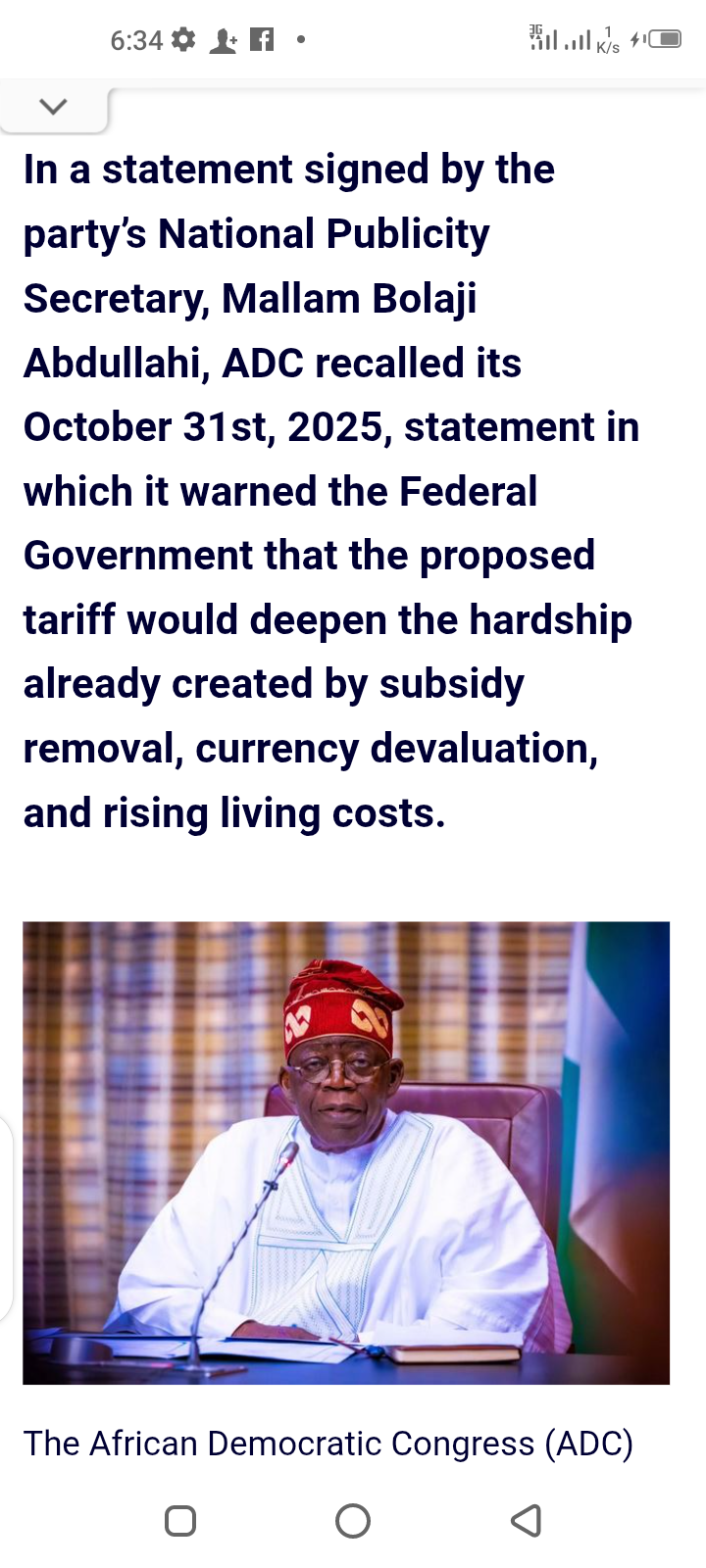 Menu Fuel Tariff Reversal Shows Tinubu Running Trial-and-Error Govt – ADC Blows Hot Posted by Samuel on Sat 15th Nov, 2025 – tori.ng Share this news: In a statement signed by the party’s National Publicity Secretary, Mallam Bolaji Abdullahi, ADC recalled its October 31st, 2025, statement in which it warned the Federal Government that the proposed tariff would deepen the hardship already created by subsidy removal, currency devaluation, and rising living costs. The African Democratic Congress (ADC) has stated that the Federal Government’s decision to withdraw its proposed 15 percent import duty on petrol and diesel reinforces its view that President Bola Ahmed Tinubu is operating a “trial-and-error” administration. In a statement signed by the party’s National Publicity Secretary, Mallam Bolaji Abdullahi, ADC recalled its October 31st, 2025, statement in which it warned the Federal Government that the proposed tariff would deepen the hardship already created by subsidy removal, currency devaluation, and rising living costs. While commending the Tinubu government for listening to the opposition’s advice, the ADC emphasised that policies must be properly thought through instead of being hastily announced and later reversed. The party noted that this was the seventh instance in two years where a policy was announced and later withdrawn. ADC warned that the new levy could push the pump price of petrol beyond N1,000 per litre, further burdening families, commuters, transporters, farmers, and small businesses already struggling under fuel subsidy removal and currency devaluation without safeguards. “We also queried why the government was contemplating taxing imported fuel without first ensuring local capacity for production. “We find it quite interesting that these are the very reasons the government has given for reversing itself, which makes us wonder if any critical thinking and impact analysis happens in this government. What has become clear, however, is that President Tinubu is running a government of trial and error that is merely experimenting and bumbling through. “It is even more disturbing to see different agencies and officials of government singing discordant tunes on the same issue, as evidenced in their explanations for the tariff reversal. While one agency announced that the implementation of the policy was merely postponed, another said that it was no longer in view. This shows a government that is confused, unsure, and dangerously working at cross purposes. Nigerians deserve better. “We urged the Tinubu government to realise that public office is a responsibility, not a laboratory. The ADC will continue to stand firmly with Nigerians and speak out against any decision that threatens their wellbeing.” Share this news: Recent News 2026 WWC Playoffs: Nigeria vs DR Congo – Preview, Date, Time, Where To Watch Published on Fri 14th Nov, 2025 TCN Announces 3-Day Power Outage in Lagos Published on Fri 14th Nov, 2025 He’s Trying to Use 11 Microphones to Deny What He Said With No Microphone – Dino Melaye Mocks Wike Published on Fri 14th Nov, 2025 CAF Announces Free e-Visas For Fans Attending AFCON Morocco 2025 Published on Fri 14th Nov, 2025 I Don’t Hide, I Fight Harder — Victor Osimhen Declares After Heroics Against Gabon (Video) Published on Fri 14th Nov, 2025 Latest News S*xual Allegations: Police Urged To Probe Suspended Paystack Co-Founder, Ezra Olubi Published on Sat 15th Nov, 2025 India Deports Nigerian Man Over Visa Violation, Drug Peddling Published on Sat 15th Nov, 2025 Face Of Ex-Banker Arraigned By EFCC For Alleged Criminal Diversion Of Customer’s $510,000 (Photo) Published on Sat 15th Nov, 2025 I Received The Beating Of My Life Because I Nursed His Injured Brother – Nigerian Lady Reveals Domestic Abuse She Faced In Her Marriage Published on Sat 15th Nov, 2025 Blog Post Of Paystack Co-Founder Ezra Olubi Talking About Being Bis*xual And Wanting To Have S3x With A Male Co-Worker Emerges Published on Sat 15th Nov, 2025 I’m Alive, Hale And Hearty – Ex-Anambra Governor, Willie Obiano Debunks De@th Rumours Published on Sat 15th Nov, 2025 Fuel Tariff Reversal Shows Tinubu Running Trial-and-Error Govt – ADC Blows Hot Published on Sat 15th Nov, 2025 How DSS Re-Arrested Kuje Prison Escapee, Terror Suspect Obadaki Published on Sat 15th Nov, 2025 Nigerian Actor, Baba Ijesha Released From Prison After 5 Years Published on Sat 15th Nov, 2025 Former Anmabra Governor, Willie Obiano Is Not De@d – Ex-Commissioner Debunks Rumoured De@th Published on Sat 15th Nov, 2025 Nigerian Singer, Ayra Starr Storms Accra To Headline Tidal Rave Beach Festival (Video) Published on Fri 14th Nov, 2025 Christian Genocide: ‘I’m Cool As Cucumber’ – Tuggar Replies Piers Morgan On Panicking About His Interview Published on Fri 14th Nov, 2025 2026 WWC Playoffs: Nigeria vs DR Congo – Preview, Date, Time, Where To Watch Published on Fri 14th Nov, 2025 BBC Apologizes to Trump Over Edited Video Published on Fri 14th Nov, 2025 TCN Announces 3-Day Power Outage in Lagos Published on Fri 14th Nov, 2025 0 1 2 Older » Popular News This Query Letter Issued to LG Council Staff in Bauchi State Will Make You Laugh and Roll on the Floor Omg! What was Found Written in the Gigantic Devil’s Bible Discovered in Czech Republic will Shock You (Photos+Video) I Got Pregnant At 16, Became a Millionaire At 17 – Popular Nigerian Actress Reveals Meet the Handsome Abuja Guy Who Has Won Affection From Nigerian Ladies (Photos) 8 Nigerian Celebrities Throwback Photos That Prove ‘Nobody is Born Ugly but Just Broke’ Warning! You Can Get These Deadly Diseases Through Kissing Check Out the 10 Sexiest Actresses of Nigerian Television Soap Operas Revealed: How Lagos Sharp Guys Woo Girls Inside Danfo Buses My Meeting with the Prime Minister and Emir of Dubai – Sijibomi ‘SujiMoto’ Ogundele Shares Experience Court Orders Woman To Pay Husband $120,000 For Giving Birth To an Ugly Child
