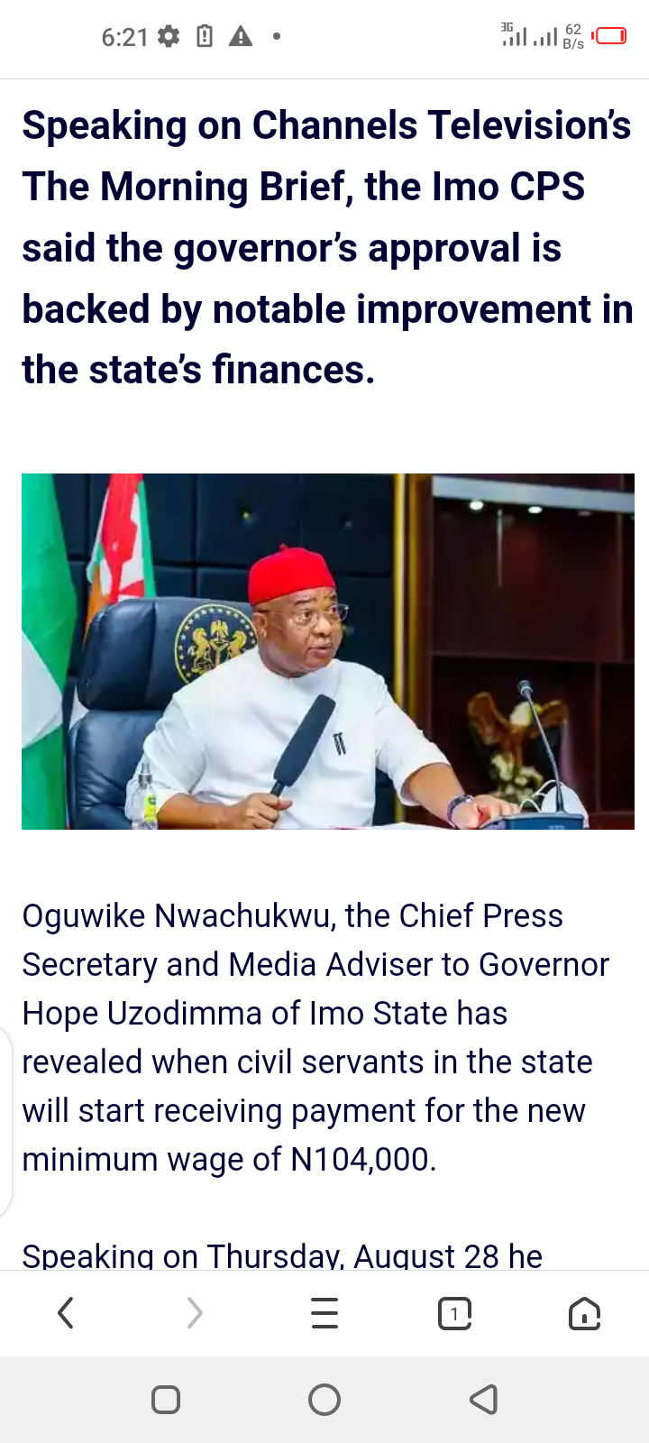 Gov Uzodimma’s Aide Reveals When Imo Workers Will Start Receiving N104,000 Minimum Wage Posted by Thandiubani on Thu 28th Aug, 2025 – tori.ng Share this news:      Speaking on Channels Television’s The Morning Brief, the Imo CPS said the governor’s approval is backed by notable improvement in the state’s finances.  Oguwike Nwachukwu, the Chief Press Secretary and Media Adviser to Governor Hope Uzodimma of Imo State has revealed when civil servants in the state will start receiving payment for the new minimum wage of N104,000. Speaking on Thursday, August 28 he revealed that the money will be paid starting from August 2025. Recall that the governor had earlier announced his administration’s approval for a new minimum wage of N104,000 for all civil servants in the state. Speaking on Channels Television’s The Morning Brief, the Imo CPS said the governor’s approval is backed by notable improvement in the state’s finances. He also said that there has been a massive growth within Imo State’s Internally Generated Revenue which prompted the action by the governor. “The government of Hope Uzodimma has invested in building a digital economy and a new template of development. “When this government came on board, the IGR was less than N400 million, but today, we are talking about an IGR of about N3 billion to N4 billion. This is a very clear pointer that the government is on the right track financially. “This revenue growth is a direct result of the administration’s efforts to block financial leakages, digitise government processes, and create a conducive environment for both local and foreign investment,” Nwachuku said. In addition, the CPS said the approval of a new minimum wage for workers by the governor was a carefully thought-out decision and not a political gamble. “The new wage structure would be implemented with the August 2025 salaries, while consequential adjustments for other cadres of the civil service will be implemented in subsequent months,” Nwachukwu added.
