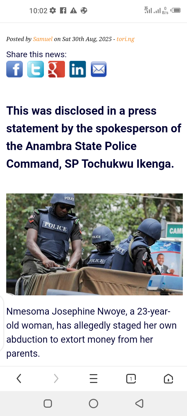 How 23-Year-Old Lady Connived With Boyfriend To Fake Her Own Kidnap And Collect N3m Ransom From Parents Posted by Samuel on Sat 30th Aug, 2025 – tori.ng Share this news:      This was disclosed in a press statement by the spokesperson of the Anambra State Police Command, SP Tochukwu Ikenga.  Nmesoma Josephine Nwoye, a 23-year-old woman, has allegedly staged her own abduction to extort money from her parents. Daily Post reports that the staged abduction was carried out in connivance with her boyfriend, 24-year-old Chibuike Ogbu. Both suspects were arrested on Friday by operatives of the Anambra State Police Command, with a total of N1.2 million recovered from them as part of the ransom earlier paid by the young woman’s parents. This was disclosed in a press statement by the spokesperson of the Anambra State Police Command, SP Tochukwu Ikenga. Although details of the exact location of the arrest, as well as the crime scene and the victims’ place of origin, were not provided, Ikenga revealed that the suspects had initially demanded a ransom of N15 million from Nmesoma’s parents but later settled for N3 million, which was transferred into her account. The statement read: “The suspects identified as Nmesoma Josephine Nwoye, female, aged 23 years, and Chibuike Ogbu, male, aged 24 years, were arrested after intelligence-led operations uncovered that the supposed victim conspired with Chibuike (her boyfriend) to stage her own abduction. “The operatives also recovered the sum of N1,200,000 (one million and two hundred thousand naira), being part of the ransom earlier paid by the girl’s family members. “Further information reveals that the suspects demanded N15,000,000 (fifteen million naira) ransom, and after negotiation, N3,000,000 (three million naira) was transferred into the victim’s account.” Anambra State Commissioner of Police Ikioye Orutugu was quoted in the statement as attributing such crimes to rising moral decay in society, warning that many young people are increasingly resorting to criminality for selfish gains. He urged parents, guardians, and religious leaders to intensify efforts to instil discipline, integrity, and sound values in their children and wards.