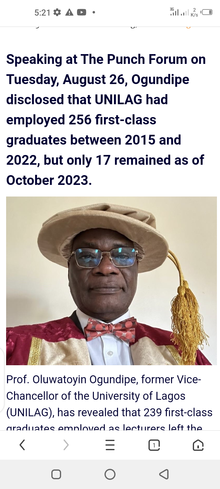 How 239 First-Class Lecturers Quit UNILAG Within 7 Years Over Poor Pay – Ex-VC Reveals Posted by Samuel on Wed 27th Aug, 2025 – tori.ng Speaking at The Punch Forum on Tuesday, August 26, Ogundipe disclosed that UNILAG had employed 256 first-class graduates between 2015 and 2022, but only 17 remained as of October 2023.  Prof. Oluwatoyin Ogundipe, former Vice-Chancellor of the University of Lagos (UNILAG), has revealed that 239 first-class graduates employed as lecturers left the university within seven years because of inadequate pay and unfavorable working conditions. Speaking at The Punch Forum on Tuesday, August 26, Ogundipe disclosed that UNILAG had employed 256 first-class graduates between 2015 and 2022, but only 17 remained as of October 2023. Ogundipe said, “At UNILAG, we decided that those with first-class honours should be employed. What is remaining is not up to 10 per cent. All of them have gone. One day, I asked the man in charge to give me this information. In 2015, 86 were employed; in 2016, 82; during my time, that is, 2017 to 2022, 88 were employed. As of October 2023, only 17 were on the ground. They have gone. Very soon, in the next 10 years, you will have only females in the universities if something is not done.” He attributed the mass exit to poor salaries, lack of motivation, and worsening working conditions, adding that unless urgent reforms were made, universities would struggle to retain top talent and might admit ill-prepared postgraduate candidates. “Many of us are tired. By the time you get home, there is no light, and the Federal Government is saying they are giving us N10m to access as loans. You can see how our lives have been devalued. Can I use N10m to build a security post?” he lamented. Ogundipe further warned that the chronic underfunding of Nigeria’s education sector — with federal and state allocations consistently below 10 per cent of the national budget, far short of UNESCO’s recommended 15–26 per cent — was crippling infrastructure, research, and digital advancement. He said, “The consequences of chronic underfunding are immediate and profound: Nigeria has the highest number of out-of-school children worldwide, estimated at between 10 and 22 million. Over 60 per cent of primary education funding is absorbed by teacher salaries, often with little left for capital expenditure or innovation.” Calling for innovative funding, Ogundipe proposed public-private partnerships, alumni endowments, philanthropic contributions, education bonds, and technology-driven investments to bridge Nigeria’s education financing gap. He stressed, “UNESCO positions innovative financing as a critical tool for bridging the nearly $100bn annual financing gap impeding educational attainment in low- and lower-middle-income countries. The private sector should see education support not just as social responsibility but as enlightened self-interest in building the workforce, the talent, and the markets of tomorrow.” The former VC also urged alumni to give back through donations, mentorship, and research funding, while encouraging civil society, faith-based organisations, and the media to sustain pressure on the government to make education a national priority. Popular Stories Bad Romance: The Untold Story of Me and My Housemaid from Akwa Ibom Only in Naija: See Passengers Climbing an Airplane with a Ladder in Nigerian Airport (Photos) We’ve Seen US President’s Car “The Beast”, But Russian President’s Car is the Real Bomb! (Photos) Hungry Python Swallows Porcupine for Dinner, and Guess What Happened, See the Revenge Too Fat To Travel – Turned Down by Planes, Trains and even Cruise Ships Copyright © 2025 Tori.ng – All rights reserved Tori.ng is owned and managed by Cyclofoss Technologies Ltd.