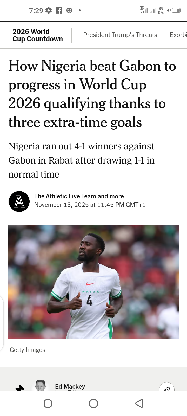 ” Start a free trial World Cup Teams Scores & Schedule • • • 2026 World Cup Countdown President Trump’s Threats Exorbitant Parking Prices Latest Intel Ranking Home Jerseys Which Countries Qualified? Ticketing Fiasco How Nigeria beat Gabon to progress in World Cup 2026 qualifying thanks to three extra-time goals Nigeria ran out 4-1 winners against Gabon in Rabat after drawing 1-1 in normal time The Athletic Live Team and more November 13, 2025 at 11:45 PM GMT+1 Getty Images Ed Mackey Live Editor Nigeria 4-1 Gabon — result Nigeria have beaten Gabon 4-1 to advance to the play-off final of African qualifying for the 2026 World Cup. They needed extra time to make it through after Mario Lemina’s late deflected effort cancelled out Akor Adams’ opener in normal time. Substitute Chidera Ejuke restored Nigeria’s lead early in extra time and their advantage was hammered home by two clinical Victor Osimhen strikes. Osimhen could, however, have stopped us needing extra time but badly squandered a huge chance in the final minute of second-half stoppage time. Nigeria will face the winner of this evening’s other semi-final between DR Congo and Cameroon in Sunday’s final. The winner of that final will progress to the World Cup’s intercontinental play-offs in March. GO FURTHER Nigeria 4 Gabon 1: World Cup dream lives on, Osimhen’s miss (and goals) and VAR controversy November 13, 2025 at 8:40 PM GMT+1 Ed Mackey Live Editor What do Nigeria need to make the World Cup? The equation now is simple for Nigeria. They must win on Sunday, against whichever team wins this evening’s other semi-final between DR Congo and Cameroon, and that will grant them qualification for the inter-confederation play-offs. Nigeria would almost certainly be one of the seeded teams in those play-offs, so they would only need to win one more match — which would be against the winners of one of the play-off semi-finals. Victory in that match and Eric Chelle’s side will be heading to North America for the 2026 World Cup. Defeat on Sunday, or in March, will end their dreams of making next summer’s tournament. November 13, 2025 at 8:32 PM GMT+1 Jay Harris Staff Writer, Tottenham Hotspur Where were the Nigeria fans? Considering the importance of this game, the stadium was surprisingly empty before kick-off. It is difficult to make an exact estimate, but there cannot have been more than 2,500 fans when the teams emerged. The Confederation of African Football (CAF) announced the day before that supporters with tickets for AFCON could attend this game and Cameroon vs DR Congo for free. It was clearly an attempt by CAF to convince local Moroccans to come to the Moulay El Hassan Stadium to boost crowd numbers, but it did not have much of an impact. Nigeria fans finally emerged just after that incident in the 59th minute. They were stationed in the upper tier but started banging their own drums and quickly drowned out the boos from Gabon’s support when they arrived. November 13, 2025 at 8:25 PM GMT+1 Jay Harris Staff Writer, Tottenham Hotspur Nigerian players quieten the pre-match noise After a dramatic 48 hours in the build-up to this game, which saw Nigeria’s squad boycott training due to a dispute with the Nigeria Football Federation (NFF), they have taken another step towards qualifying for next year’s World Cup. If they had lost to Gabon, supporters would have criticised the timing of their feud and argued whether they could have waited until the end of these play-offs. Those concerns might still be raised if they lose to Cameroon or DR Congo on Sunday, but they have at least temporarily silenced the noise around them. November 13, 2025 at 8:19 PM GMT+1 Ed Mackey Live Editor A monumental Iwobi performance We mentioned earlier on how committed Alex Iwobi has been to Nigeria over the last 10 years and he was absolutely superb today. If you missed it, that was his 90th appearance for his country — only three men have more Nigeria caps (Ahmed Musa, Vincent Enyeama and Joseph Yobo). The 29-year-old Fulham international did everything in his powers to ensure he and his team-mates have a chance at playing in next summer’s World Cup. November 13, 2025 at 8:12 PM GMT+1 Ed Mackey Live Editor Who will Nigeria face next? We know that Nigeria will play here again on Sunday evening, but we don’t yet know who they will be playing against in that match. The Nigerian supporters will be paying very close attention to the match between DR Congo and Cameroon — that kicked off around 10 minutes ago — as the winner of that game will be Sunday’s opponent. One thing is for sure, Nigeria will have to be a lot better than they were in normal time today if they want to win again in a few days’ time. November 13, 2025 at 8:06 PM GMT+1 Ed Mackey Live Editor Osimhen does the business eventually All the talk coming into the game was about Victor Osimhen’s red-hot Galatasaray form, particularly in the Champions League. But it looked for much of the game as though he would be unable to help Nigeria to an important win. He squandered a host of big chances, including one in the very last minute of normal time, and must have been kicking himself ahead of extra time. Then he came up trumps in that extra-time period with two great finishes. Nigeria fans will be hoping to see the Osimhen of extra time in Sunday’s game… November 13, 2025 at 8:01 PM GMT+1 Ed Mackey Live Editor Nigeria still alive in World Cup qualifying! How is the blood pressure after that one, Nigeria fans? A mammoth match that started exactly three hours ago — and we didn’t even have a penalty shootout! Victor Osimhen couldn’t finish it off in normal time, but put the game beyond all doubt in extra time with two great strikes. I can only imagine the entire country of Nigeria is asking why he couldn’t have done that earlier on! But that all matters very little now as he and his team-mates advance to the next stage. Nigeria know that they need thr