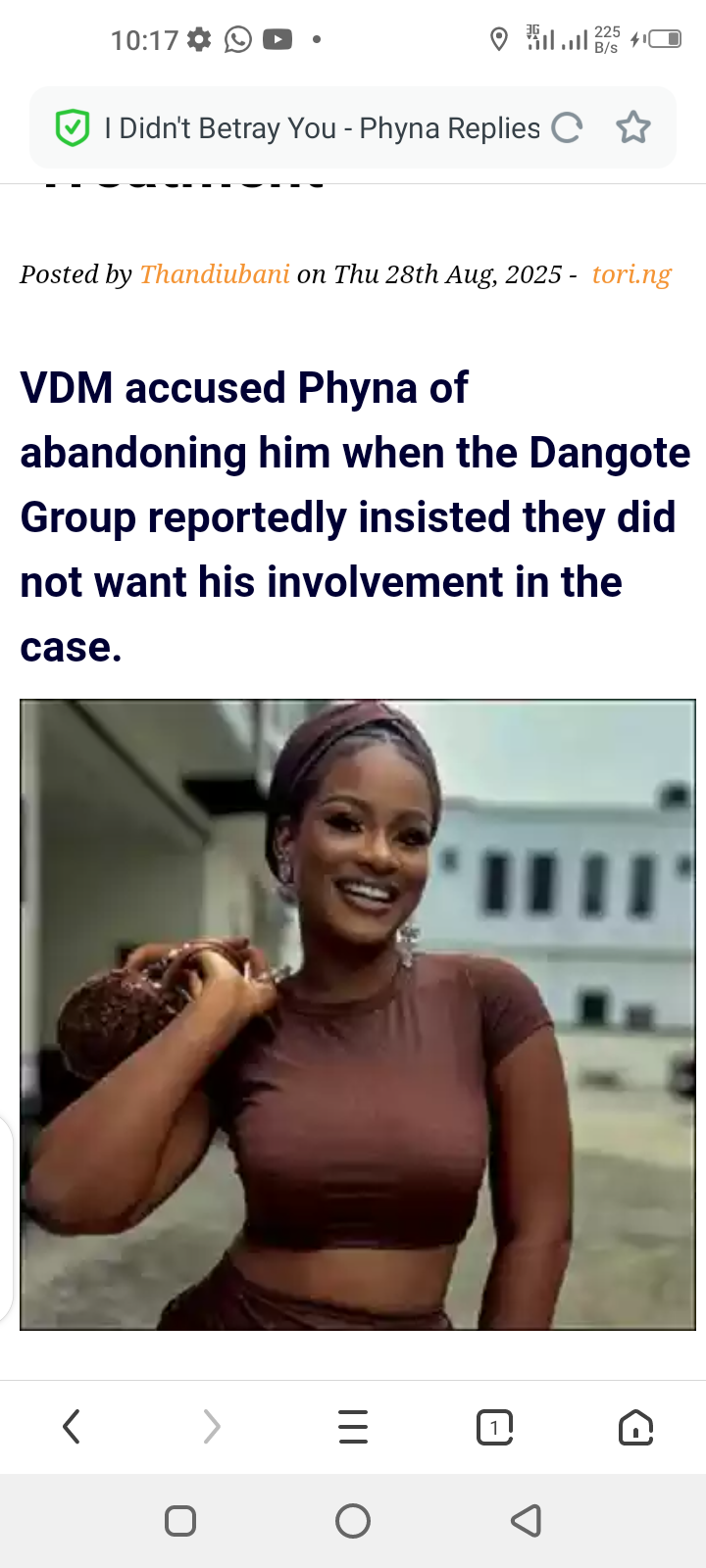 I Didn’t Betray You – Phyna Replies VeryDarkMan Over Campaign for Sister’s Treatment Posted by Thandiubani on Thu 28th Aug, 2025 – tori.ng VDM accused Phyna of abandoning him when the Dangote Group reportedly insisted they did not want his involvement in the case.  Reality TV star, Phyna has replied activist VeryDarkMan (VDM) after he accused her of betraying him. According to VDM, she sidelined him after initially using his influence to raise awareness about her sister’s medical condition. He went further to reveal that Phyna took the decision after Dangote Group reportedly insisted they did not want his involvement in the case. Reacting to the allegation, Phyna insisted that she never betrayed VDM. According to her, she has been reaching out to VDM, but he has refused to answer his call. She said: “Which one is betrayal? I have been calling, he hasn’t been picking, he’s not replying my messages. What could I have done? I thought he was busy.”  Popular Stories Awesome! See the Super Brilliant 18-Year-Old Nigerian Girl Who Made History as 11 Universities Offer Her Scholarship So Touching: See Heart-warming Photos of a Beautiful Lady on a Wheelchair (Photos) Want to Conceive Twin Babies? These are the Best S*x Positions to Help You Achieve Your Aim Today June 12 Flashback: Read MKO Abiola’s Speech on Not Surrendering His Mandate Warning! You Can Get These Deadly Diseases Through Kissing Copyright © 2025 Tori.ng – All rights reserved Tori.ng is owned and managed by Cyclofoss Technologies Ltd.