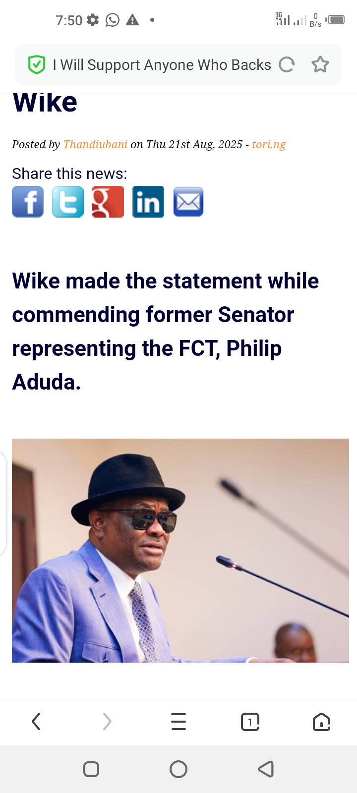 I Will Support Anyone Who Backs Tinubu – Wike Posted by Thandiubani on Thu 21st Aug, 2025 – tori.ng Share this news:      Wike made the statement while commending former Senator representing the FCT, Philip Aduda.  The Minister of the Federal Capital Territory, Nyesom Wike has pledged to give his support to President Bola Tinubu. This is as he also called on residents of Abuja to support Tinubu, stating that he will support anyone who supports Tinubu. Wike made the statement while commending former Senator representing the FCT, Philip Aduda, and the Chairman of the Abuja Municipal Area Council, Christopher Maikalangu, during the flag-off of Lot 2 of Water Supply Projects in Karu, on Thursday. The minister hailed both men for their capacity and for bringing development to the people, while promising the construction of a 2km road in Karu site, on the request of Aduda, adding that he will support those who continue to support the Tinubu-led administration. He further commended the AMAC Chairman, Maikalangu, as “very good and hardworking”, noting that the latter had used his access to government to deliver several projects to his residents in the area council, adding that his administration will do, whatever he asked if he (Maikalangu) won his re-election bid as council chairman. “There is a road where you said is about 2km, is it not? Consider it done. You know, one thing about government and politics, support those who have capacity to bring something to the people. Support those that government will listen to. “From what happened now, you see that Aduda, government has his ear where he is. And that’s why government said where is that road he mentioned? Consider it done. “You can see that since he (Maikalangu) became the Chairman of AMAC, he has brought government to do Saburi Road, he has brought the government to do Kabusa-Takushere Road, he has brought government to redo this road. He has brought government to do Deidei Road. “For me, I’m here to talk about those who have access to government and bring something to the people. “The chairman has access to us. Anything he tells us, we will do. This is the only man I know. If he wins as chairman of AMAC, we will give him whatever he wants. I don’t know the party he belongs to. But I know that he supports Tinubu. Anybody who supports Tinubu, I will support him,” Wike said. The minister pointed out that past governments had failed to provide the needs of the people, particularly water supply to the communities in Karu, noting that the government of Tinubu has fulfilled its promise to provide potable water to satellite towns. “We have had a government who stayed here for five years, isn’t that correct? We have had a government who stayed here for eight years too, is that correct? Has any government come to say, look, we will provide you water? Have you had water before? Did this government promise it will give you water? Have we come now to give you water? “So, you believe you have a covenant with this government. And the covenant is like somebody said, agreement is agreement. So, the people of Karu, you will readily remember the government that remembers you, is it not correct? “Will you remember those who had the opportunity and they refused to do anything for you? Will you remember those who left Karu unattended, will you remember them? So, we have come to fulfil the promise we made to you, that you must have clean and potable water,” he stated. PUNCH Online reports that Aduda represented the FCT on the platform of the Peoples Democratic Party between 2011 and 2015, and was re-elected in 2015 and again in 2019, before losing the seat in the 2023 general elections. Meanwhile, Maikalangu is seeking re-election as Chairman of AMAC in the forthcoming February 2026 Area Council elections, on the platform of the ruling All Progressives Congress, after defecting from the PDP in 2024.
