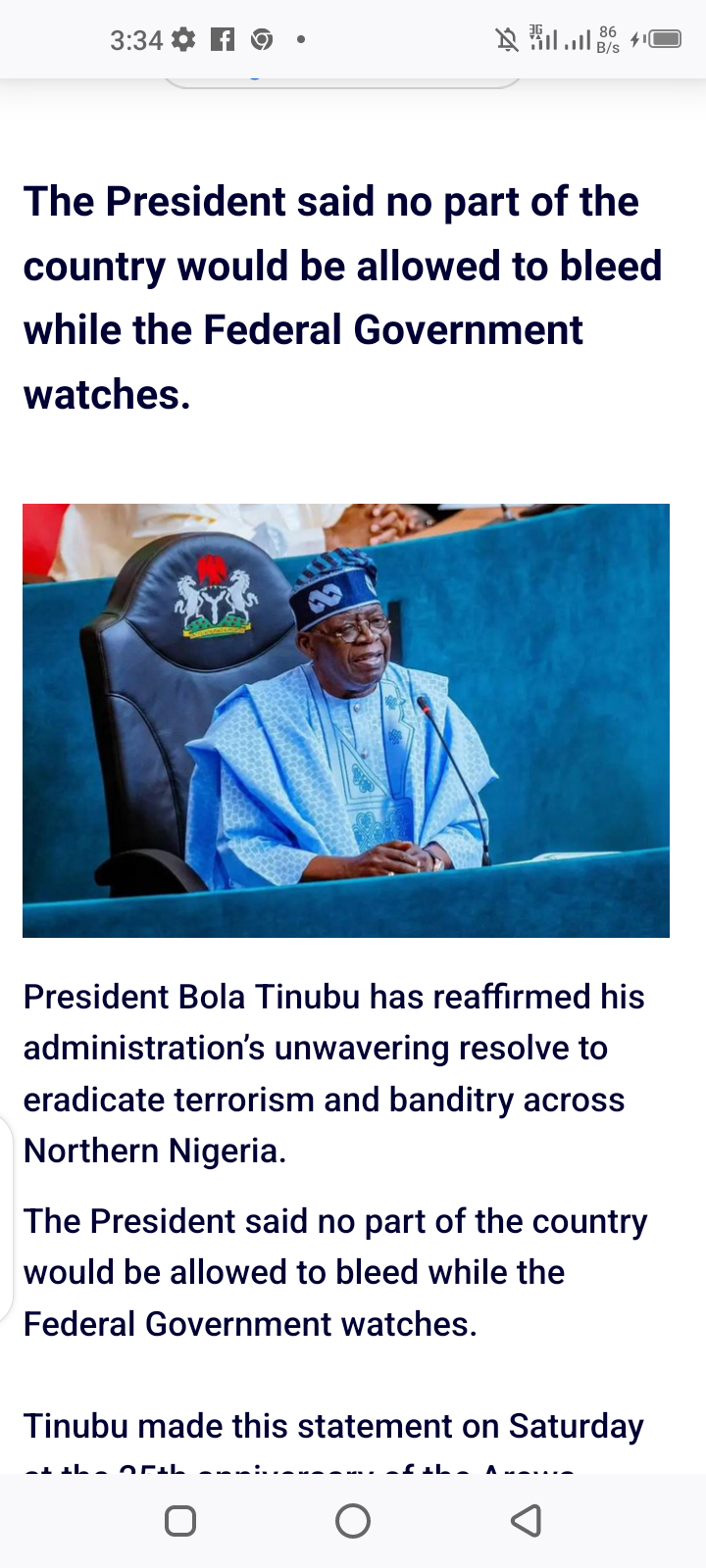I Won’t Let North Bleed Further — Tinubu Vows Posted by Samuel on Sun 23rd Nov, 2025 – tori.ng Share this news: Facebook Twitter Goodle LinkedIn Email Discover more Nollywood movie streaming service Nollywood Actor News Cryptocurrency investment guide Student Innovation Grants Military Conflict News Wildlife Trafficking News Travel packages to Nigeria Politics News Service Legal advice services The President said no part of the country would be allowed to bleed while the Federal Government watches. Bola Tinubu President Bola Tinubu has reaffirmed his administration’s unwavering resolve to eradicate terrorism and banditry across Northern Nigeria. The President said no part of the country would be allowed to bleed while the Federal Government watches. Tinubu made this statement on Saturday at the 25th anniversary of the Arewa Consultative Forum, ACF, in Kaduna. The President was represented at the event by the Speaker of the House of Representatives, Tajudeen Abbas. Tinubu said he inherited a daunting security situation but remains committed to restoring safety. The Nigerian leader further said that his administration would reverse the prolonged economic decline of the region. He cited the anticipated rollout of crude oil from the Kolmani fields and other emerging prospects as opportunities for economic renewal. “I won’t allow the Northern Nigeria to continue to bleed. I will tame the insecurity menace,” Tinubu said. Share on WhatsApp Share on Telegram Share this news: Facebook Twitter Goodle LinkedIn Email Discover more Aviation Regulation Updates Nigerian news subscription service Nigerian cuisine cookbook Military Conflict News Relationship coaching service Lifestyle News Content Romance Advice Column Student Innovation Grants Travel packages to Nigeria Recent News This Kind Of Love Is Not Ordinary – Actress Folorunsho Adeola Reacts After Family And Friends Gifted Her N11 Million On Her Birthday Published on Sun 23rd Nov, 2025 85-Year-Old Nigerian Woman, ‘Ego Na Money’ Gets Buried Inside A Coca-Cola Bottle-Shaped Casket In Bayelsa (Photos+Video) Published on Sun 23rd Nov, 2025 Nigerian Singer, 2baba And His Wife, Natasha Welcome Their First Child, Reveal Baby’s Gender Published on Sun 23rd Nov, 2025 5 Years Ago, We Agreed To Do Life – Williams Uchemba Hails Wife As They Celebrate 5th Wedding Anniversary Published on Sat 22nd Nov, 2025 I’m Really Angry Over Christian Genocide In Nigeria – Donald Trump Declares, Hints At Next Move Published on Sat 22nd Nov, 2025 Latest News BREAKING: 50 Abducted Niger Catholic School Students Escape, Reunite With Families — CAN Published on Sun 23rd Nov, 2025 This Kind Of Love Is Not Ordinary – Actress Folorunsho Adeola Reacts After Family And Friends Gifted Her N11 Million On Her Birthday Published on Sun 23rd Nov, 2025 How Nnamdi Kanu’s Trial Was Derailed By Amateur Lawyers – Ex-Lead Counsel, Ejiofor Opens Up Published on Sun 23rd Nov, 2025 Traffickers Now Conceal Hard Drugs In Flight Boarding Passes – NDLEA Raises Alarm Published on Sun 23rd Nov, 2025 Actress Folorunsho Adeola Breaks Down In Tears As Friends And Family Surprise Her With N11 Million On Her 40th Birthday (Video) Published on Sun 23rd Nov, 2025 I Won’t Let North Bleed Further — Tinubu Vows Published on Sun 23rd Nov, 2025 Regina Daniels Had Drinks And Drugs In This Particular Hotel – Ned Nwoko Makes Startling Revelation During Hangout In Abuja (Video) Published on Sun 23rd Nov, 2025 It Is A Deliberate Attempt To Weaponise My Name – Akpabio Aide Distances Self From Forged Document Published on Sun 23rd Nov, 2025 The Heartwarming Moment Chioma Gifted Davido A Hermes Bag For His 33rd Birthday (Video) Published on Sun 23rd Nov, 2025 Why Atiku, Obi Were Absent At Secretariat Unveiling – ADC Published on Sun 23rd Nov, 2025 85-Year-Old Nigerian Woman, ‘Ego Na Money’ Gets Buried Inside A Coca-Cola Bottle-Shaped Casket In Bayelsa (Photos+Video) Published on Sun 23rd Nov, 2025 Nigerian Singer, 2baba And His Wife, Natasha Welcome Their First Child, Reveal Baby’s Gender Published on Sun 23rd Nov, 2025 DHQ Reacts To Reports That It Is Planning To Forcibly Recruit Young Nigerians Into Military Published on Sun 23rd Nov, 2025 Senator Ned Nwoko Shares Post About Women Who Betray Good Men Amid Ongoing Marital Drama With Actress Regina Daniels Published on Sun 23rd Nov, 2025 Christian Genocide: Nigerian Delegation To US Is Intensely Addressing False Narrative – FG Says Published on Sun 23rd Nov, 2025 0 1 2 Older » Popular News The Grass-To-Grace Story How A Poor School Teacher, Jack Ma Became A Billionaire Nobody Ugly: These Epic Throwback Pictures Of Nigerian Celebrities Will Totally Make Your Day The Inspiring Love Story of a Mad Couple Who are Married for 22 Years with 3 Children Meet the 37-year-old Woman Who Has Given Birth to 38 Children After Starting at Age 13 (Photos) My Pastor Told Me to Be Drinking My Wife’s Urine, But He was Sleeping with Her – Nigerian Man Opens Up The Story of Shina Rambo: The Most Notorious Armed Robber Who Sent Shivers Down the Spine of Nigerians (Photos) Nigerian Pastor Who Sucks Women’s Breasts to Deliver Them, Gets Busted on Radio Show (Listen to Audio) Woman Claims She was Raped, Impregnated by a Pig Rihanna LookAlike Makes Money From Her Looks Nigerian Medical Doctor Who Survived Ebola, Tells Her Story – A gripping read Sports 2025 CAF Awards: Osimhen, Salah Lose As Hakimi Is Crowned Player Of The Year Super Eagles: Captain Troost-Ekong Is Considering International Retirement You Don’t Have Electricity And You Want To Go To The World Cup – Ghanaian YouTuber, Sheldon Mocks Nigeria (Video) Nigerian Actor Lege Miami Apologies To Stanley Nwabali, Says He Was Only Correcting Him (Video) I’ll Beat You Mercilessly – Stanley Nwabali Warns Lege Miami Against Disrespecting Late Dad Tech Facebook, Instagram Users to Pay £2.99 For Monthly Subscription Apple Launches iPhone 17 Pro XRP is expected to break thro