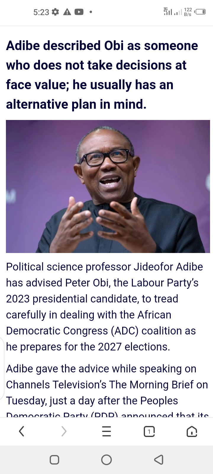 If I Were Him, I Would Be Extremely Suspicious – Adibe Warns Obi On ADC Coalition Posted by Samuel on Wed 27th Aug, 2025 – tori.ng Adibe described Obi as someone who does not take decisions at face value; he usually has an alternative plan in mind.  Political science professor Jideofor Adibe has advised Peter Obi, the Labour Party’s 2023 presidential candidate, to tread carefully in dealing with the African Democratic Congress (ADC) coalition as he prepares for the 2027 elections. Adibe gave the advice while speaking on Channels Television’s The Morning Brief on Tuesday, just a day after the Peoples Democratic Party (PDP) announced that its 2027 presidential ticket would be zoned to the South. “I wouldn’t want to advise Peter Obi; he has his own advisors. At the end, he has to make his own decisions, but if I were him, I would be extremely suspicious,” Adibe said. Adibe described Obi as someone who does not take decisions at face value; he usually has an alternative plan in mind. According to him, every political move requires careful thought. He explained that it was Obi’s responsibility to listen to his political strategists and weigh their advice, noting that every major political announcement usually sets off different scenarios and calculations The professor added that politics in Nigeria is unpredictable. He likened the political situation to a chess game, saying outcomes are uncertain. Popular Stories From Allen Avenue to Snapchat Prostitute: The Evolution of the Nigerian Commercial S*x Worker Mysterious! Boy Found Alive Buried in the Middle of Moulded Wall in Ondo State (Photos) Oh No! See Hero Dog That Sacrificed Its Life to Save Family By Killing Four Deadly Cobras (Photo) Unbelievable! The World’s Largest Aircraft is as Big as a Stadium and It’s Ready to Take its First Test Flight (Photos) So Hilarious! See Throwback Photos of Nigerian Celebrities Before the Money and Fame Copyright © 2025 Tori.ng – All rights reserved Tori.ng is owned and managed by Cyclofoss Technologies Ltd.
