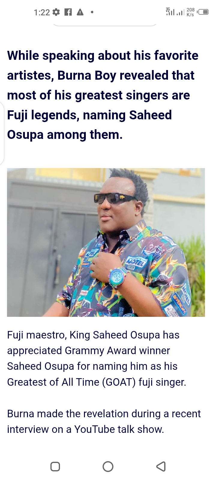 Menu Discover more Nigerian political history book Video content creation Metro news service Wedding anniversary features Nigerian travel guide Newspaper advertising space Romance novel recommendations Sports event tickets Weird news compilation I’m Profoundly Grateful – Saheed Osupa Celebrates As Burna Boy Names Him as His Greatest of All Time Singer Posted by Thandiubani on Thu 25th Sep, 2025 – tori.ng Share this news: Discover more True crime documentary Video content creation Relationship advice book Sports team merchandise Financial news subscription Celebrity birthday features Metro news service Entertainment news alerts Political commentary World news analysis While speaking about his favorite artistes, Burna Boy revealed that most of his greatest singers are Fuji legends, naming Saheed Osupa among them. Fuji maestro, King Saheed Osupa has appreciated Grammy Award winner Saheed Osupa for naming him as his Greatest of All Time (GOAT) fuji singer. Burna made the revelation during a recent interview on a YouTube talk show. When asked about his favorite artistes, Burna Boy revealed that most of his greatest singers are Fuji legends, naming Saheed Osupa among them. Following the revelation, Osupa took to his Instagram page to acknowledge Burna Boy. Saheed Osupa wrote: “Burna Boy’s heartfelt tribute, naming me as his GOAT singer on a global stage, is a monumental moment that celebrates the soul of Fuji music and its timeless influence. This honour, not only, uplifts my journey, but also, shines a brilliant light on our rich cultural heritage, bridging generations and genres worldwide. I am profoundly grateful for this powerful acknowledgment from a true Afropop titan, the African Giant himself, of whom I am also a great fan. Together, we are redefining African music legacy and inspiring the world with authentic, vibrant sounds. To Oluwa Burna and every music lover embracing our story – thank you for believing in the magic of Fuji. Thank you for believing in Africa’s ingenious creativity. I look forward to attending one of your upcoming concerts to appreciate your God-given talents and reciprocate your genuine love and affection. Keep prospering my beloved Burna @burnaboygram 🙏🙏🙏. The journey continues, stronger and more radiant than ever! Oba Orin 👑👑👑.” Share this news: Discover more Current events newsletter Celebrity gossip magazine True crime stories Lifestyle blog subscription Local metro news app Nigerian celebrity gossip Sports event tickets Technology gadget reviews World news summaries Metro news service Recent News Jonathan: Pot Calling Kettle Black, Otedola Should Come Clean – Former Presidential Aide Published on Thu 25th Sep, 2025 You Constitute Nuisance – Peter Obi Slams Nigerian Leaders Over Display Of Power, Shares Experience Published on Thu 25th Sep, 2025 Family Of Five Found Unconscious, One D3ad In Benue (Photos) Published on Thu 25th Sep, 2025 Outstanding Goal – Celtic Coach Rodgers Hails Kelechi Iheanacho After His UEL Goal Published on Thu 25th Sep, 2025 2027: Playing Ethnic Card Won’t Work – Abati Slams Atiku Over ‘Yoruba’ Comment Published on Thu 25th Sep, 2025 PROMOTED CONTENT Cardizoom The Worst Enemy Of Hypertension. Read This Before It’s Removed Volmix People With Knee And Hip Pain Should Read This! Joint Everyone Who Suffers From Back Pain Read This Slim Weight Of 90 Kg Will Drop To 50 Kg! Take 1 Drop In The Morning Proman Do This Every Night And Your Prostate Will Be Restored In 5 Days! BitDelta Pro Markets In Chaos? Anchor In Gold Proman 5 Times Stronger Than Viagra! “It Is Sold In Every Pharmacy!” Xenoprost Active Natural Yet Very Effective! Provides Immediate Results CardiZoom Nigerian Secret To Normalizing Blood Pressure In 7 Days Latest News I’m Profoundly Grateful – Saheed Osupa Celebrates As Burna Boy Names Him as His Greatest of All Time Singer Published on Thu 25th Sep, 2025 Burna Boy Snubs Messi, Ronaldo, Names Three Players Who Are Football GOATs Published on Thu 25th Sep, 2025 Jonathan: Pot Calling Kettle Black, Otedola Should Come Clean – Former Presidential Aide Published on Thu 25th Sep, 2025 Religion Can’t Separate Me From Lateef Adedimeji – Singer Sola Allyson To Critics Published on Thu 25th Sep, 2025 You Constitute Nuisance – Peter Obi Slams Nigerian Leaders Over Display Of Power, Shares Experience Published on Thu 25th Sep, 2025 Erica Nlewedim Threatens to Relocate to Ghana Over Lagos Flooding Published on Thu 25th Sep, 2025 Rivers: Adeyanju Drags Ibas Before ICPC Over N283 Billion Spending Published on Thu 25th Sep, 2025 It’s Just Mad – Ndume Slams Tinubu Over Declaration Of Emergency Rule In Rivers Published on Thu 25th Sep, 2025 I Feel Guilty Everyday For Not Fulfilling My Late Mother’s Wish – Cubana Chiefpriest Published on Thu 25th Sep, 2025 How Scammers Sold Fake Luxury Watch Worth ₦250 Million To Plateau Ex-Governor, Joshua Dariye Published on Thu 25th Sep, 2025 I’ve Been Through a Lot, I Used to Live in a Hut – Skales Published on Thu 25th Sep, 2025 Mob Burns Woman to D3ath After Accusing Her of Kidnapping 7-year-old Boy in Delta Community Published on Thu 25th Sep, 2025 Police Arrest Two For Alleged Self-Kidnapping in Niger State Published on Thu 25th Sep, 2025 President Tinubu Summons Ibas, Ex-Rivers Administrator to Aso Rock Published on Thu 25th Sep, 2025 I Regret Winning Wimbledon at 17 – Six-time Grand Slam Champion, Boris Becker Published on Thu 25th Sep, 2025 0 1 2 Older » Popular News Check Out Wierd Traditions Across Africa (Photos) 11 Nigerian Pastors Who Were Accused Of Adultery – No. 3 & 6 Cases Shook Nigeria Lady Investigates Her Boyfriend To See If He’s Faithful, And The Outcome Is Shocking (See Leaked Chats) Nobody Ugly: These Epic Throwback Pictures Of Nigerian Celebrities Will Totally Make Your Day Get Information on Any Registered Vehicle by Just Visiting this Website Created by Lagos State Government Hilarious Posters! Which