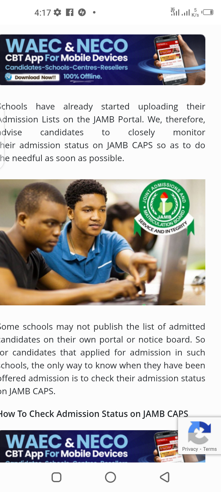 ” Home JAMB News JAMB CAPS For 2025/2… JAMB CAPS for 2025/2026 admission – monitor & confirm your admission status Posted by Myschool Paul 16th September, 2025 | 134 Comments JAMB News The JAMB CAPS for the 2025/2026 admission exercise is active. Candidates can now monitor their admission status and easily know when they have been offered admission. Once a candidate has been offered admission on JAMB CAPS, such candidate is required to do either of two things; to accept the admission or to reject it. Schools have already started uploading their Admission Lists on the JAMB Portal. We, therefore, advise candidates to closely monitor their admission status on JAMB CAPS so as to do the needful as soon as possible. Some schools may not publish the list of admitted candidates on their own portal or notice board. So for candidates that applied for admission in such schools, the only way to know when they have been offered admission is to check their admission status on JAMB CAPS. How To Check Admission Status on JAMB CAPS Visit: https://efacility.jamb.gov.ng/ and login with your registered email address and password to access your dashboard Click on ‘Check Admission Status, Click on ‘Access my CAPS’ Click on ‘Admission Status’ to see if you have been offered admission. If you have been admitted you will get a response with your Photo Image being displayed and a text Congratulating you on your admission offer, But if you are not offered any admission yet you will get a text response with “Sorry No Admission has been Given Yet” If you have been offered admission, you can proceed to Accept or Reject the admission by sending ACCEPT or REJECT as SMS to 55019 or 66019 using the specific Phone number linked to your JAMB profile Candidates have 4 weeks to accept the offer of admission..Those who do not have their registered phone numbers are to visit a JAMB accredited centre to Accept or Reject. It is important to note also that candidates who have been offered admission are to print their admission letter after accepting the admission, as they will likely need this during clearance and registration in the school that they have been admitted. Note: If you are using a phone, you may not see the option to check Admission Status on CAPS, Most phone users may only see the welcome message. You are to use the desktop mode to view the complete page. This is why the chrome browser is recommended if you are using a phone. All you need to do is go to Chrome option and choose request desktop site for the complete page to display. If you’ve received a confirmation of admission on JAMB CAPS, kindly let us know in the comments section. This will help inform other candidates who are still waiting for admission offers from the same institution, so they can also check their status. To maintain credibility, you may include a screenshot of your admission offer. However, please ensure that any sensitive information such as your name, contact details, registration numbers, or other personal identifiers is covered or blurred out. Our goal is simply to help verify and confirm that a particular institution has begun releasing admission offers on JAMB CAPS. 303 Shares Related Posts JAMB directs candidates to re-upload O’level results JAMB reactivates portal for uploading O’level results JAMB admission deadlines for 2025/2026 JAMB suspends upload of O’level results, says the process will resume soon Comments (134) « 1 2 3 4 » BELLA 1 month ago what of uniport Like 4 Dislike 0 Reply Quote Follow Bobbyo : they have not started Like 1 Dislike 1 1 month ago Isaac : Just give them sometime I too applied for uniport Like 0 Dislike 0 4 weeks ago Loladiamond : Abi, hi Like 0 Dislike 0 3 weeks ago Enoch : have NDU started admission Like 1 Dislike 0 1 week ago Ibrahim 1 month ago what if one has forgotten the email he has registered with Like 3 Dislike 4 Reply Quote Follow Nanribeth : go jamb office Like 1 Dislike 0 1 month ago Blessing : it’s on your jamb registration slip, that first paper they gave you after registering Like 1 Dislike 0 1 month ago Diamond : use ur sim and test 55019, forgetting password write down the email Like 1 Dislike 0 1 week ago Yusuf 1 month ago unijos how far Like 1 Dislike 0 Reply Quote Follow Adegoke 1 month ago FUNAAB! Like 3 Dislike 0 Reply Quote Follow Hilary 1 month ago has FUTO started admission ‼️ Like 1 Dislike 0 Reply Quote Follow Official Prince : lol they haven’t even finished putme registration Like 0 Dislike 0 4 weeks ago Hilary : can we chat on WhatsApp Like 0 Dislike 0 4 weeks ago Chinedu 1 month ago I know they would alert us when it’s out, using notifications. you just have to stay alert Like 1 Dislike 0 Reply Quote Follow Gift 1 month ago Congratulations to Me got Admission into the University to Study Nursing. The University is located in Awka Anambra State and I’VE ACCEPTED the Admission. Like 42 Dislike 0 Reply Quote Follow serifat : congratulations Like 4 Dislike 0 1 month ago Praise : congratulations Like 4 Dislike 0 1 month ago Favour : Congratulations🎉 Like 3 Dislike 0 1 month ago Enoch : congratulations dear Like 2 Dislike 0 1 month ago Lawan Modu Yerima : congratulations Like 2 Dislike 0 1 month ago Success : congratulations Like 2 Dislike 0 1 month ago Gift : Thank you Everyone. Like 1 Dislike 0 4 weeks ago Mfoniso Simple : Congratulations to me I’ve got admission into the university to study microbiology The university is located at Akwa ibom state Like 8 Dislike 0 4 weeks ago God’s favor : congratulations 👍👍👍👍 Like 1 Dislike 0 4 weeks ago ogwuche : congrats Like 1 Dislike 0 4 weeks ago Mfoniso Simple : Please how can i view my admission letter from the jamb caps? Like 1 Dislike 0 4 weeks ago Success : Congrats whats the name of the uni Like 1 Dislike 0 4 weeks ago q8Becky : Mfoniso please which university in Akwa Ibom is that? Like 1 Dislike 0 4 weeks ago Tim : congratulations Like 2 Dislike 0 4 weeks ago komolafe Jami