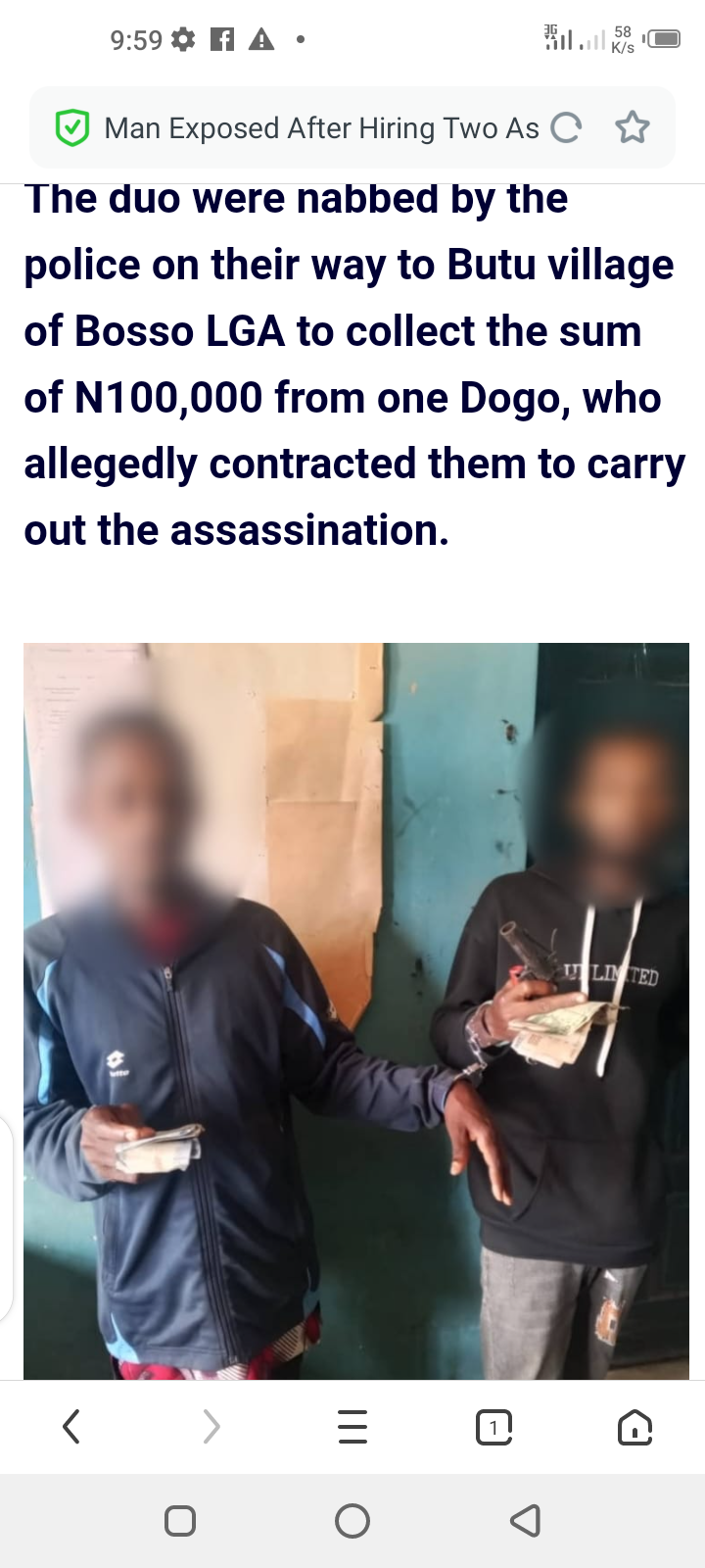 Man Exposed After Hiring Two Assassins To K!ll Another Man Who Married His Ex-Wife In Niger Posted by Samuel on Sat 30th Aug, 2025 – tori.ng Share this news:      The duo were nabbed by the police on their way to Butu village of Bosso LGA to collect the sum of N100,000 from one Dogo, who allegedly contracted them to carry out the assassination.  The two men who were hired to carry out the act The Niger State Police Command has arrested two suspects, Muhammad Mohammed and Mohammed Usman, over their alleged involvement in an assassination plot. The duo were nabbed by the police on their way to Butu village of Bosso LGA to collect the sum of N100,000 from one Dogo, who allegedly contracted them to carry out the assassination. The Police Command in a statement issued by the Public Relations Officer, SP Wasiu Abiodun, in Minna, said the two were intercepted on August 23, 2025. Abiodun said the suspects reportedly confessed to being hired by the said Dogo to k!ll a man who married his ex-wife. The police spokesman said, “On 23/8/2025 at about 12:45 am, police patrol team with vigilante members stationed at Railway Crossing, Beji, Maikunkele area of Bosso LGA, intercepted two persons, namely Muhammad Mohammed, 40, and Mohammed Usman 35, both of Beji. “During interrogation both suspects confessed that they were hired by one Dogo of Beji to assassinate a person around railway crossing area in the area, and they were on their way to collect the service charge of N100,000 from Dogo before being arrested.” The police spokesman explained that the suspects further claimed that Dogo initially gave them the sum of N13,000 as transport fee, while they charged him N100, 000 for the ‘job’. Abiodun further disclosed that the suspects insisted that they would collect the money before carrying out the task. “Preliminary investigation revealed that Dogo intended to k!ll the fellow because he married his ex-wife,” the police further disclosed. Items recovered from them include a locally made pistol and live ammunition. The suspects were taken into police custody in Maikunkele Division for preliminary investigation and were later transferred to SCID for discreet investigation and prosecution. Meanwhile, efforts to apprehend the said Dogo, the alleged mastermind, have intensified.