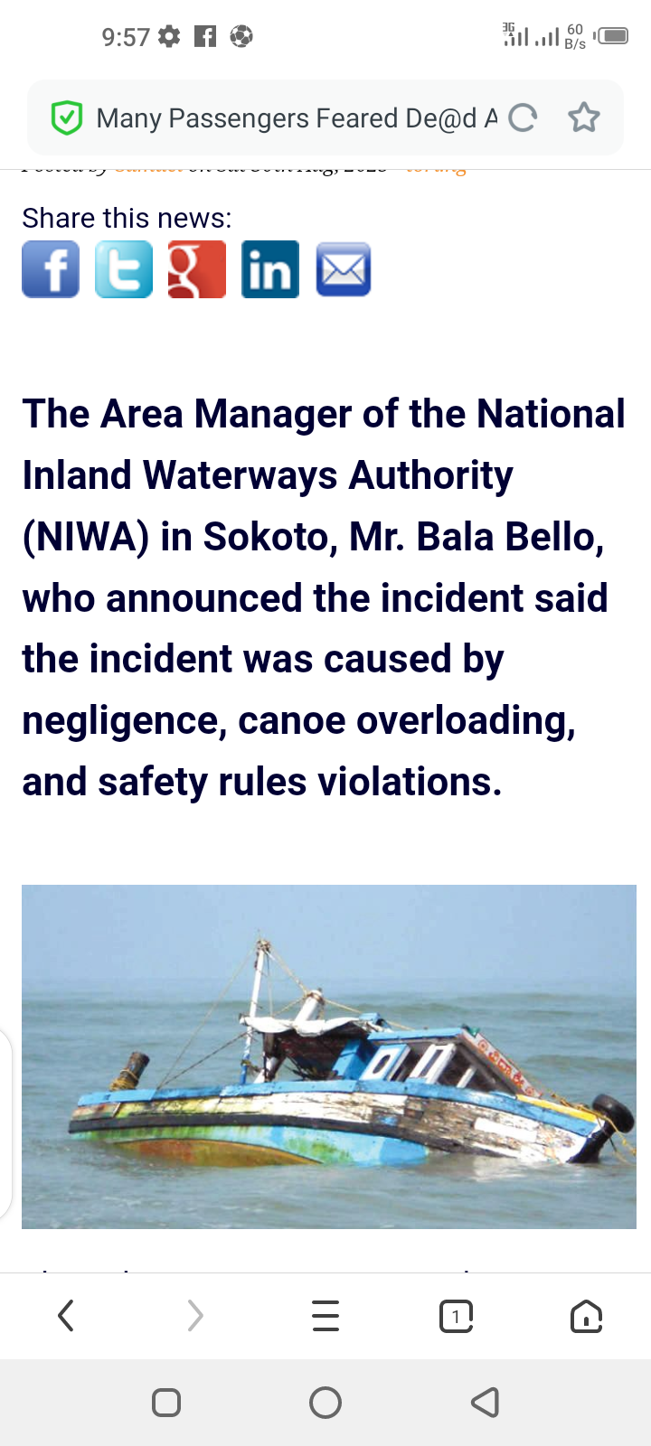 Many Passengers Feared De@d After Another Boat Accident In Sokoto State Posted by Samuel on Sat 30th Aug, 2025 – tori.ng Share this news:      The Area Manager of the National Inland Waterways Authority (NIWA) in Sokoto, Mr. Bala Bello, who announced the incident said the incident was caused by negligence, canoe overloading, and safety rules violations.  The Sokoto State Government has reported another tragic boat accident in Shagari Local Government Area, with many passengers feared de@d. Governor Ahmed Aliyu who announced the unfortunate incident on Friday to journalists, through his Special Adviser at the Sokoto State Emergency Management Agency (SEMA), Aminu Bodinga, said the incident happened on Thursday, when the boat capsized, throwing everyone on board into the river. “We’ve dispatched officials to the scene, and they’re working with NEMA and National Inland Waterways Authority (NIWA) to rescue survivors and recover victims,” Bodinga said. However, the exact number of casualties remains unknown, with locals fearing most passengers might not have survived. This incident marks the third boat accident in the state within a short period. SaharaReporters reported on August 24, that six people d!ed and three others went missing, while 19 were rescued after a fatal boat accident in the Sabon Birni Local Government Area on August 22. The Area Manager of the National Inland Waterways Authority (NIWA) in Sokoto, Mr. Bala Bello, who announced the incident said the incident was caused by negligence, canoe overloading, and safety rules violations. SaharaReporters on August 13 reported that a boat mishap in Dundaye community, located in Wamakko Local Government Area of the state, reportedly claimed no fewer than four lives. The incident was confirmed by the Head of the Sokoto Field Operation Office of the National Emergency Management Agency (NEMA), Alhaji Aliyu Kafindangi. In June 2025, seven people lost their lives in a canoe accident while traveling from Gidan Husaini to Gwargawu village in Kambama ward of Shagari Local Government Area of the state. The victims were said to be on a routine trip across the river when the canoe capsized, leading to the accident. Meanwhile, rescue operations are ongoing, with SEMA, NEMA, and NIWA working together to locate missing passengers. “Our rescue teams are on the ground, working with local divers to account for every passenger. For now, we cannot give a definitive figure until operations are concluded,” Bodinga stated. The recurring accidents have raised concerns about water safety in the region. Maritime experts attribute these incidents to poor safety practices, overloading, and lack of life jackets for passengers. The Sokoto State government is expected to release a comprehensive statement once rescue and recovery efforts are concluded.