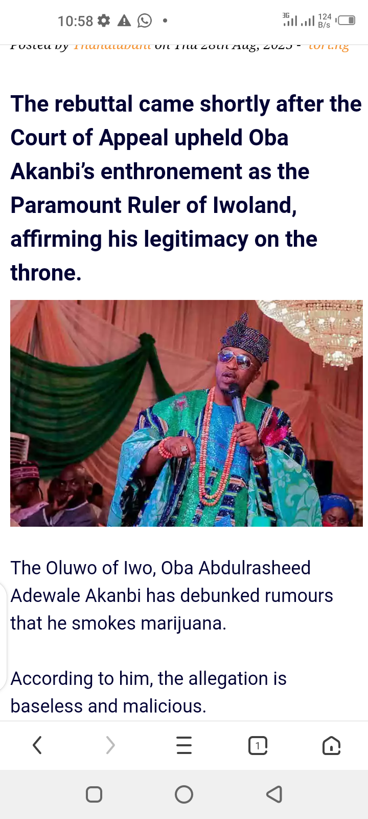 May God Remove Me From This Throne If I Smoke Marijuana – Oluwo Replies Accusers Posted by Thandiubani on Thu 28th Aug, 2025 – tori.ng The rebuttal came shortly after the Court of Appeal upheld Oba Akanbi’s enthronement as the Paramount Ruler of Iwoland, affirming his legitimacy on the throne.  The Oluwo of Iwo, Oba Abdulrasheed Adewale Akanbi has debunked rumours that he smokes marijuana. According to him, the allegation is baseless and malicious. The monarch, in a viral video addressing a public gathering, dissociated himself from the rumour and invoked curses on those spreading it. Oba Akanbi said the allegation was fabricated by what he called “unfortunate individuals” and vowed that divine punishment would befall them. “They are lying against me. They are unfortunate people. Unless I am smoking marijuana. If I’m a smoker, God should remove me from this throne. You, who are accusing me of being a smoker, God will punish you,” the monarch declared. The rebuttal came shortly after the Court of Appeal upheld Oba Akanbi’s enthronement as the Paramount Ruler of Iwoland, affirming his legitimacy on the throne. The monarch expressed joy over the ruling, stressing that his reign was divinely ordained and could not be undone by human effort. “My throne is from God. No man can undo what God has established,” he said. Oba Akanbi maintained that the smear campaign would not distract him from his duties as king, noting that his focus remained on promoting peace and development in Iwoland. “The accusations are nothing but lies meant to tarnish my name, but they cannot shake what God has already blessed,” he added. Popular Stories List of Things You Are Entitled to by Law From Your Employer Touching Story of ‘Big Booty’ African Slave, Sara Baartman Who was Abused by Europeans and Used as a Circus Animal (Photo) Unbelievable! Meet the Man With 27 Wives and 145 Children Living Large Like a King (Photos) Hungry Python Swallows Porcupine for Dinner, and Guess What Happened, See the Revenge Too Fat To Travel – Turned Down by Planes, Trains and even Cruise Ships Copyright © 2025 Tori.ng – All rights reserved Tori.ng is owned and managed by Cyclofoss Technologies Ltd.