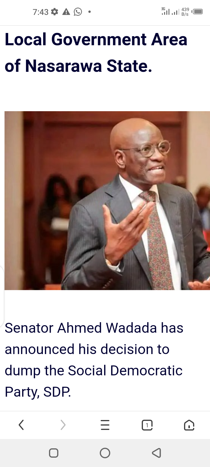 Nasarawa West Senator Ahmed Wadada Resigns From SDP Posted by Thandiubani on Thu 21st Aug, 2025 – tori.ng Share this news:      He conveyed this in a letter directed to the Chairman of the SDP, Tudun Ward, in Keffi Local Government Area of Nasarawa State.  Senator Ahmed Wadada has announced his decision to dump the Social Democratic Party, SDP. Wadada currently represents Nasarawa West in the Senate. He conveyed this in a letter directed to the Chairman of the SDP, Tudun Ward, in Keffi Local Government Area of Nasarawa State. According to the News Agency of Nigeria, the letter, dated Thursday, was titled “Notification of Resignation from the Social Democratic Party (SDP).” It read, “I am writing to inform you of my decision to resign as a member of the Social Democratic Party (SDP), effective immediately. “This decision has not been taken lightly but I feel compelled to do so due to the lingering internal crisis that has plagued our party for some time. “As you are aware, these internal conflicts have led to serious division and litigations within the party. “I appreciate the opportunities given to me while been a member of the Social Democratic Party (SDP) and grateful for the experiences and relationship built. “However, I feel it is time for me to move on and explore new avenues.” This development follows Wadada’s recent remarks expressing support for President Bola Tinubu’s administration. After his visit to the State House, the senator refuted suggestions that the African Democratic Congress could present a leader who would outperform Tinubu’s achievements. Wadada also suggested the possibility of rejoining the All Progressives Congress, noting that he had earlier served as a national officer of the Peoples Democratic Party before moving to the APC and subsequently the SDP. He emphasized that his exit from the SDP was not driven by any dispute with the party but rather by what he described as “the dynamism of life.”