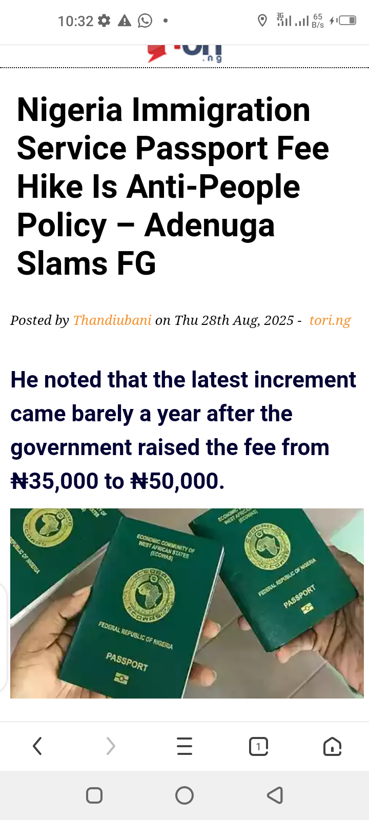 Nigeria Immigration Service Passport Fee Hike Is Anti-People Policy – Adenuga Slams FG Posted by Thandiubani on Thu 28th Aug, 2025 – tori.ng He noted that the latest increment came barely a year after the government raised the fee from ₦35,000 to ₦50,000.  A Bauchi-based social commentator, David Adenuga has lashed out at the Nigeria Immigration Service, NIS. This followed NIS’ decision to increase the cost of obtaining international passports to N100,000 from N50,000. Adenuga described the decision as “another anti-people policy”. In a statement issued on Thursday Adenuga said the hike of passport fees – from ₦50,000 to ₦100,000 for a 32-page booklet with five-year validity, and from ₦100,000 to ₦200,000 for the 64-page 10-year booklet – was unjustifiable, especially at a time when Nigerians are grappling with economic hardship. He noted that the latest increment came barely a year after the government raised the fee from ₦35,000 to ₦50,000, a move he described as exploitative and a reflection of poor governance. “In responsive societies, the cost of essential documents like passports is subsidized to make them accessible to ordinary citizens. But in Nigeria, leaders pile more pressure on the masses under the guise of cost recovery and operational sustainability,” Adenuga said. According to him, the new charges will further widen inequality by restricting access to passports to only the wealthy and political class, while depriving struggling Nigerians of opportunities for education, business, or medical treatment abroad. “The irony is that leaders who travel abroad frequently at taxpayers’ expense, often with multiple passports, are blind to how their policies trap citizens in economic hardship at home and now financially imprison them within the country’s borders,” he added. Adenuga urged the government to focus on improving service delivery, curbing extortion, and making passport issuance seamless, instead of weaponizing pricing as a barrier. He described the increment as “unjustifiable, inconsiderate, and proof that those in power are disconnected from the realities of ordinary Nigerians”. Popular Stories Soldiers Force Man To Swim Inside A Gutter Over N20,000 Shoe (Video) The Monkeys and the Centralized Cryptocurrencies (Ponzi Schemes) Shocker! Woman Finds Out Man She Married and Has Been Living with for 3 Years is Actually a Woman (Photo) Any Police Officer Checking Vehicle Particulars is on Illegal Duty – AIG Wow! Can You Identify the Mother? See the Ageless Woman Who is Often Mistaken for Her Daughters’ Sister (Photos) Copyright © 2025 Tori.ng – All rights reserved Tori.ng is owned and managed by Cyclofoss Technologies Ltd.