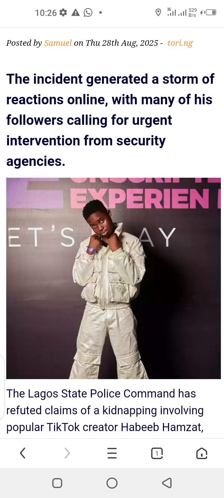 Nigeria TikToker Star, Peller Safe After Viral Kidnap Scare – Police Clarify Posted by Samuel on Thu 28th Aug, 2025 – tori.ng The incident generated a storm of reactions online, with many of his followers calling for urgent intervention from security agencies.  The Lagos State Police Command has refuted claims of a kidnapping involving popular TikTok creator Habeeb Hamzat, also known as Peller, affirming that he is “safe and not abducted.” Panic had gripped social media in the early hours of Thursday after a viral video suggested that the comedian was forcefully dragged out of a vehicle by armed men suspected to be kidnappers. The clip, which trended across TikTok, Instagram, and X, showed Peller engaged in a heated altercation with men around a white minibus. In the footage sighted by Vanguard, the influencer was heard questioning why the men were pointing a gun at him before he was pulled from his car. The livestream ended abruptly, fueling speculations that he had been whisked away. The incident generated a storm of reactions online, with many of his followers calling for urgent intervention from security agencies. Reacting to the development on Channels TV, the Lagos Police Command spokesman, CSP Benjamin Hundeyin, said Peller was never kidnapped, stressing that the situation was “blown out of proportion” by social media users. According to him, preliminary findings revealed that there was no abduction and that the entertainer was safe. He, however, cautioned the public against spreading unverified information capable of sparking unnecessary panic. His words: “The viral story of TikTok influencer Peller being kidnapped is not true. He is safe. “There was an incident, but it was not a case of kidnapping as being peddled online. We advise the public to always verify information before sharing.” Hundeyin further stated: “We are investigating the allegation, but we can confirm that the person in question, Habeeb, popularly known as Peller, is at home safe and sound. “His vehicle is intact, all his phones and properties are with him, and nothing is missing. The outcome of our investigation will determine our next line of action.” Popular Stories How Can You Can Improve Your Oral S*x Skills and Make Her Explode? Popular Therapist Shares Secrets Houses Decked in Gold, Spraying Money from a Gun & More: Meet the ‘Rich Kids of Nigeria’ (Photos) So Inspirational: Check Out Early Jobs of Some Famous Billionaires Only in Naija: See Passengers Climbing an Airplane with a Ladder in Nigerian Airport (Photos) Baby Born With Four Arms And Four Legs In India Copyright © 2025 Tori.ng – All rights reserved Tori.ng is owned and managed by Cyclofoss Technologies Ltd.
