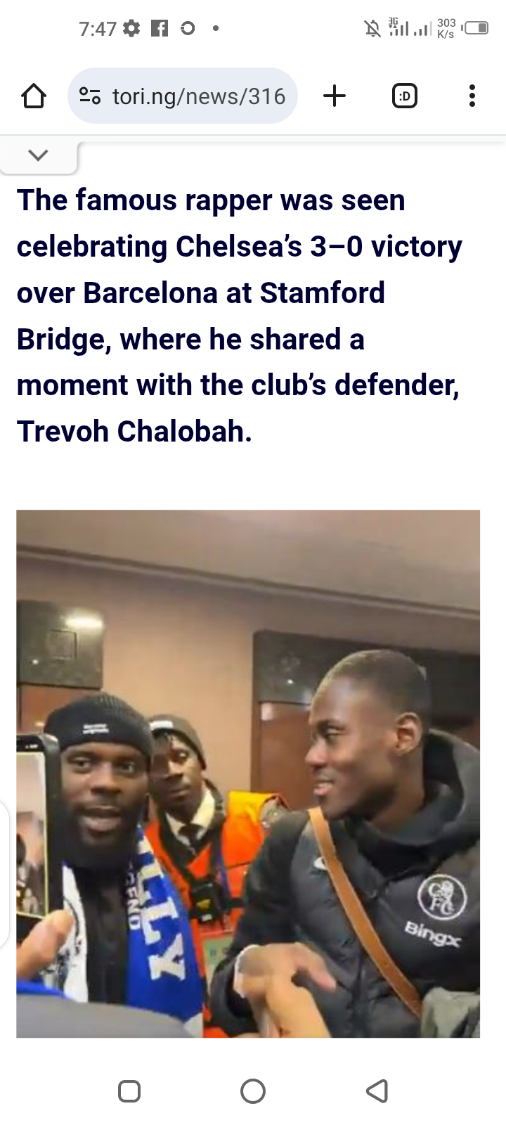 Menu Nigerian Rapper, Odumodublvck Seen Celebrating Chelsea’s Victory With Trevoh Chalobah At Stamford Bridge (Video) Posted by Samuel on Thu 27th Nov, 2025 – tori.ng Share this news: The famous rapper was seen celebrating Chelsea’s 3–0 victory over Barcelona at Stamford Bridge, where he shared a moment with the club’s defender, Trevoh Chalobah. Nigerian Afrobeats star Odumodublvck, has been spotted at Stamford Bridge. The famous rapper was seen celebrating Chelsea’s 3–0 victory over Barcelona at Stamford Bridge, where he shared a moment with the club’s defender, Trevoh Chalobah. The appearance drew attention because of Odumodublvck’s past musical references to Arsenal players, such as Declan Rice, and his previous support for Barcelona. Fans debated his football loyalties, though many viewed the encounter as a reflection of his natural networking and love for the game. Music journalist Joey Akan described him as an instinctive connector, noting how moments like these highlight the intersection of Nigerian music and Premier League football. Chelsea supporters welcomed the artist warmly on a triumphant night for the club. Share this news: Recent News Let It Be On Record That The Tinubu Government Is Enabling Terrorism – Nigerian Rapper, Falz Alleges Published on Wed 26th Nov, 2025 BREAKING: Senate Proposes De@th Penalty For Kidnappers Published on Wed 26th Nov, 2025 My Anointing Does Not Allow Me – Veteran Actor, Patrick Doyle Reacts After Being Asked To Speak On His Ex-Wife, Ireti Doyle (Video) Published on Wed 26th Nov, 2025 Nigerian Singer, Tems Reveals What She Would Have Become If She Wasn’t A Musician Published on Wed 26th Nov, 2025 Atiku Has Worn More Political Jerseys Than A Veteran Footballer – APC Taunts Ex-Vice President Published on Wed 26th Nov, 2025 Latest News Nigerian Rapper, Odumodublvck Seen Celebrating Chelsea’s Victory With Trevoh Chalobah At Stamford Bridge (Video) Published on Thu 27th Nov, 2025 Abducted Anglican Priest, Venerable Achi Who Was Kidnapped With His Wife, D!es In Captivity Published on Thu 27th Nov, 2025 I Was St@bbed And Obesere Lost ₦95 Million – Fuji Singer’s Aide Recounts Thugs Attack In Ondo Published on Thu 27th Nov, 2025 BREAKING: Goodluck Jonathan Stranded In Guinea-Bissau Amidst Military Coup Published on Thu 27th Nov, 2025 Terrorists Now In Full Control Of Kainji National Park — Niger State Lawmaker Laments After Escaping Ass@ssination Attempt Published on Thu 27th Nov, 2025 Nigerian Gospel Singer, Gaise Baba’s Father Is De@d Published on Thu 27th Nov, 2025 Boko Haram Suspects Were Found On Nigerian Army And Police Recruitment Lists — Ex-Rep Deputy Speaker Reveals Published on Thu 27th Nov, 2025 Photos Of Repentant Rival Cultists Surrendering Their Arms To Police In Ondo Published on Thu 27th Nov, 2025 Nigerian Singer, Rema Throws Shade At Colleague, Ayra Starr For Relocating To New York Published on Thu 27th Nov, 2025 DSS Reacts To Reports That It Arrested Nigerian Evangelist Over False Nasarawa Attack Claims Published on Thu 27th Nov, 2025 How A Physically-Challenged Widower, Children Escaped De@th In Ebonyi After Property Worth N40m Went Up In Flames Published on Thu 27th Nov, 2025 President Tinubu Declares Nationwide Security Emergency, Orders 20,000 New Police Recruits Published on Thu 27th Nov, 2025 I’ve Always Wanted To Be A Musician – BBNaija Star, Liquorose Reveals Published on Thu 27th Nov, 2025 Nigerian Cleric Slams FG For Allegedly Arresting An Evangelist Who Raised Alarm Of An Alleged Attack In A Community In Nasarawa (Video) Published on Thu 27th Nov, 2025 BREAKING: White House Locked Down Following Shooting Of Two National Guard Members Published on Thu 27th Nov, 2025 0 1 2 Older » Popular News Choosing BTC Miner cloud mining is equivalent to opening a dedicated automatic money printing machine for yourself Majek Fashek Dabbled Into Spiritism And It Affected Him Terribly – Ex-Bandmate, McRoy Reveals 11 Nigerian Pastors Who Were Accused Of Adultery – No. 3 & 6 Cases Shook Nigeria Ishola Oyenusi: Nigeria’s Deadly Armed Robber Who Smiled to His Death (Photos) I was R*ped At 17, Married My R*pist At 18 & Divorced Him 6 Years Later – Woman Shares Touching Story From Allen Avenue to Snapchat Prostitute: The Evolution of the Nigerian Commercial S*x Worker So Touching: Beautiful Nigerian Girl Celebrates 7 Years of Being an Amputee (Photos) Drama as 7 Different Girls Celebrate National Boyfriend Day by Posting Photos of the Same Nigerian Boyfriend Unbelievable! Meet the Man Who Survived Three Days in a Whale’s Belly After He Was Swallowed (Photos) We’ve Seen US President’s Car “The Beast”, But Russian President’s Car is the Real Bomb! (Photos) Sports The New Qualification Format Cost Super Eagles World Cup Miss – Amaju Pinnick Says Can Nigeria Bounce Back from World Cup Disappointment with an Africa Cup of Nations Win? My 2021 Facial Injury Is Still Affecting How I Eat — Victor Osimhen Opens Up (Video) Cristiano Ronaldo And Georgina Rodriguez To Marry In His Home Island Of Madeira Next Summer They Are Nice Guys – Nigerian Football Legend, Yakubu Aiyegbeni Praises Super Eagles’ Patience Over Unpaid Bonuses (Video) Tech Facebook, Instagram Users to Pay £2.99 For Monthly Subscription Apple Launches iPhone 17 Pro XRP is expected to break through $5.5 in the second half of the year – BTC Miner cloud mining helps you earn steady XRP returns The 2025 wealth vane points to smart cloud mining. Choosing the right way will allow you to earn up to $100 a day, or $100,000 a day Player Verification Technologies Expanding across Africa World Man Uses A Woman’s Placenta To Re-Build His Eye And Save His Sight After Acid Attack US President-elect, Donald Trump To Take More Than 200 Executive Actions On First Day In Office Commotion As Two Armed Drones From Lebanon Explode In Israel, Injure Three Man Charged With Attempted Murder For Choking His Terminally Ill Wife In Front Of Her