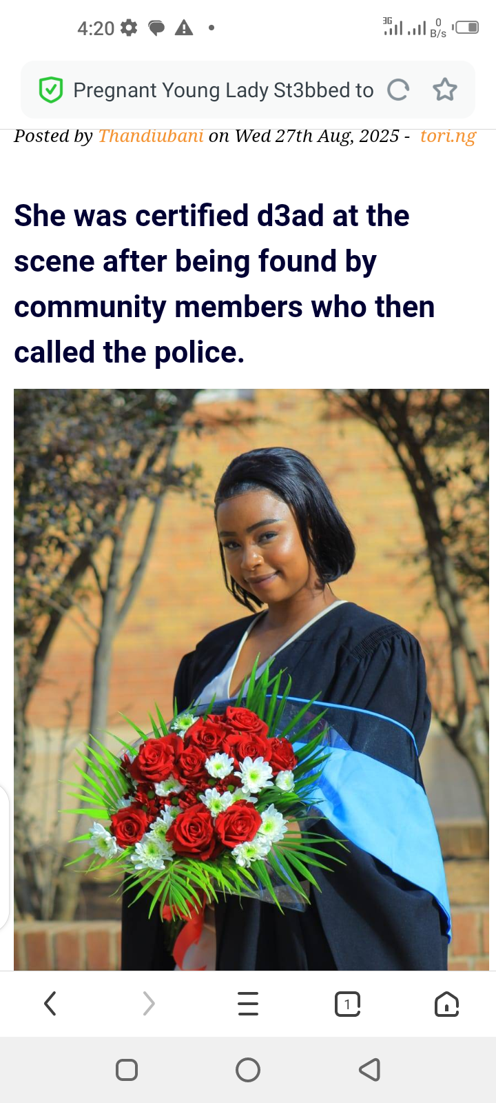 Pregnant Young Lady St3bbed to D3ath By Her Boyfriend Posted by Thandiubani on Wed 27th Aug, 2025 – tori.ng She was certified d3ad at the scene after being found by community members who then called the police.  A 23-year-old woman, Botshelo Moimane, has been k!lled by her 31-year-old lover, Happy Thabo Aphane of Leeuwfontein. The man has now appeared in Marble Hall Magistrates’ Court Limpopo, South Africa on Tuesday, August 26, 2025 for the m8rder of his girlfriend. It is alleged that on 19 August 2025, the accused st@bbed his girlfriend who was four months pregnant several times and fled the scene. She was certified d3ad at the scene after being found by community members who then called the police. The accused was apprehended on 20 August 2025 at Elandskraal. It was further revealed that around May 2025, the deceased had opened a case of assault with intent to cause grievous bodily harm against the accused however, she submitted a withdrawal statement in court resulting in the accused being released around July 2025. The matter is postponed to September 9, 2025 for legal representative of the accused. He remains in custody.  Popular Stories How To Confirm Whether Your Sim Card Is Registered Former Nigerian Governors Make Millions, Live Luxury Lifestyles From Pension After Leaving Office Meet the Handsome Abuja Guy Who Has Won Affection From Nigerian Ladies (Photos) Pastor Caught Pants Down While Trying to Sleep With a Married Woman (Photo+Video) Nigerian Pastor Who Sucks Women’s Breasts to Deliver Them, Gets Busted on Radio Show (Listen to Audio) Copyright © 2025 Tori.ng – All rights reserved Tori.ng is owned and managed by Cyclofoss Technologies Ltd.
