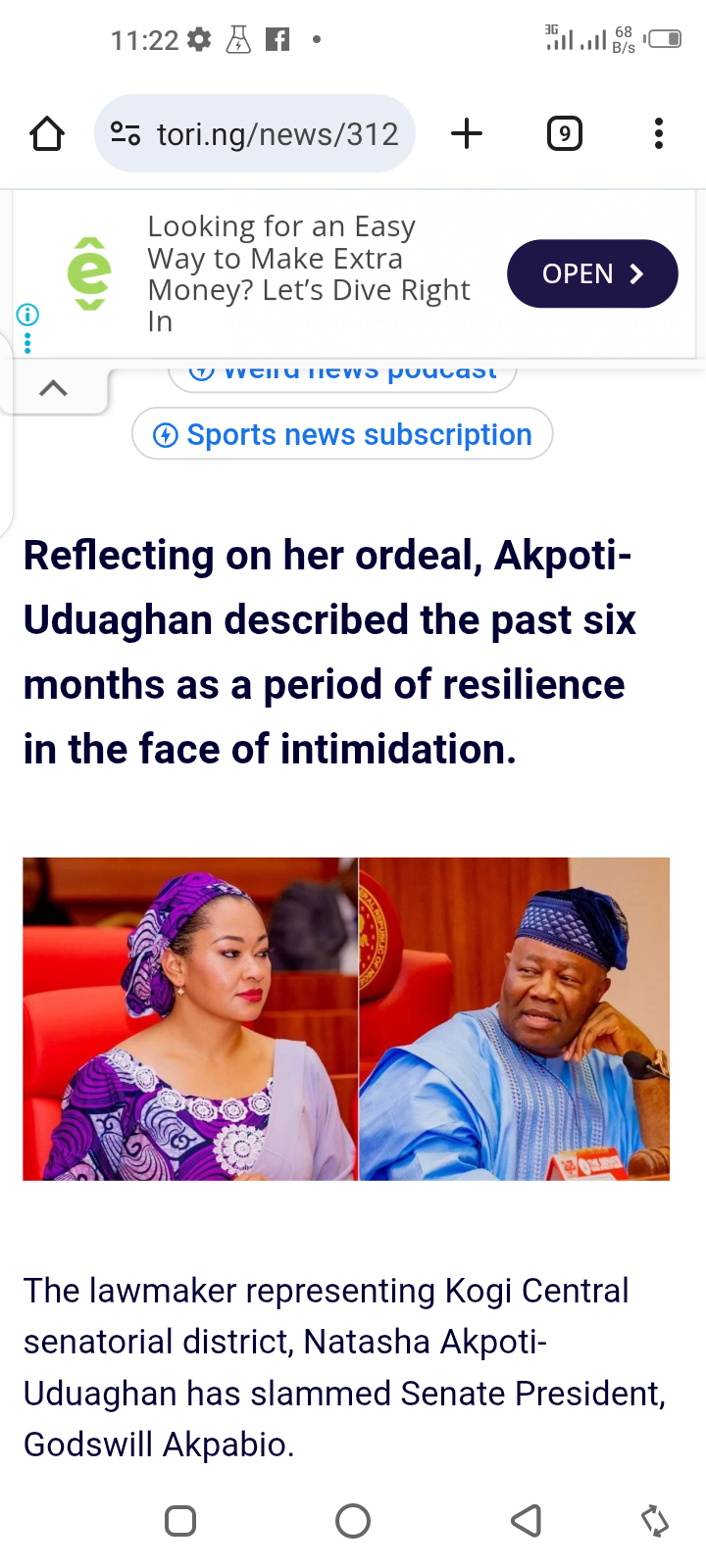 Menu Senator Akpabio Treated Me As If I Was His Servant – Natasha Posted by Thandiubani on Tue 23rd Sep, 2025 – tori.ng Share this news: Discover more Weird news compilation Celebrity birthday features Lifestyle product reviews News aggregation service Political commentary Newspaper advertising space Nigerian travel guide Metro news service Weird news podcast Sports news subscription Reflecting on her ordeal, Akpoti-Uduaghan described the past six months as a period of resilience in the face of intimidation. The lawmaker representing Kogi Central senatorial district, Natasha Akpoti-Uduaghan has slammed Senate President, Godswill Akpabio. Speaking on Tuesday, she accused him of treating her like a slave and his “domestic staff.” She made the remarks while addressing journalists in her office at the National Assembly complex, shortly after the Sergeant-at-Arms reopened it following her six-month suspension. Reflecting on her ordeal, Akpoti-Uduaghan described the past six months as a period of resilience in the face of intimidation. Natasha said, “From the unjust suspension to the recall, we survived the blockade of roads, we survived the blackmail from the crazy lady on Facebook. It’s amazing what we had to survive.” She expressed gratitude to her constituents, Nigerians at large, and her husband, noting, “I pray all men support their wives like you have supported me.” The senator said her suspension was unjust and maintained that she had continued to discharge her responsibilities to her constituents despite being barred from plenary. “Sometimes, it’s good to put the institutions to the test. We can’t bow down in the face of injustice; no one is more Nigerian than us,” she declared. Taking direct aim at the Senate President, she added, “Senator Akpabio is not more of a senator than I am. He is not the governor of this place, yet he treated me as if I was his servant or domestic staff in his house. It’s very unfortunate that at this time, after so many years of democracy, we have a National Assembly being run by such dictatorship. It’s totally unacceptable.” Akpoti-Uduaghan vowed to continue representing Kogi Central with full dedication, insisting that her suspension could not deter her. “As for me, I’m glad to be here. Even though we were illegally suspended, no day have I hesitated in effectively carrying out my duties as a senator of Kogi Central to the very best of my capacity,” she said. Share this news: Recent News Troops Arrest Two Suspected Kidnappers in Taraba Published on Tue 23rd Sep, 2025 Davido Becomes Voting Member of Grammys Recording Academy Published on Tue 23rd Sep, 2025 22-year-old Woman St@bs Her Boyfriend to D3ath (Photo) Published on Tue 23rd Sep, 2025 ICAN Reacts to Viral Video of Suspected Proxies Caught Impersonating During Professional Examinations Published on Tue 23rd Sep, 2025 France Officially Recognizes The State of Palestine Published on Tue 23rd Sep, 2025 Nigerians Collecting Naira With This New AI App World of Finance | SponsoredLearn More With AI: Invest ₦450,000, Earn Up To ₦523,688/h In Nigeria AI News | SponsoredLearn More New AI Money Making System Is Taking Over Nigeria AI News | SponsoredLearn More New AI Giving Wealth to People in Nigeria World of Finance | SponsoredLearn More New AI Giving Wealth To People In Nigeria World of Finance | SponsoredLearn More With AI: Invest ₦450,000, Earn Up To ₦523,688/h In Nigeria AI News | SponsoredLearn More Erection Will Be Like At 19! Take This 15 Minutes Before Bed! Xenoprost Active | Sponsored Do This Every Night And Your Prostate Will Be Restored In 3 Days! Proman | Sponsored Natural Yet Very Effective! Provides Immediate Results Xenoprost Active | Sponsored PROMOTED CONTENT Xenoprost Do This Every Night And Your Prostate Will Be Restored In 5 Days! Xenoprost Active Erection Will Be Like At 19! Take This 15 Minutes Before Bed! Xenoprost Active Natural Yet Very Effective! Provides Immediate Results Cardizoom The Worst Enemy Of Hypertension. Read This Before It’s Removed GlucoPro Diabetes Is Not From Sweets! Meet The Main Enemy Of Diabetes GlucoPro Diabetes Will Be Gone In 4 Days, Sugar Will Drop To 3.9! Volmix Joints And Back In 1 Month, No Doctors, Do It At Home! CardiZoom Nigerian Secret To Normalizing Blood Pressure In 7 Days Xenoprost Active Problems In Bed? Get 2-3 Hours Of Lasting Power Easily! Latest News You Are Playing With Fire – IPOB Tells FG Over Nnamdi Kanu’s Deteriorating Health Published on Tue 23rd Sep, 2025 Fake Police Officer Arrested For Extortion in Kano Published on Tue 23rd Sep, 2025 I’ve Received N20 Billion As My Birthday Gift For National Library – Remi Tinubu Published on Tue 23rd Sep, 2025 I Have Not Been Officially Communicated To – Natasha Speaks On NASS Ending Her Suspension Published on Tue 23rd Sep, 2025 Senator Akpabio Treated Me As If I Was His Servant – Natasha Published on Tue 23rd Sep, 2025 Senator Natasha Vows Not To Apologise After Entering Office Published on Tue 23rd Sep, 2025 Nigerians Should Demand Performance From Govs, Senators Not Just Tinubu – Tacha Published on Tue 23rd Sep, 2025 GWR: Jollof Pot Collapse Was Blessing in Disguise – Hilda Baci Published on Tue 23rd Sep, 2025 I Lost N19m In Diesel Investment at 19 – Mr Eazi Published on Tue 23rd Sep, 2025 Human Error And Excessive Speed Led to Abuja-Kaduna Train Derailment Published on Tue 23rd Sep, 2025 Media Personality Stephanie Coker And Husband Olumide Aderinokun Expecting Second Child (Video) Published on Tue 23rd Sep, 2025 Gunmen Kidnap Plateau Lawmaker Published on Tue 23rd Sep, 2025 DSS Interrogates Malami Over Attack On His Convoy Published on Tue 23rd Sep, 2025 Two Young Children D!e After Their Mum Left Them In a Hot Car to Take Nap Published on Tue 23rd Sep, 2025 Choose a Man With a Kind Heart – Businessman, Dilly Umenyiora’s Wife, Anastasia Gushes as He Takes Her On Vacation Published on Tue 23rd Sep, 2025 0 1 2 Older » Popular 
