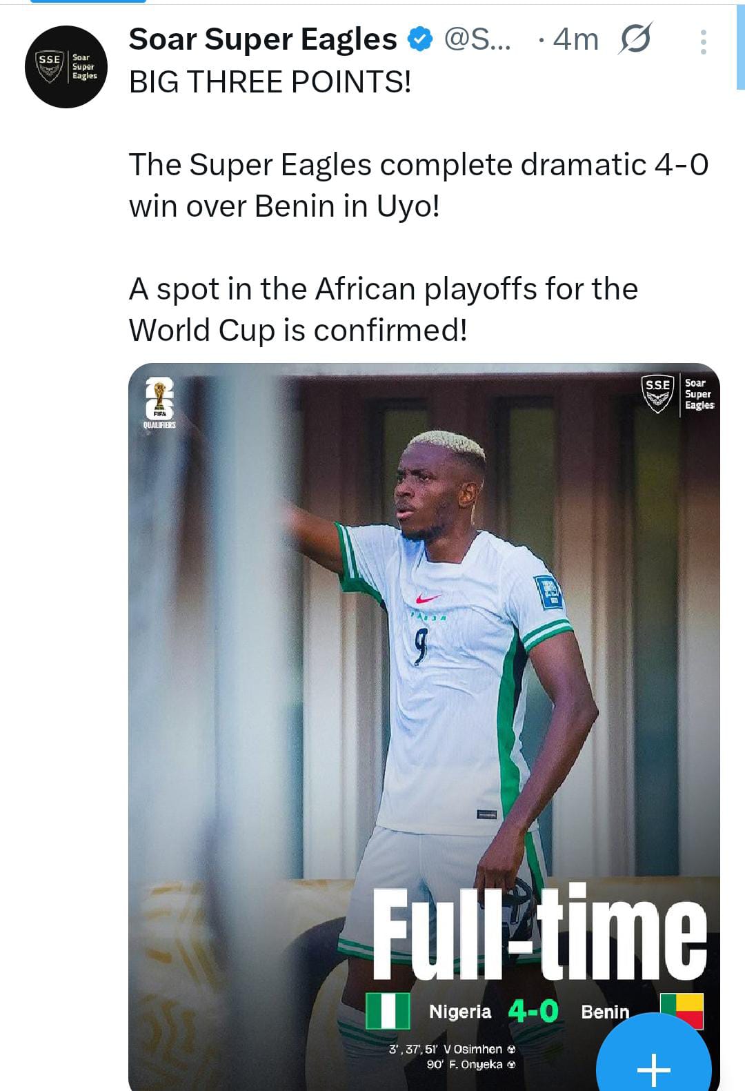 Not all heroes wear capes. Some wear masks! Nigerian forward Osimhen, the masked #15, proved to be the hero for the Super Eagles, thanks to his hat-trick of goals. The ex-Napoli man struck twice in the first half before adding another goal in the second period, as Nigeria sailed to a resounding 4-0 win. The victory keeps them in the hunt for World Cup qualification, as they aim to make their seventh appearance at the finals. Victor Osimhen reacts. Nigeria’s forward Victor Osimhen scored three goals as his team thrashed Benin 4-0 on Tuesday