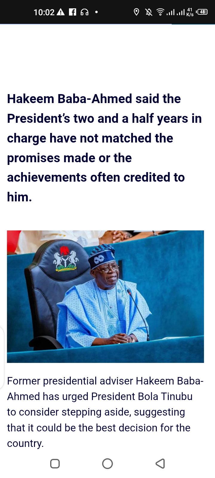 Menu Step Down For Nigeria’s Sake – Baba-Ahmed Tells Tinubu Posted by Samuel on Tue 09th Dec, 2025 – tori.ng Share this news: Hakeem Baba-Ahmed said the President’s two and a half years in charge have not matched the promises made or the achievements often credited to him. Former presidential adviser Hakeem Baba-Ahmed has urged President Bola Tinubu to consider stepping aside, suggesting that it could be the best decision for the country. Speaking on Arise TV’s Daybreak on Monday, he said the President’s two and a half years in charge have not matched the promises made or the achievements often credited to him. He argued that official claims from the government do not reflect what Nigerians are facing daily. “There’s a wide discrepancy between what he says he’s doing and what people say they are living,” he said. Baba-Ahmed also criticised the President’s approach to security. According to him, “President Buhari left a terrible security situation and Tinubu doesn’t appear to have improved it; rather, it appears that he has made it worse.” He suggested that Tinubu’s age, his long-held ambition to become president, and having “no further value to offer” may be reasons for asking him to step aside. “If President Tinubu loves the survival of Nigeria, I think he should call it quits,” he said. He added that Nigerians should find someone else in 2027, “whether within or outside his party, who has better qualities.” Share this news: Recent News Step Down For Nigeria’s Sake – Baba-Ahmed Tells Tinubu Published on Tue 09th Dec, 2025 BREAKING: Benin Republic Declares Coup Leader, Two Others Wanted Published on Mon 08th Dec, 2025 Drama As Arise TV Anchor, Rufai And Tinubu’s Aide, Bwala Trade Words Over Suspension Claim Published on Mon 08th Dec, 2025 Nigerian Singer, Tems Reveals The Types Of Men She Can’t Date Or Marry (Video) Published on Mon 08th Dec, 2025 Niger School Abduction: We Aren’t Officially Aware Of 100 Students Release – CAN Published on Mon 08th Dec, 2025 Latest News Step Down For Nigeria’s Sake – Baba-Ahmed Tells Tinubu Published on Tue 09th Dec, 2025 BREAKING: Again, EFCC Re-arrests Abubakar Malami Published on Tue 09th Dec, 2025 CBN Approves 82 Fully Licensed BDC Operators In Nigeria (Full List) Published on Tue 09th Dec, 2025 It’s Treasonable To Order Governor Adeleke To Off Mic – Lawyer Tells First Lady Tinubu Published on Tue 09th Dec, 2025 Burkina Faso Detains 11 Nigerian Military Officers, Seizes Air Force C-130 After ‘Unauthorised’ Airspace Entry Published on Tue 09th Dec, 2025 It Really Hurts Me – Nollywood Actress, Debbie Shokoya Apologizes To Colleague, Kemity Published on Tue 09th Dec, 2025 Queen Naomi Left Me, But God Blessed Me With Seven More – Ooni Of Ife Boasts Published on Tue 09th Dec, 2025 My Post About Diddy Was Irresponsible – Popular Skitmaker, Shank Comics Backtracks Published on Tue 09th Dec, 2025 Drug Network Bust: India Deports 32 Nigerians, Traces Ring To Nigeria-Based Kingpin Published on Tue 09th Dec, 2025 Nollywood Actress, Dayo Amusa Elected AGN National Vice President Published on Tue 09th Dec, 2025 People Are Expecting Me To Cry But I Won’t Go Hungry – Peller Reacts As TikTok Bans Night Livestream In Nigeria (Video) Published on Mon 08th Dec, 2025 Governor Fubara Meets Tinubu At Aso Rock Amid Fresh Political Tension In Rivers Published on Mon 08th Dec, 2025 BREAKING: Benin Republic Declares Coup Leader, Two Others Wanted Published on Mon 08th Dec, 2025 You Need Help More Than 2Baba — Daddy Freeze Fires Back At Jesse Jagz, Shares His Side Of The Story (Video) Published on Mon 08th Dec, 2025 BREAKING: Nigerian Soldiers Escorting Brigade Commander Reportedly Shoot De@d Seven Protesting Women Published on Mon 08th Dec, 2025 0 1 2 Older » Popular News Beautiful Photos Of Dwarf And His Tall Bride During Their Traditional Wedding In Delta Go Viral Online Some Very Controversial Pictures Nigerian Police Officers Don’t Want You to See Drama as Ghanaian Pastor is Almost Beaten Up by Madman He was Trying to Deliver (Video) Shocker: This Woman Wants to Be Remembered for Having World’s Biggest Hips (Photos) Incredible! Meet Nigerian Teen Girl, Ifeoma White-Thorpe Who Got Accepted by All 8 Ivy League Schools in USA Any Police Officer Checking Vehicle Particulars is on Illegal Duty – AIG Shocking! Pretty Air Hostess Sends Rich Man Her N*ked Photos After Begging for S*x and Money (Photos) Controversial Pastor that Performs Miracle with Live Snake Dies After Being Bitten by His Own Snake While Performing Miracle Man Who Loved His Car Gets Buried in it During Funeral Service (Photos) See Top 7 Nigerian Actors Who Are Also Lecturers (Photos) Discover more Health and wellness products Naija news app Online education platforms Newspaper advertising space Entertainment news apps Mental health resources Nigerian news analysis News website development Romance advice column Sports news coverage Sports William Troost-Ekong Reacts To Reports That He Was Forced Out Of Super Eagles Victor Osimhen Reveals His ‘Rituals’ Before Playing Any Match Victor Osimhen Reveals What Happens To Him If He Loses A Match It’s A Sad One For Us – Alex Iwobi Reacts To Super Eagles Captain, Troost-Ekong’s Retirement (Video) Lionel Messi Drops Hint That He Could Miss 2026 FIFA World Cup Tech How Nexus Auto Transport Supports Your Journey to Vibrant African Cultural Hubs Nationwide I Would Have Been Dead If Not For My Wife – Football Legend, Wayne Rooney Confesses Facebook, Instagram Users to Pay £2.99 For Monthly Subscription Apple Launches iPhone 17 Pro XRP is expected to break through $5.5 in the second half of the year – BTC Miner cloud mining helps you earn steady XRP returns World Man Uses A Woman’s Placenta To Re-Build His Eye And Save His Sight After Acid Attack US President-elect, Donald Trump To Take More Than 200 Executive Actions On First Day In Office Commotion As Two Armed Drones From Le