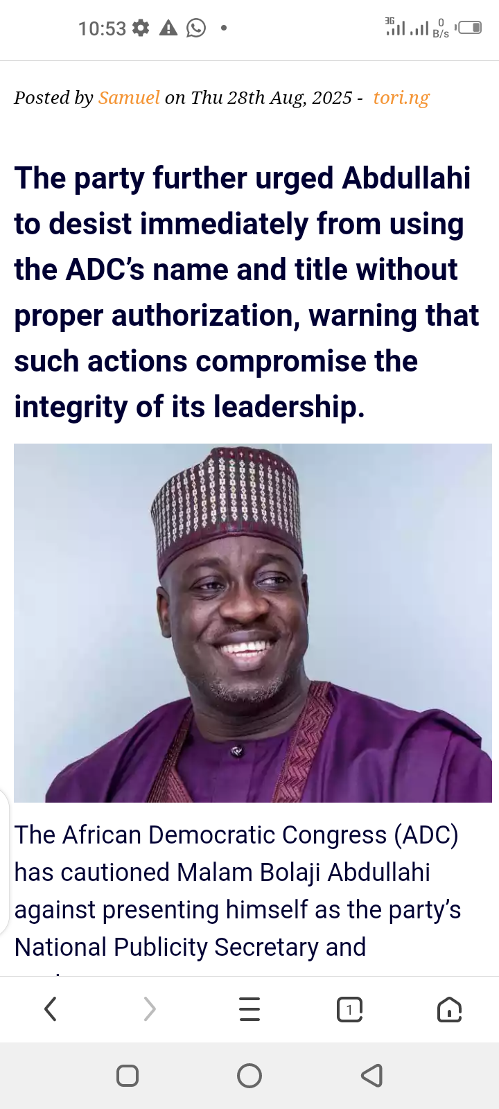 Stop Parading As Our Spokesperson – ADC Warns Bolaji Abdullahi Posted by Samuel on Thu 28th Aug, 2025 – tori.ng The party further urged Abdullahi to desist immediately from using the ADC’s name and title without proper authorization, warning that such actions compromise the integrity of its leadership.  The African Democratic Congress (ADC) has cautioned Malam Bolaji Abdullahi against presenting himself as the party’s National Publicity Secretary and spokesperson. A statement released on Thursday by the Director of Media and Public Affairs in the Office of the National Chairman, Dr. Christopher O. Okechukwu, said Abdullahi’s claim to the role was misleading, unauthorized and a violation of established party protocols. The party further urged Abdullahi to desist immediately from using the ADC’s name and title without proper authorization, warning that such actions compromise the integrity of its leadership. Parts of the statement read: “The ADC finds it imperative to address a matter of significant concern regarding the representation of our esteemed party. It has come to our attention that Malam Bolaji Abdullahi has been presenting himself as the Publicity Secretary and Spokesperson of the ADC. “This assertion is not only misleading but also a violation of the established protocols that govern the appointment of individuals to such critical positions within our party. The ADC is committed to upholding the principles of transparency, accountability, and democratic governance. “To this end, the eligibility criteria for the position of Publicity Secretary and Spokesperson are explicitly defined, and adherence to these criteria is non-negotiable. These requirements include: “The individual must be a registered and active member of the ADC. This ensures that the spokesperson is not only familiar with the party’s values and mission but also actively engaged in its activities. “The candidate must obtain a nomination form and secure nominations from at least three party members across the 36 states, including the Federal Capital Territory, Abuja. This process is essential for fostering inclusiveness and ensuring that the voice of the party is representative of its diverse membership. “The individual must be elected to the position at the Party’s National Convention. This democratic process is designed to uphold the integrity of the party’s leadership and ensure that those who represent us have the mandate of the members. “In light of these criteria, it is clear that Malam Bolaji Abdullahi does not meet the necessary requirements to serve as the Publicity Secretary and Spokesperson of the ADC. His continued self-identification in this capacity is not only unauthorized but also undermines the credibility of our party. Therefore, we urge Malam Abdullahi to cease and desist from using the ADC’s name and title without proper authorization immediately.” The statement also called on media organizations and journalists to exercise caution in their reporting by refraining from recognizing Abdullahi as the official spokesperson of the ADC. “We call upon media houses and journalists to exercise due diligence in their reporting. It is crucial that they refrain from recognizing Malam Bolaji Abdullahi as an official spokesperson of the ADC. By doing so, media outlets will contribute to maintaining the accuracy, authenticity, and reliability of their reporting, which is vital for public trust and informed discourse. “The ADC is dedicated to preserving the integrity and credibility of its representation. We believe that only authorized individuals should speak on behalf of the party, ensuring that our message is consistent and aligned with the values we uphold. We appreciate the understanding and cooperation of all stakeholders in this matter,” the statement added. The statement further reiterated the party’s commitment to democratic principles and the rule of law. “We will continue to advocate for transparency and accountability in all our dealings. The ADC remains focused on its mission to serve the Nigerian people and promote the ideals of good governance.” Popular Stories Omg! What was Found Written in the Gigantic Devil’s Bible Discovered in Czech Republic will Shock You (Photos+Video) Artistically Gifted: Meet the Nigerian Genius Behind the Body Art in Beyonce’s #Lemonade (Photos+Video) Goat With ‘Human Face’ Dumped in Refuse Heap in Kano (Photos) Read the Touching Humble Background of Golden Eaglets’ Star Striker, Victor Osimhen The Power Of Inspiration – By Femi Fani-Kayode (Must Read) Copyright © 2025 Tori.ng – All rights reserved Tori.ng is owned and managed by Cyclofoss Technologies Ltd.
