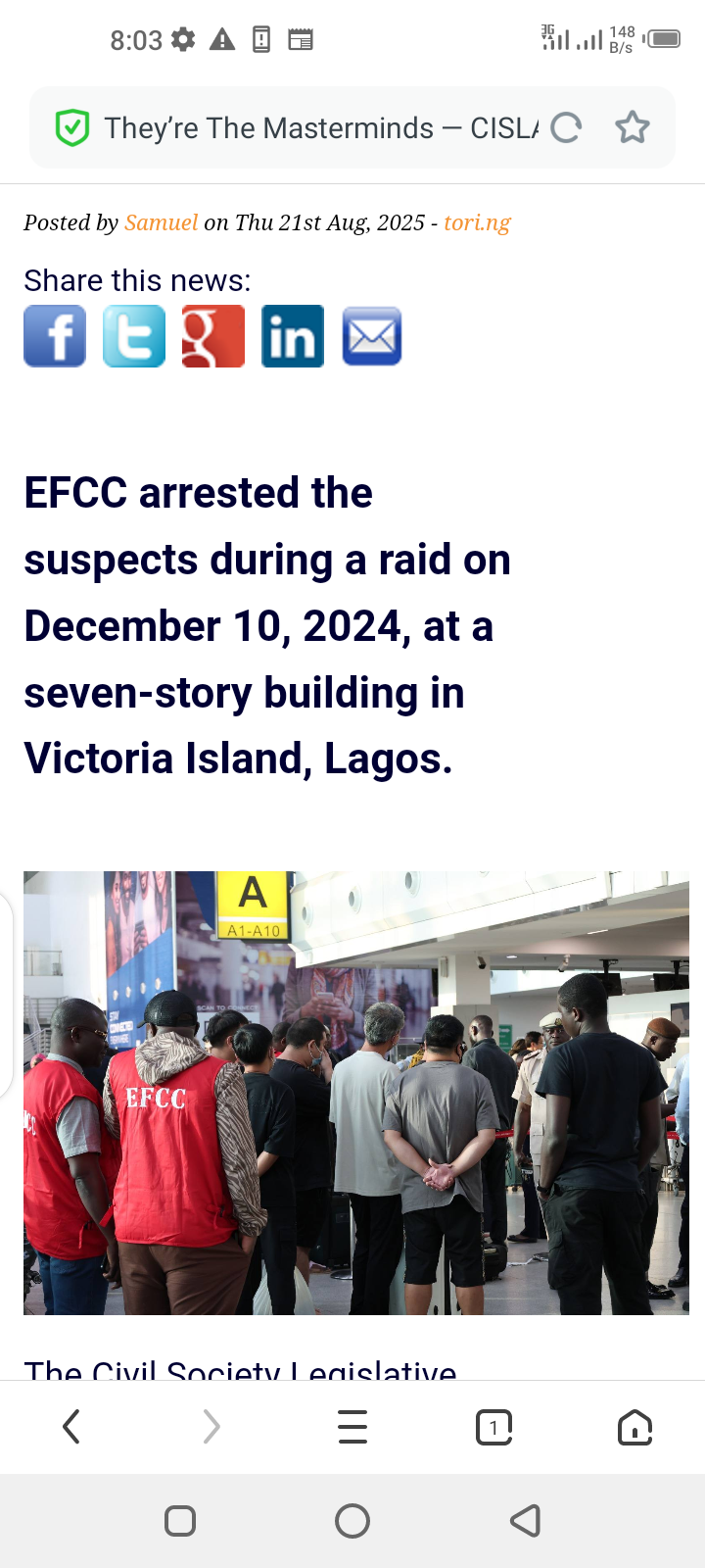 They’re The Masterminds — CISLAC Reacts To Arrest Of 192 Foreign Internet Fraudsters In Lagos Posted by Samuel on Thu 21st Aug, 2025 – tori.ng Share this news:      EFCC arrested the suspects during a raid on December 10, 2024, at a seven-story building in Victoria Island, Lagos.  The Civil Society Legislative Advocacy Centre (CISLAC) has commended the Economic and Financial Crimes Commission (EFCC) for arresting 192 foreign nationals allegedly linked to a sophisticated cryptocurrency investment and romance scam network. EFCC arrested the suspects during a raid on December 10, 2024, at a seven-story building in Victoria Island, Lagos. The suspects include 148 Chinese nationals, 40 Filipinos, two citizens of Kyrgyzstan, one Pakistani, and one Indonesian. The anti-graft agency said the syndicate is believed to have recruited and trained young Nigerians to serve as local operatives, using their identities to mask the activities of the foreign masterminds behind the operations. Speaking on the development, CISLAC’s Executive Director, Comrade Auwal Musa Rafsanjani, applauded the EFCC’s efforts and professionalism. He said the arrest “underscores the Commission’s dedication to tackling cybercrime at the highest level and proves that these crimes are often orchestrated by international actors who exploit vulnerable Nigerians for their schemes”. According to CISLAC, the raid is a major breakthrough in the fight against cybercrime in Nigeria. The civil society organisation challenged the prevailing global narrative that disproportionately links Nigerians to internet fraud. Rafsanjani added that the operation debunks the harmful stereotype that Nigerians are the main perpetrators of cybercrime. “What we are seeing is a transnational criminal hierarchy where foreign masterminds manipulate and discard Nigerian youth after using them to front illegal operations,” he said.
