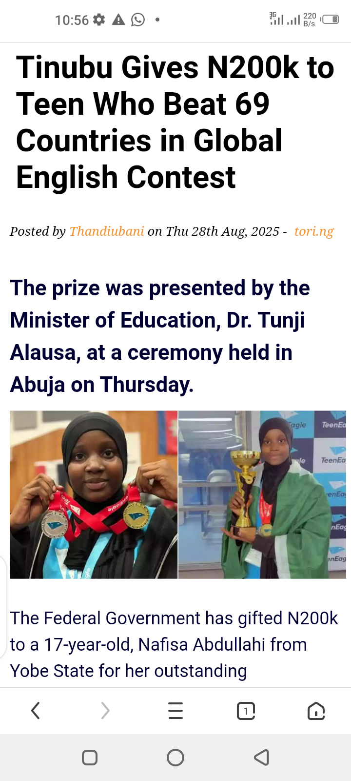 Tinubu Gives N200k to Teen Who Beat 69 Countries in Global English Contest Posted by Thandiubani on Thu 28th Aug, 2025 – tori.ng The prize was presented by the Minister of Education, Dr. Tunji Alausa, at a ceremony held in Abuja on Thursday.  The Federal Government has gifted N200k to a 17-year-old, Nafisa Abdullahi from Yobe State for her outstanding performance at the TeenEagle Global Finals in London. Recall that she defeated other kids from 69 countries to emerge as the World Best in English. The prize was presented by the Minister of Education, Dr. Tunji Alausa, at a ceremony held in Abuja on Thursday. Nafisa was among the champions of the competition, alongside Rukaiya Fema and Khadija Kalli, who were all previously recognised by the Atiku Abubakar Foundation with fully-funded scholarships in appreciation of their remarkable achievements at the global finals. In a letter dated August 5, 2025, and signed by Prof. Ahmadu Shehu, Acting Secretary of the Atiku Abubakar Foundation, the Foundation commended the students for their exceptional performance in various categories of the competition. Nafisa Abdullahi, who stood out for her exceptional command of the English language, critical thinking, and articulation, emerged victorious among participants from 69 countries. Further details of the award ceremony are expected to be released. Popular Stories Flashback on History: How Parcel Bomb Killed Dele Giwa, ‘The Flaming Journalist Who Gave Tyrants Nightmares’ Mike Tyson: Memories of a Magnificent Fighting Machine See the Huge Fish Coffin an Akwa Ibom Man Got Buried in (Photos) Can This Bump Be Real? This Pretty Lady’s Pregnant Baby Bump Causes Controversy Online (Photos) My Meeting with the Prime Minister and Emir of Dubai – Sijibomi ‘SujiMoto’ Ogundele Shares Experience Copyright © 2025 Tori.ng – All rights reserved Tori.ng is owned and managed by Cyclofoss Technologies Ltd.
