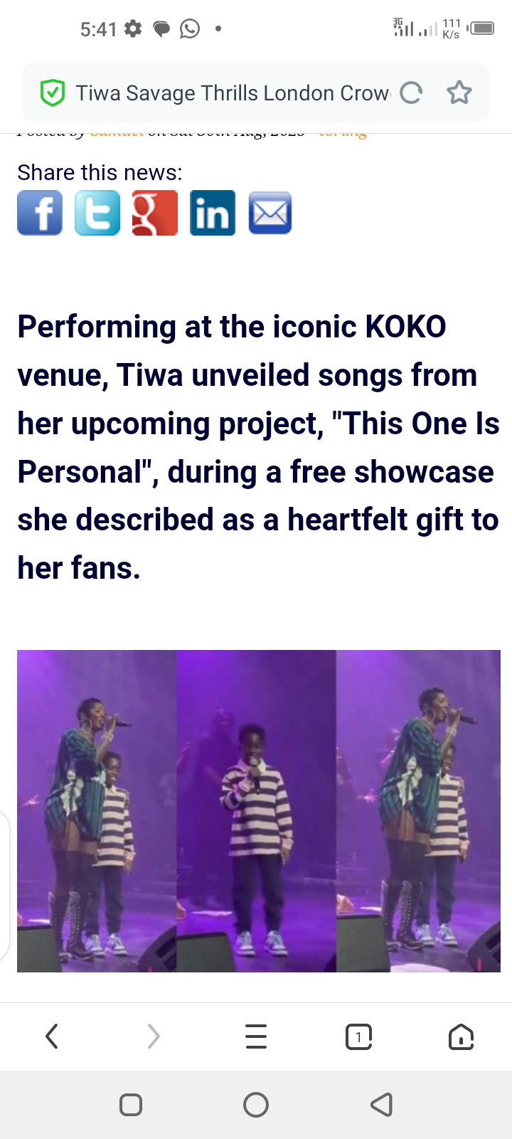 Tiwa Savage Thrills London Crowd With Surprise Cameo By Her Son Jamil (Video) Posted by Samuel on Sat 30th Aug, 2025 – tori.ng Share this news:      Performing at the iconic KOKO venue, Tiwa unveiled songs from her upcoming project, “This One Is Personal”, during a free showcase she described as a heartfelt gift to her fans.  Afrobeats star Tiwa Savage turned her London concert into a family moment on Friday as her 10-year-old son, Jamil, made a surprise appearance on stage. Performing at the iconic KOKO venue, Tiwa unveiled songs from her upcoming project, “This One Is Personal”, during a free showcase she described as a heartfelt gift to her fans. The night’s biggest moment came when Jamil stepped out to perform Skepta’s rap verse on “On The Low”. His confident delivery drew loud cheers from the packed crowd, sealing the evening with what many called a once-in-a-lifetime moment. For Tiwa, the concert underscored her ability to merge star power with intimacy. In recent weeks, she has also shared glimpses of her travels with Jamil in Tokyo, where they immersed themselves in Japanese culture, from tea ceremonies to serene garden strolls. The London showcase sets the stage for the release of “This One Is Personal”, a project the singer says reflects a deeper side of her artistry.