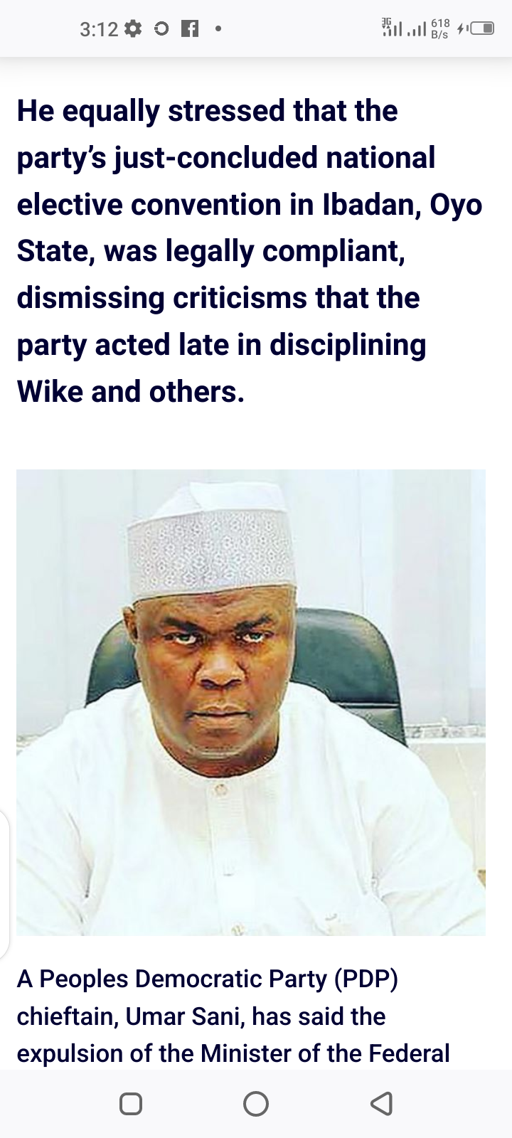 Wike’s Expulsion Is Better Late Than Never – PDP Chieftain Speaks Posted by Samuel on Mon 17th Nov, 2025 – tori.ng Share this news: Facebook Twitter Goodle LinkedIn Email Discover more Tech gadgets and accessories Sporting event tickets Addiction recovery programs Health and wellness products Metro News Legal consultation services Cloud mining services Cryptocurrency trading platforms Property News He equally stressed that the party’s just-concluded national elective convention in Ibadan, Oyo State, was legally compliant, dismissing criticisms that the party acted late in disciplining Wike and others. Nyesom Wike A Peoples Democratic Party (PDP) chieftain, Umar Sani, has said the expulsion of the Minister of the Federal Capital Territory, Nyesom Wike, along with other party members, is long overdue and “better late than never.” Umar made this statement on Monday in an interview on Arise Television. He equally stressed that the party’s just-concluded national elective convention in Ibadan, Oyo State, was legally compliant, dismissing criticisms that the party acted late in disciplining Wike and others. The former spokesman of the PDP Presidential Campaign Council emphasised that the party had attempted internal reconciliation through the Ambassador Hassan Adamu Committee, which sought to mediate between the disputing camps. “We wanted to resolve this as a family but it became clear there was no way to do so. Wike himself described it as a dispute among family members. One of his conditions was that we agree not to field a presidential candidate in 2027. We cannot wait for a fight to finish; we have to end the fight,” Sani said. The PDP stalwart also defended the timing of the disciplinary actions, adding, “The actions we took are better late than never.” Sani also clarified the confusion over the presence of election observers at the convention. He recalled that at the event, the master of ceremonies initially introduced certain individuals as INEC officials but the Governor of Bauchi State, Bala Mohammed, corrected the record, stating they were national election observers and not representatives of the Independent National Electoral Commission, INEC. Share on WhatsApp Share on Telegram Discover more Sports Updates Tech gadgets and accessories Business strategy workshops Cloud mining services Celebrity fashion items Weird news merchandise World news subscriptions Entertainment News Travel Guides Financial literacy courses Share this news: Facebook Twitter Goodle LinkedIn Email Discover more Nigerian News Financial literacy courses Event Coverage Security system installations Entertainment News Business strategy workshops Celebrity Gossip Metro News Sports Updates Tech gadgets and accessories Recent News Super Eagles Coach, Chelle Accuses DR Congo Of Using Voodoo During Penalty Shootout (Video) Published on Mon 17th Nov, 2025 Nigerian Truck Driver Found De@d Inside A Truck In US Published on Mon 17th Nov, 2025 You Never Called Me For Two Years, You Were Absent In My Toughest Moments – BBNaija Star, Imisi Drags Her Mother Published on Mon 17th Nov, 2025 My Heart And Soul Has Been Craving Something Deeper – DJ Cuppy Reflects On Her Life, Growth And Past Birthday Celebrations Published on Sun 16th Nov, 2025 29-Year-Old Nigerian Man St@bs his 75-Year-Old Father To D3ath In US, Injures Two Sisters Published on Sun 16th Nov, 2025 Latest News BREAKING: Nigeria’s Inflation Rate Drops For Seventh Consecutive Time In October Published on Mon 17th Nov, 2025 Wike’s Expulsion Is Better Late Than Never – PDP Chieftain Speaks Published on Mon 17th Nov, 2025 United Nigeria Airlines Hands VeryDarkMan, Mr Jollof Over To Security Following Their Fight Inside Aircraft (Video) Published on Mon 17th Nov, 2025 Popular Nigerian Journalist Dan Agbese Is De@d Published on Mon 17th Nov, 2025 She Pampered Me With Words – Cubana Chief Priest Shares Experience With Actress, Ngozi Ezeonu In Heartwarming Note Published on Mon 17th Nov, 2025 Electricity Workers Threaten Nationwide Shutdown Published on Mon 17th Nov, 2025 He Has No Shame, He Bit Me – VeryDarkMan Explains What Led To His Fight With Mr Jollof Inside A Plane (Video) Published on Mon 17th Nov, 2025 Police Confirm Kebbi School Attack And Abduction Of 25 Students, Begin Rescue Operation Published on Mon 17th Nov, 2025 Ex-Ekiti Governor, Ayodele Fayose Reacts To His Expulsion From PDP Published on Mon 17th Nov, 2025 Just Marry A New Wife And Leave Me Alone — Regina Daniels Continues Tackling Her Husband Amid Marriage Drama Published on Mon 17th Nov, 2025 Super Eagles Coach, Chelle Accuses DR Congo Of Using Voodoo During Penalty Shootout (Video) Published on Mon 17th Nov, 2025 She Is Your Mini-God – Nigerian Actor Ijebu Urges BBNaija’s Imisi To Seek Mother’s Forgiveness (Video) Published on Mon 17th Nov, 2025 How Veteran Actress, Rita Dominic Reacted After A Fan Questioned Her Late-night Social Media Activity Published on Mon 17th Nov, 2025 Drama As VeryDarkMan And Mr Jollof Exchange Heated Blows In Physical Fight Inside Aircraft (Video) Published on Mon 17th Nov, 2025 PDP: ‘We’ve Removed Cancer From Our Party’ – Ex-Governor Aliyu Reacts To Expulsion Of Wike, Others Published on Mon 17th Nov, 2025 0 1 2 Older » Popular News Majek Fashek Dabbled Into Spiritism And It Affected Him Terribly – Ex-Bandmate, McRoy Reveals Throwback Photo Of Comedians AY And Ali Baba When Things Were Tough Cuteness Overload: Adorable Photo of a Family of 9 with 4 Sets of Identical Twins Melt Hearts Online Get Information on Any Registered Vehicle by Just Visiting this Website Created by Lagos State Government Without Saying a Word, This Short 6-minute Video Will Leave You Speechless (Watch) Leaked Whatsapp Chat Shows How a Guy Who Loves Football Won the Heart of a Girl The Incredible Story of 26-year-old Bodybuilder Who Carries His Heart in a Backpack (Photos) Warning! You Can Get These Deadly Diseases Through Kissing Be Warned! Bein