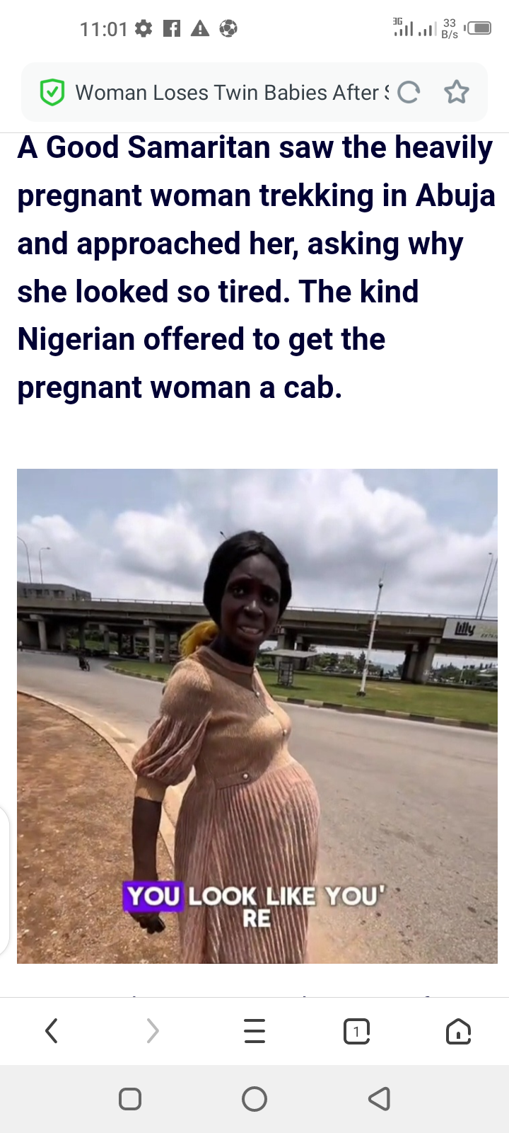 Woman Loses Twin Babies After She Was Seen Trekking While In Labour Over Inability To Pay 28k Delivery Fee (Video) Posted by Samuel on Sat 30th Aug, 2025 – tori.ng Share this news:       A Good Samaritan saw the heavily pregnant woman trekking in Abuja and approached her, asking why she looked so tired. The kind Nigerian offered to get the pregnant woman a cab.  Nigerians have expressed outrage after a pregnant woman lost her twin babies following a gruelling labor, during which she was forced to trek through the streets of Abuja in search of money and a referral letter. A Good Samaritan saw the heavily pregnant woman trekking in Abuja and approached her, asking why she looked so tired. The kind Nigerian offered to get the pregnant woman a cab. However, the pregnant woman told her to give her the money instead so she can find more money and add to it to be able to pay for delivery of her twin baby girls. The pregnant woman explained that the hospital where she was supposed to give birth asked her to bring N28,000 and a referral letter from the health centre where she had registered for antenatal. The health centre had referred her to a hospital that could better handle her situation. The Good Samaritan swung into action and took the pregnant woman to the health centre where it was discovered that she was in active labour. The pregnant woman began crying at this point, lamenting that she has not bought a single baby item. When asked about her husband and why he was not present, she claimed he was ill. The Good Samaritan helped her to get some baby items and the pregnant woman went into the labour ward. Sadly, in an update, she announced that the twins di£d.  The video has sparked outrage. It also led to a conversation about the healthcare system in Nigeria, health insurance, and about adequately preparing for child birth before conceiving. Watch below: