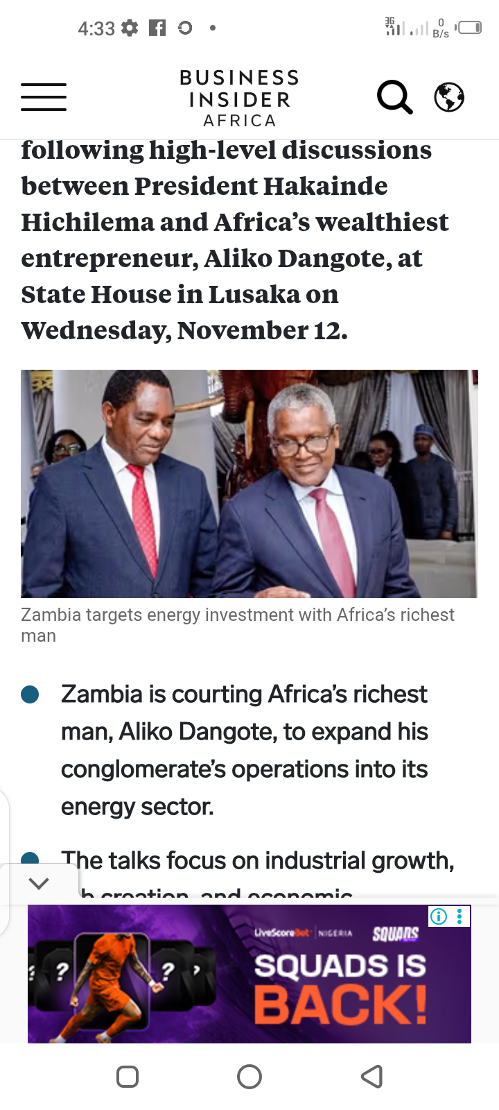 ”  Markets Leaders Careers Lifestyle    ADVERTISEMENT  Local Markets Zambia targets energy investment with Africa’s richest man SEGUN ADEYEMI 13 November 2025 12:39 PM Zambia is positioning itself for a landmark energy sector investment following high-level discussions between President Hakainde Hichilema and Africa’s wealthiest entrepreneur, Aliko Dangote, at State House in Lusaka on Wednesday, November 12.  Zambia targets energy investment with Africa’s richest man Zambia is courting Africa’s richest man, Aliko Dangote, to expand his conglomerate’s operations into its energy sector. The talks focus on industrial growth, job creation, and economic diversification under Lusaka’s reform programme. Dangote’s $19 billion Lagos refinery and pan-African presence signal potential transformative impact for Zambia. President Hichilema praised Dangote’s leadership and pledged a stable, investor-friendly environment for collaboration. ADVERTISEMENT RECOMMENDED ARTICLES  Markets Ghana stays on track with IMF targets as it prepares to end its bailout strong  Markets Norwegian Fund invests $75 million in South Africa’s energy sector  Markets North Africa’s oil giant ships first export of over 600,000 barrels of premium crude from Chadar field The talks centred on expanding Dangote Group operations in Zambia, particularly within the energy sector, “with the objective of fostering job creation, industrial growth and economic diversification,” Hichilema said in a statement on Thursday, November 13. “We reaffirm our government’s commitment to maintaining a stable, transparent and investor-friendly environment that enables the private sector to thrive,” he added, highlighting Zambia’s ongoing efforts to attract foreign investment under its economic reform programme. Dangote, whose conglomerate spans cement, sugar, salt, oil refining, and petrochemicals across more than ten African countries, has been instrumental in driving industrialisation across the continent. ADVERTISEMENT  President Hakainde Hichilema meets Aliko Dangote at State House in Lusaka as Zambia eyes major energy sector investment. [Facebook/ZNBC Today] The group’s flagship cement operations dominate markets in Nigeria, Ethiopia, Tanzania, and Senegal, while its $19 billion (approximately £15.7 billion) refinery in Lagos is set to reshape Africa’s energy landscape. The potential move into Zambia represents a significant milestone for the country’s investment portfolio, signalling confidence in Lusaka’s reform agenda and economic stability. Hichilema lauded Dangote’s leadership as “a testament to the power of vision and determination,” emphasising the government’s readiness to collaborate with the private sector to unlock new growth opportunities. Analysts say Dangote’s entry into Zambia’s energy market could catalyse industrial development and attract further international investment, offering a boost to the nation’s diversification goals and long-term economic prospects.  SEGUN ADEYEMI Segun Adeyemi is a Senior News Reporter at Pulse Nigeria. He has over a decade of experience covering political events, civil societies, military, courts, and metro. Reach him via segun.adeyemi@pulse.ng FOLLOW BUSINESS INSIDER AFRICA     Our newsletter gives you access to a curated selection of the most important stories daily. SUBSCRIBE Don’t miss a thing! Get notifications for important news & events right in your browser ACTIVATE NOTIFICATION ADVERTISEMENT RECOMMENDED ARTICLES  Building smarter systems, Israel Iyonsi advances AI integration across industries  Top 10 Africa’s most powerful militaries in 2025, power, personnel, and budget  Top 10 African countries with the lowest fuel costs in November 2025, priced in US dollars  This November, magnificent leadership conference (MLC) debuts in Abuja with theme “go big”  SEC, Cambridge University & Busha launch landmark digital assets programme in Nigeria  Mali tells Russian media that ‘cowardly’ outside powers are to blame for surge in violence  2 European car giants bringing new luxury cars to South Africa  Kenya announces fresh restrictions for importation of second-hand vehicles  Senegal becomes latest African economy to slip into debt distress after IMF talks stall Markets Leaders Careers Lifestyle Advertise with us Terms & Conditions Privacy Policy  Facebook  Twitter  Instagram  Google News  Newsletter International Editions: INTL AS AT DE ES IN JP MX NL PL ZA © 2025 africa.businessinsider.com ” https://africa.businessinsider.com/local/markets/zambia-targets-energy-investment-with-africas-richest-man/bd7kl54#:~:text=Local%20Markets-,Zambia,-targets%20energy%20investment